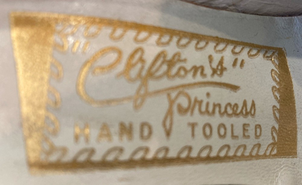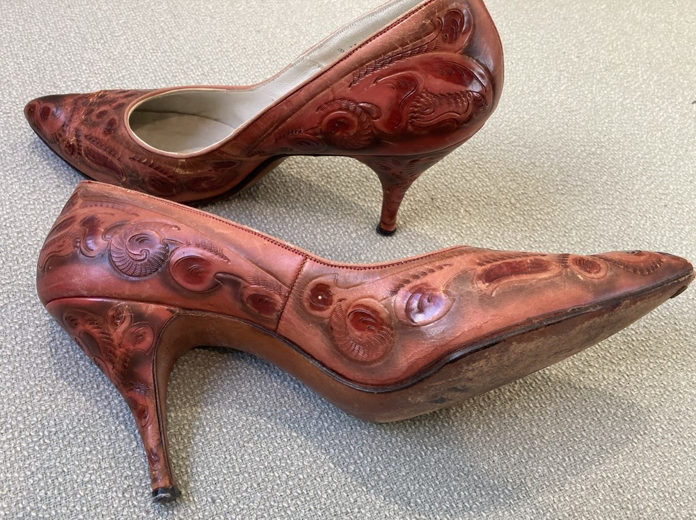 Fabulous vintage mid-century hand tooled leather high heels made by “Clifton’s” Princess in a warm brown with burgundy highlights. In good condition with small scuffs at the tip of the toes and on the right heel. Perfect for parties and costumes!