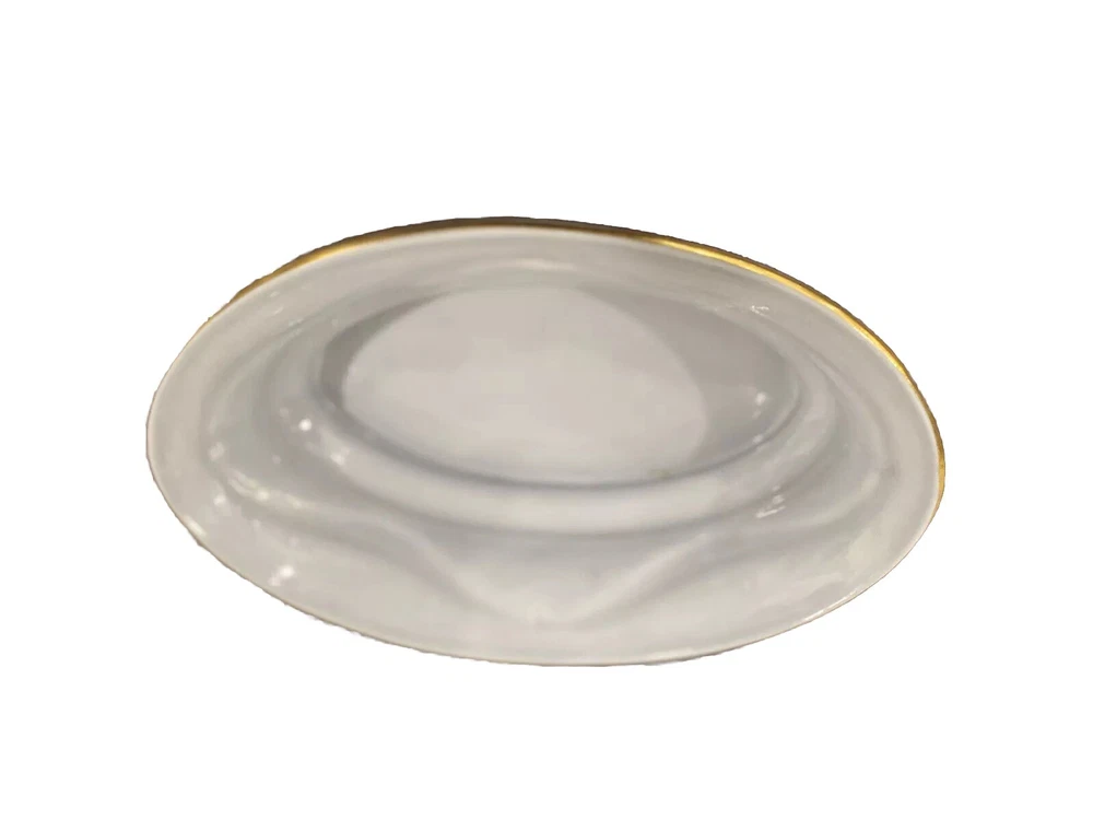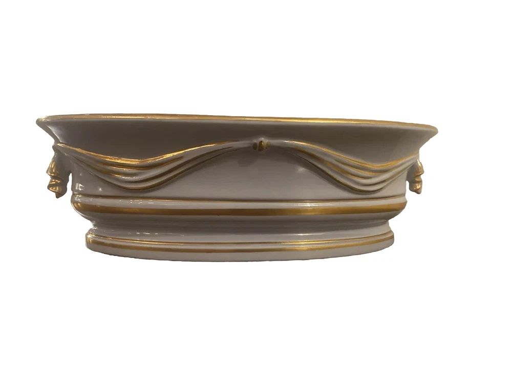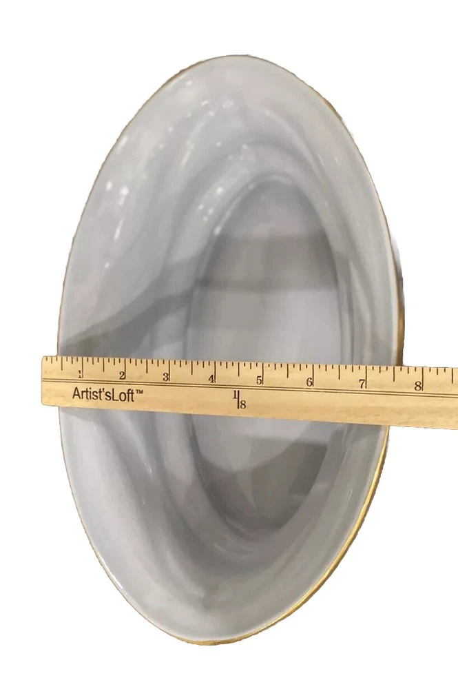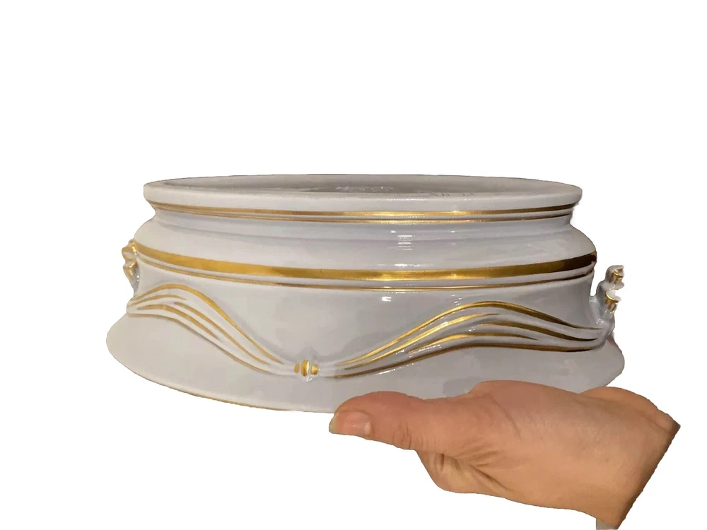 This vintage 1950s oval porcelain pottery decorative bowl features a gorgeous light blue color with gold accents. Very good condition, no chips. Measurements Length: 11 3/4 inches Width: 7 1/2 inches Height: 3 1/2 inches