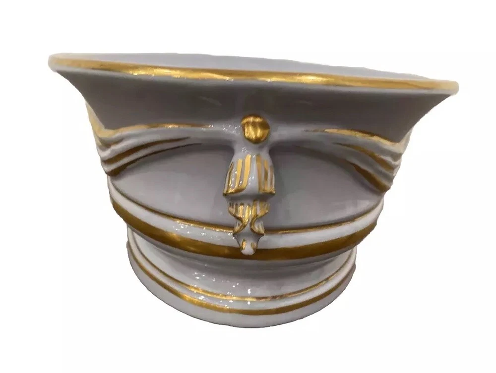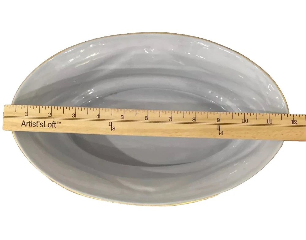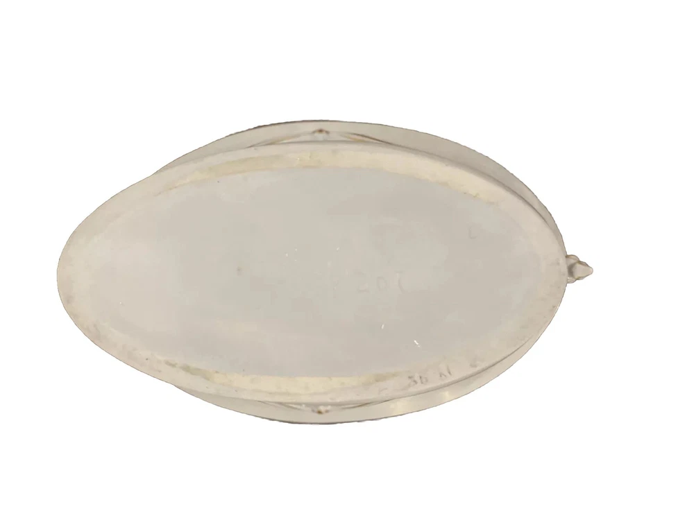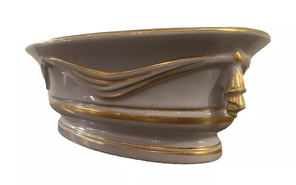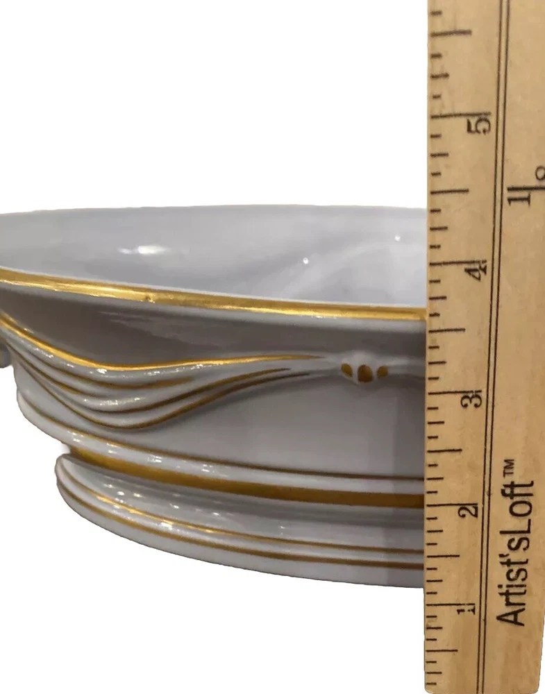 This vintage 1950s oval porcelain pottery decorative bowl features a gorgeous light blue color with gold accents. Very good condition, no chips. Measurements Length: 11 3/4 inches Width: 7 1/2 inches Height: 3 1/2 inches
