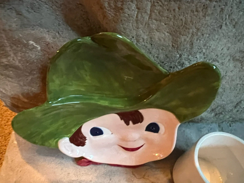 This is a vintage 1950s cup and saucer set featuring an Elf Cowboy design, hand-painted on ceramic pottery. The set includes a cup and a saucer in multicolor hues. The production technique used is pottery, with a painted backstamp indicating the origin and authenticity. This charming and unique set would make a delightful addition to any collection of decorative cookware or dinnerware from the mid-20th century.