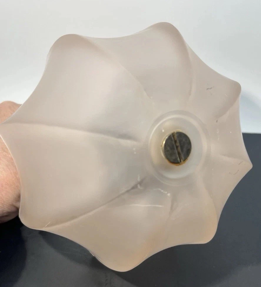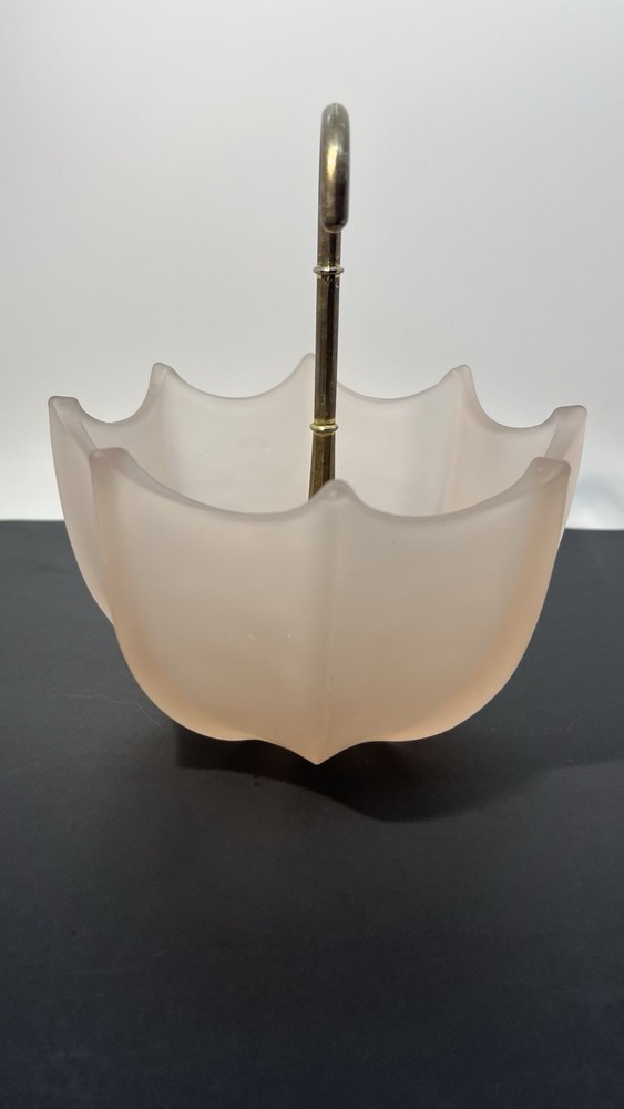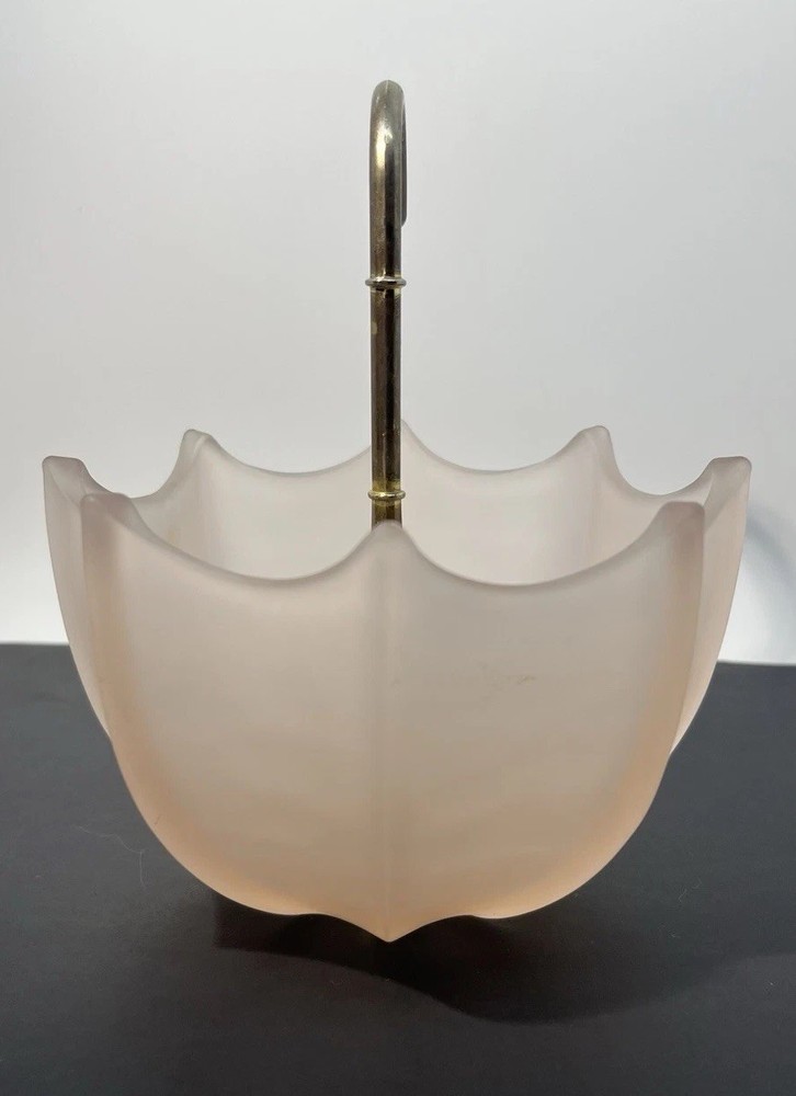 Height 6.5”, diameter 5.5” Add a touch of vintage charm to your home decor with this beautiful Fenton pink frosted satin glass umbrella trinket dish. The dish features a unique umbrella shape, making it a perfect addition to your art collection. The decorative handle allows for easy movement, while the solid pattern and satin finish provide a classic, elegant look. This one-of-a-kind figurine was produced in the 1950s in the United States and is a testament to the quality of art glass from that era.