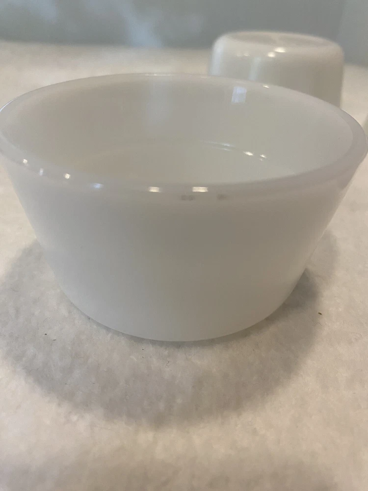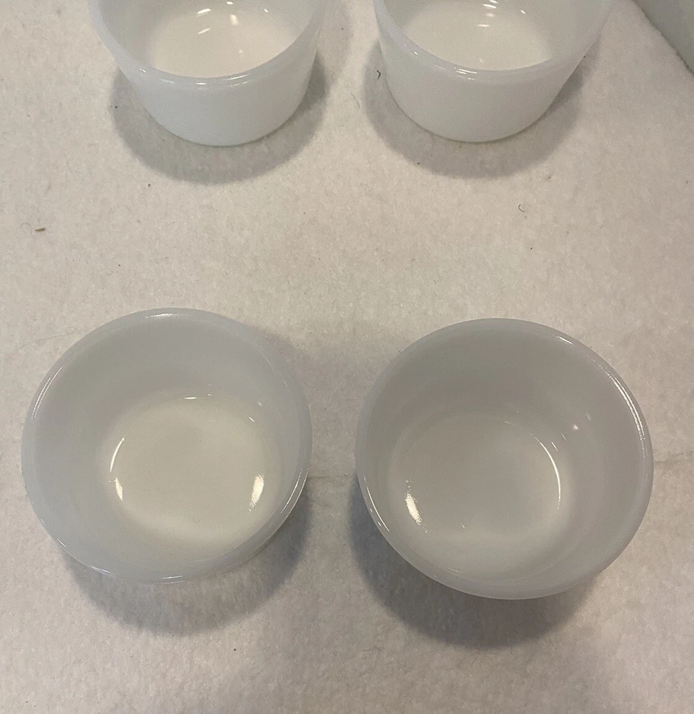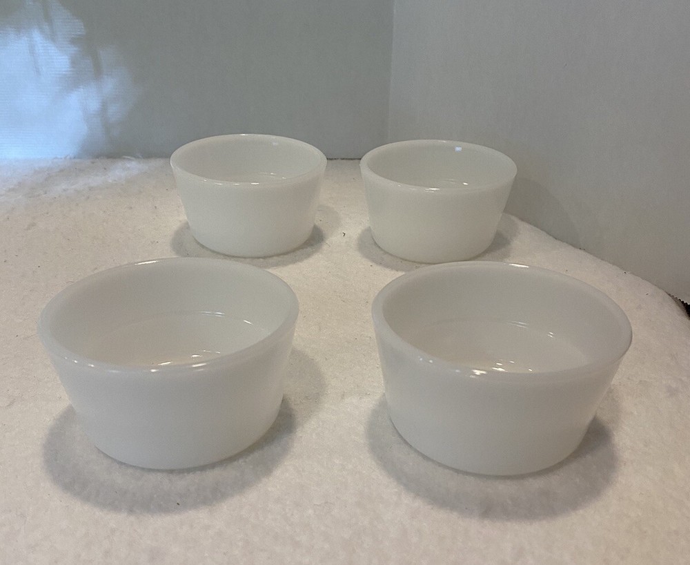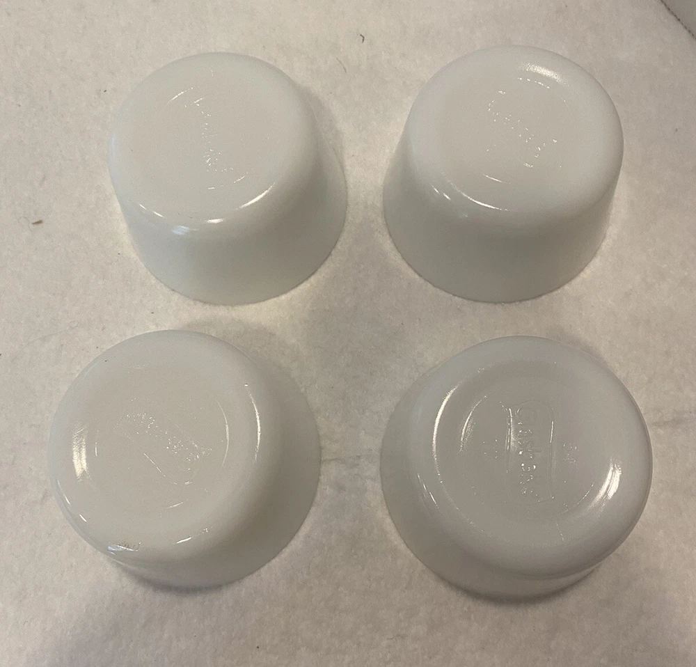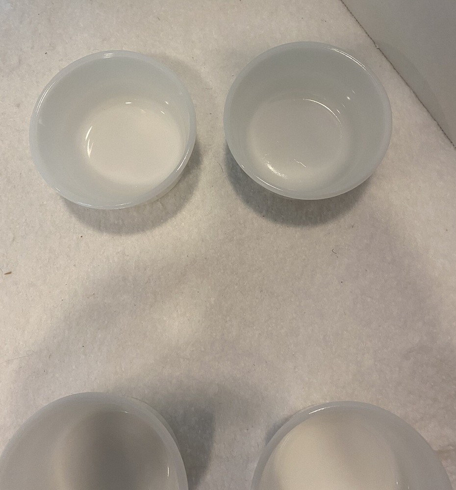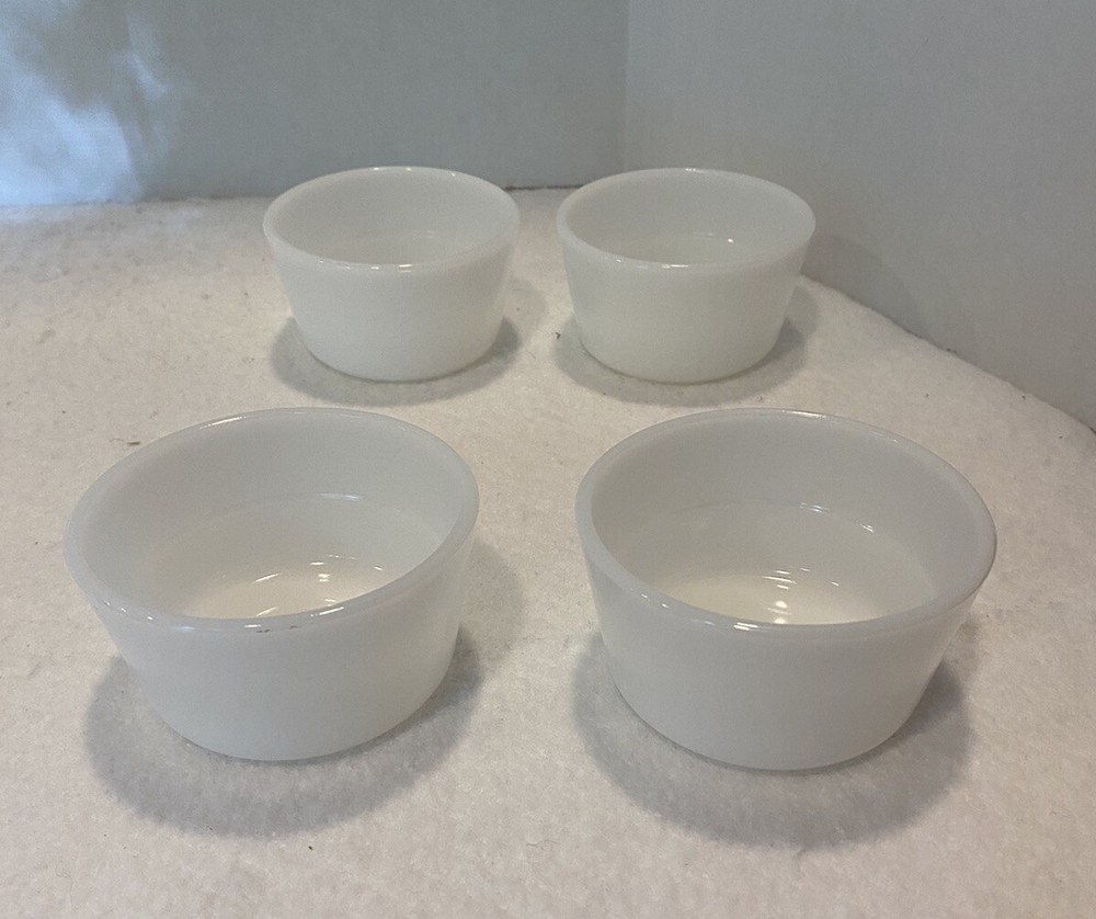 Set Of 4 Vintage 1950s Glasbake Milk Glass Custard Cups Bowls Ramekins EUC There are a couple small marks on the bowls, but no chips or cracks. Bowls are in excellent preowned, vintage condition. Please see pictures for full description. Set #1