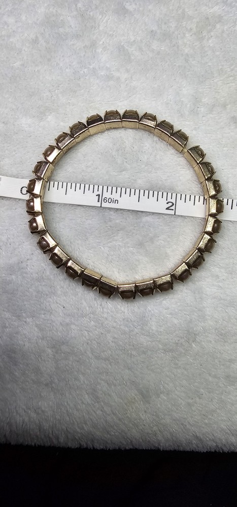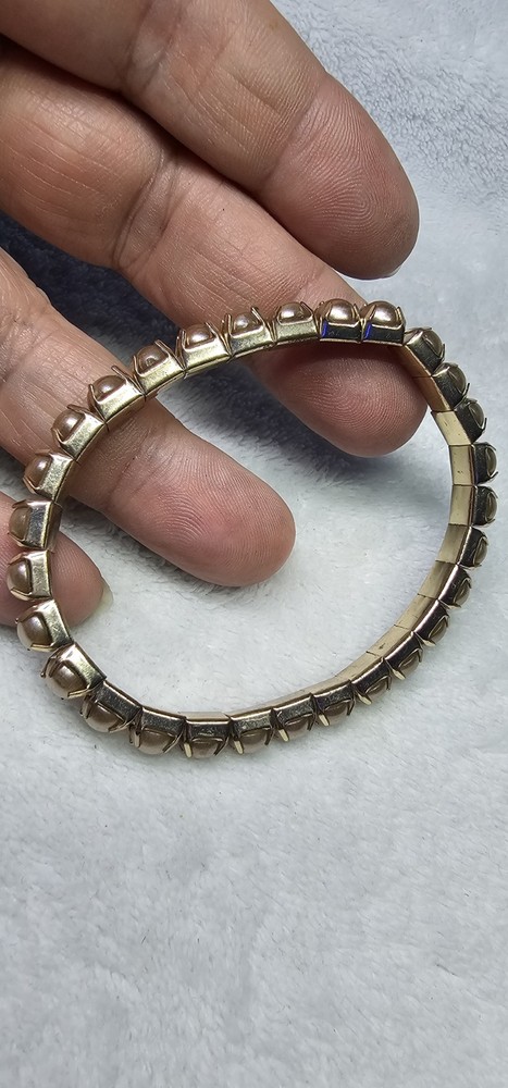 This fabulous vintage stretch bracelet from the 1950s features prong-set domed caps in a geometric square-link design. The bracelet is crafted in a gold-tone base metal with a classic expansion fit, allowing it to stretch and conform to your wrist comfortably. A beautiful mid-century statement piece, perfect for stacking, retro looks, or collectors of vintage costume jewelry. 🔹 Details: Era: Circa 1950s–1960s Fit: Stretch (approx. 2.25" inner diameter unstretched) Material: Gold-tone base metal Style: Domed rivet / faux pearl caps in square prong settings Condition: Very good vintage condition; minor surface wear consistent with age 💫 Ships carefully packaged and tracked.
