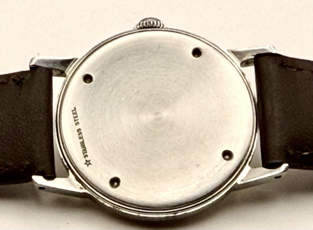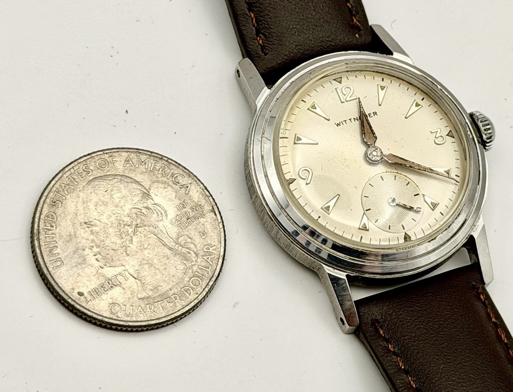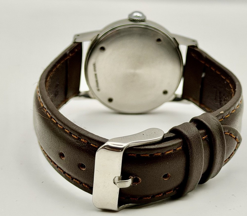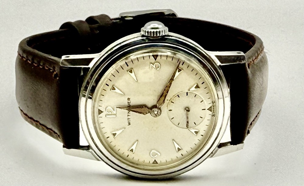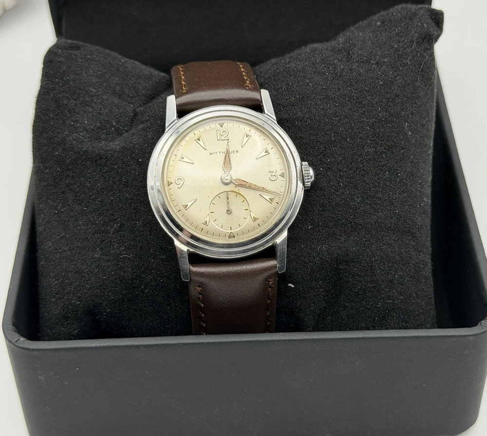 The product is a vintage 1950s Wittnauer men's wristwatch sets and runs keeping time with a 17 jewel manual wind 10SB cal movement. This classic timepiece features a stainless steel case in with a new two-piece 18mm black leather strap and a silver tone buckle The watch has a round shape with a 31.5mm case size, a 18mm lug width, and a left-handed design.this vintage Wittnauer watch is a timeless piece with a polished finish, perfect for any man looking to add a touch of elegance to their accessory collection. The watch will come in a new jewelers box ready to wear or gift a stylish and functional accessory for any man's wrist.