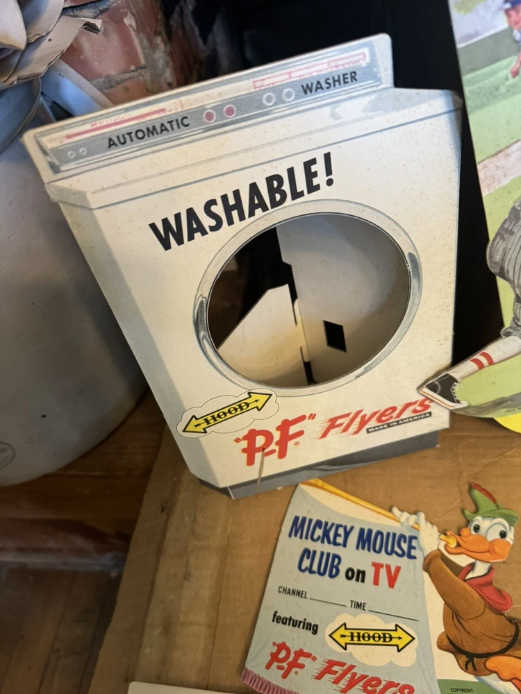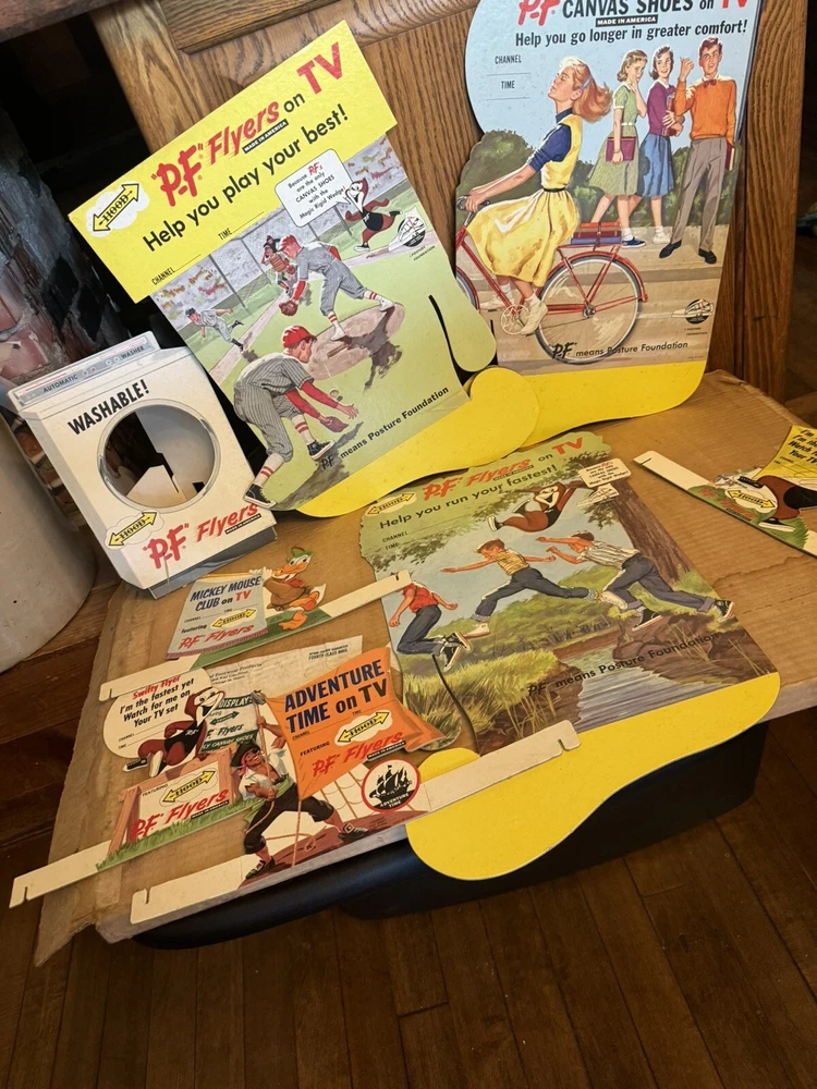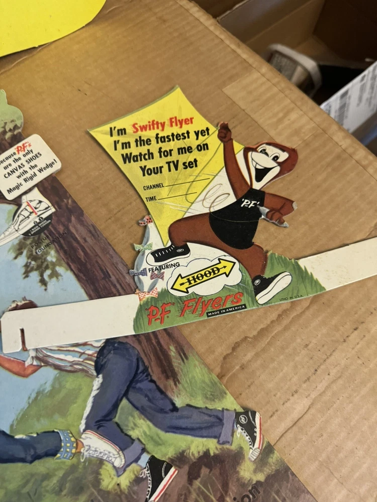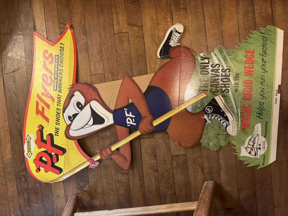 Here's a vintage 1950s PF FLYERS sneakers store display sign that will add a touch of nostalgia to your collection. This stand-like sign features the iconic PF FLYERS brand and is an original piece from the United States. The sign's theme is shoes, and it is a perfect addition to any shoe-themed collection. The sign is in great shape and is a unique piece that will surely catch the eye of any collector. It is a perfect way to showcase your love for vintage shoes. This item is a must-have for any sneaker enthusiast and is a rare find. Don't miss out on the opportunity to add this original PF FLYERS store display sign to your collection. Lots of displays The large display is over 3 feet tall! Part of a collectors/dealers estate. Thousands of antiques and collectibles to sell. Not a pet free home, no extra charge for hair, we either bought it that way or furnished it ourselves. International sales through global shipping program only. Heavier larger boxes may be shipped Fed Ex or UPS to save on shipping costs. USPS no longer ships any book or magazine that have advertising thru media Mail, sorry for this inconvenience. RETURNS: We accept ANY item back within 30 days of the original purchase date for a full refund. All returns must come back in the same condition they were shipped out and arrived in. Buyer pays return shipping costs. RETURNS: Due to the nature of antiques and collectibles some imperfections are a natural part of the beauty of these objects. We describe as good as possible. All our items are very good quality. We do our best to pack carefully, but accidents happen! FEEDBACK: We aim to earn positive 5 star feedback for every item. If you are happy with your purchase, please take a minute to leave a positive 5 star feedback. If you have any issues with your purchase, please contact us directly using ebays message service to resolve the issue so that we can earn your positive 5 star feedback. We will be sure to do the same for you. Thank you for viewing my listing. Have a blessed day