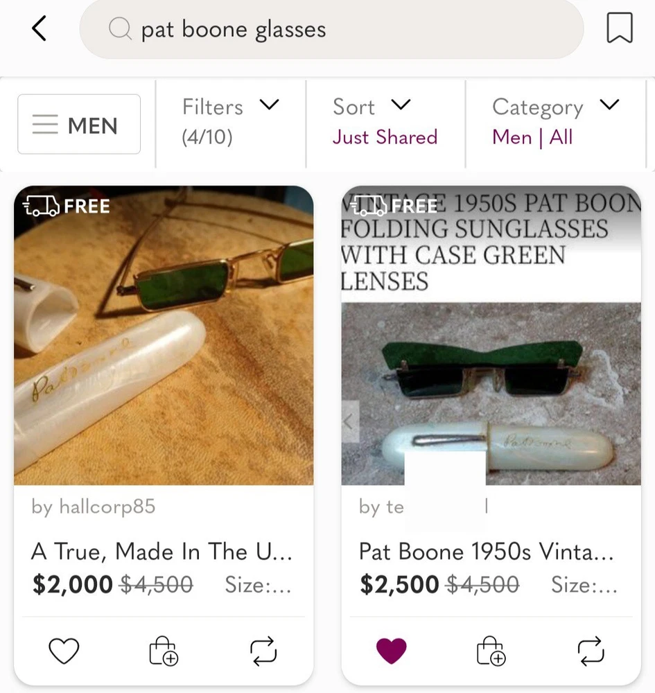 Picked up way back in the day, Antiqueing with my Grandma Ruby and Dad This set here is a definite, true pair of Made In The U.S.A., not a remake, Pat Boone Green Lens Folding Sunglasses! This set is accommodated and fit with their original nose and ear pads. Sports a Mother of Pearl Case and made to fit within your sports coats' pen shaped pocket. The attachable style visor these glasses can rock can easily be found online. I've only found actual, not remakes, Circa 60 1950's online in other places twice. One set for $4500, another set marked down to $2500. This set can truly make any actual collector or enthusiasts' dreams come true! You can never lose with a Lennon!