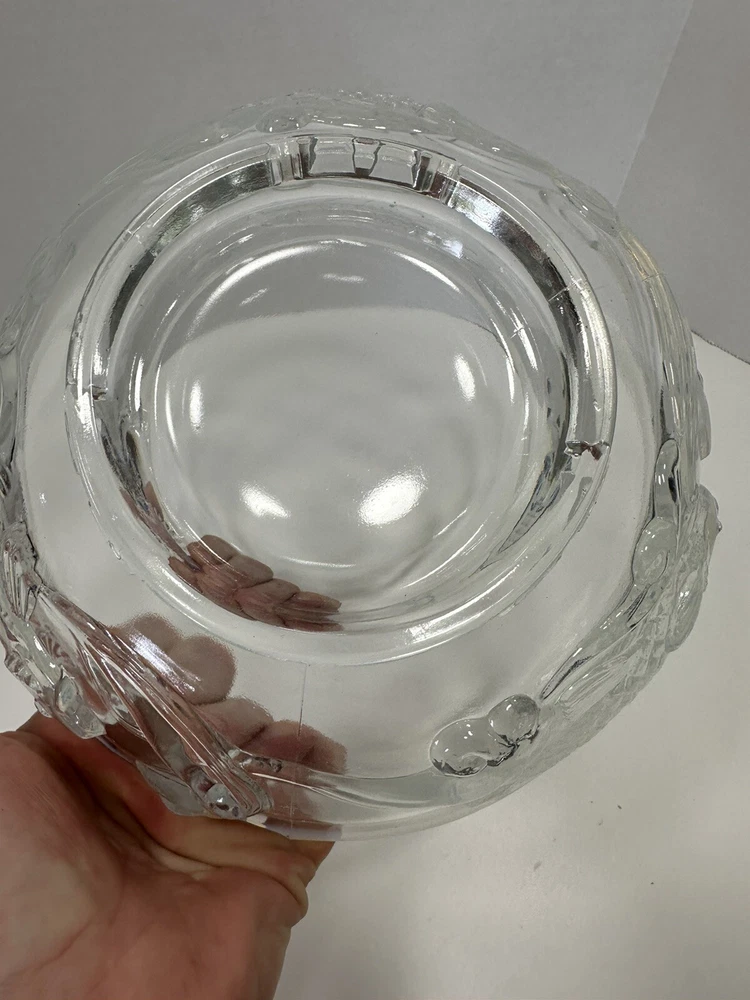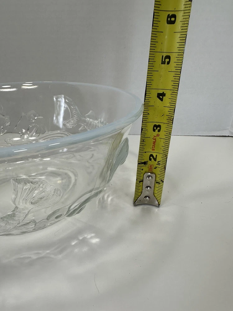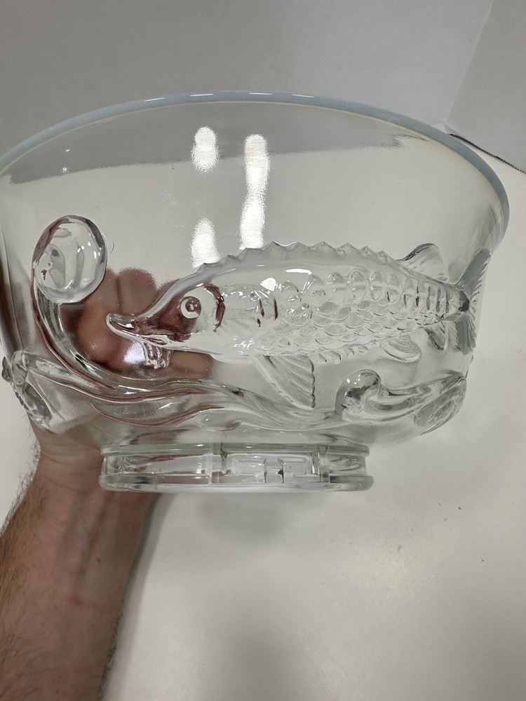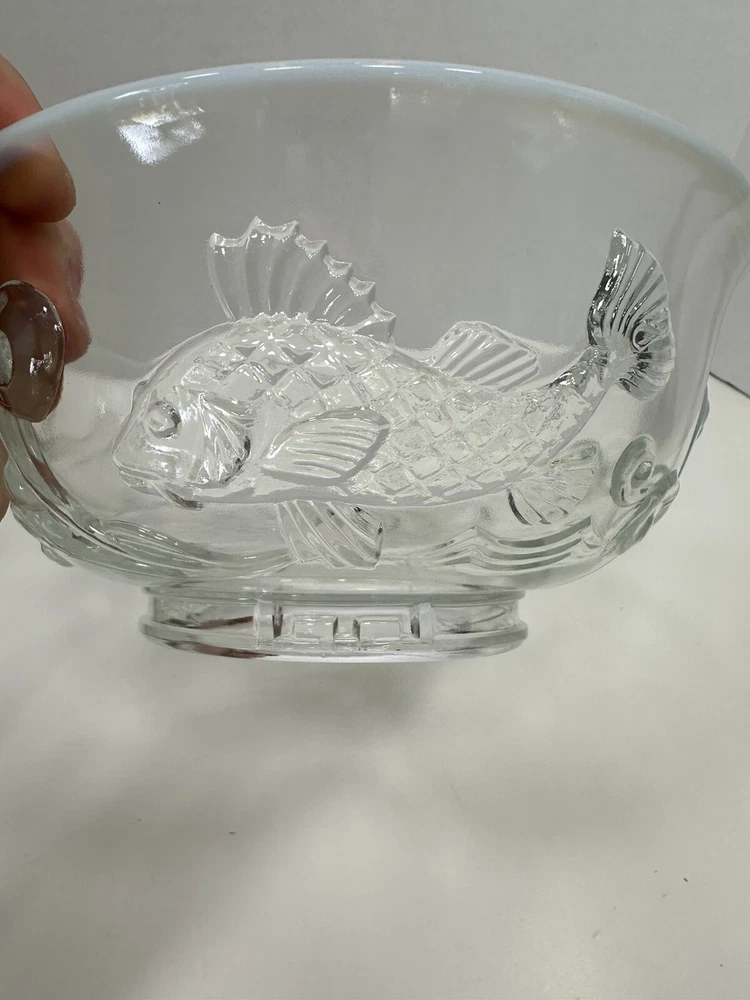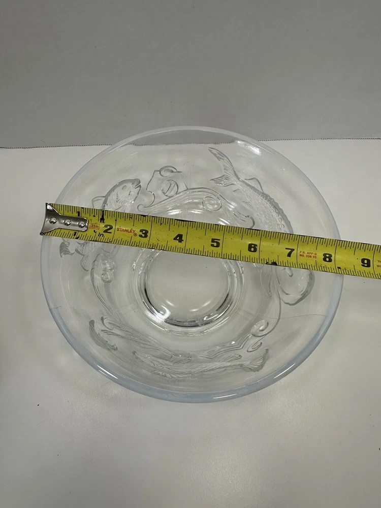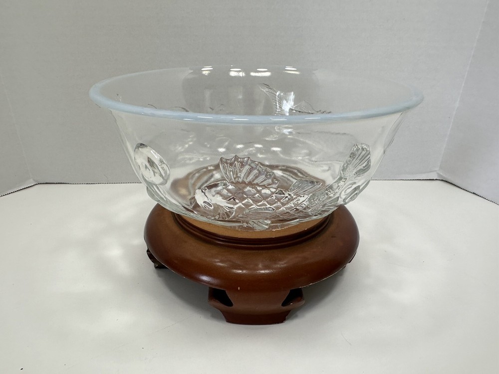 Comes with wooden stand. A couple flea bites on the bottom rim. No cracks or chips. This Bowl was designed as a special Christmas edition and was sold for the 1950 Christmas season. The three fish represent, Carp, perseverance. Perch, wealth and Sturgeon representing distinction. Ted Mehrer went on to work for Fenton Glass Company. There are light scratches on the interior from use but no chips or damage. It appears this is a Ted Mehrer Verlys of America "Round Fish Bowl" mold struck by Fenton or Holophane - most likely Holophane as it is in french opalescent.