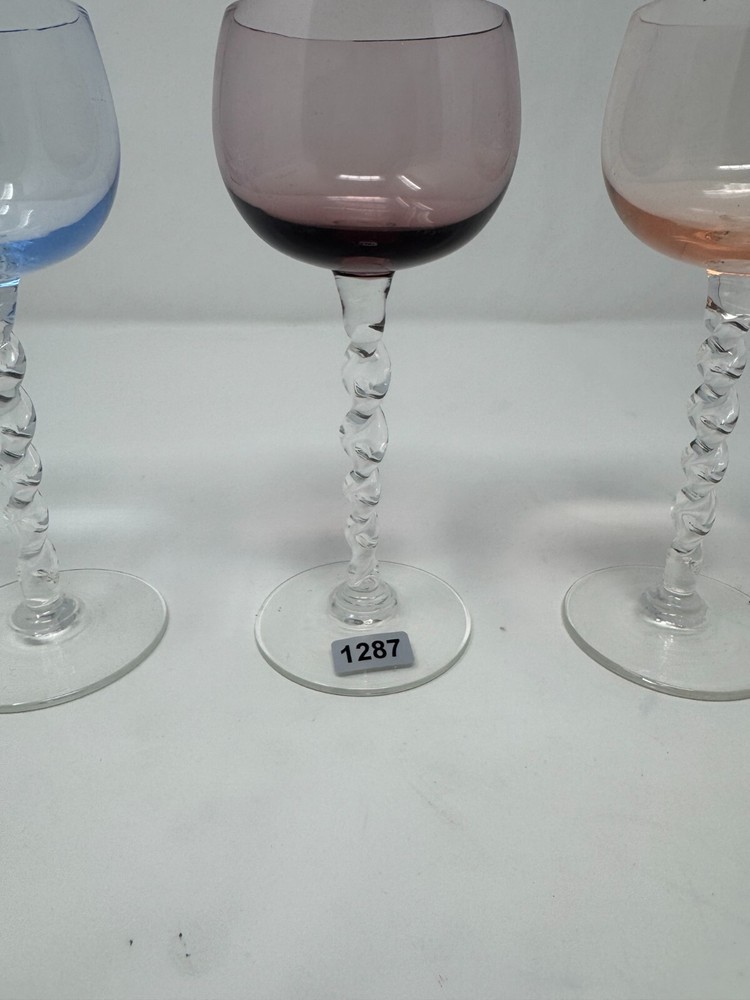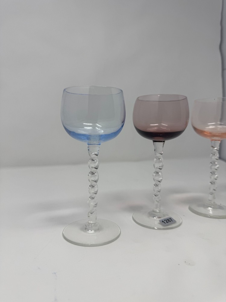 Bring a touch of vintage sophistication to your home bar with this set of 4 hand-blown twisted stem cordial glasses , each topped with a beautifully tinted bowl in shades of blue, amethyst, peach, and aqua . These glasses showcase a mid-century modern flair with their delicate, artful stems and vibrant color palette. Perfect for serving aperitifs, dessert wine, or liqueurs, these glasses also make a charming addition to any vintage glassware collection or an eye-catching decor accent. Lightweight yet sturdy, they feature a clear spiral stem that adds a tactile and visual twist to each piece. Whether you're entertaining guests or curating your vintage display, this set captures timeless elegance and artisan craftsmanship. ?? Important Notice: This product must be installed by a licensed professional in accordance with all applicable codes and regulations. Seller assumes no responsibility for installation, application, or maintenance of the product. Buyer agrees to determine the suitability of the product for their intended use and assumes all risk and liability associated with its use. Improper installation or use may result in serious injury, death, or property damage. By purchasing this item, the buyer acknowledges they have read, understood, and agree to these terms.