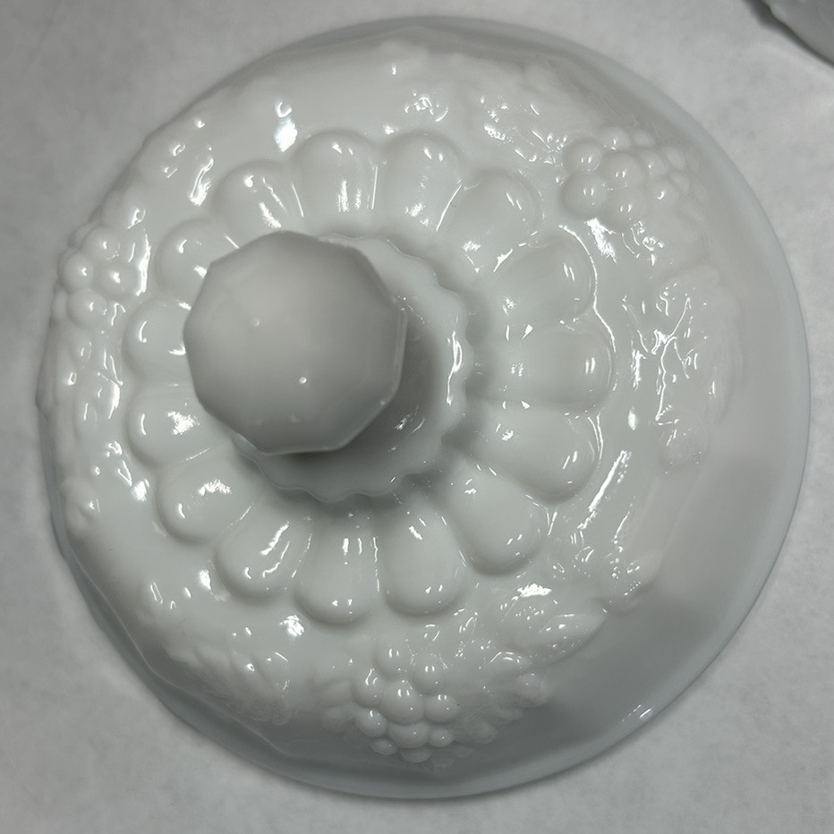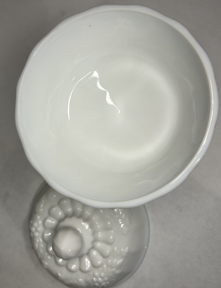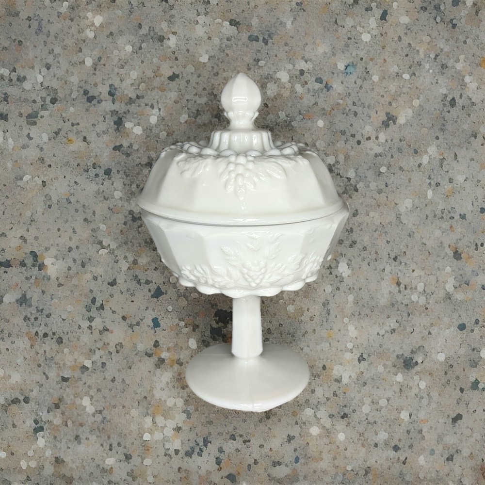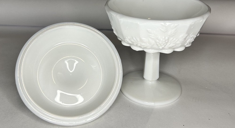 Model:Grape PedestalItem Weight:1 pound, 10 ouncesColor:WhiteStyle:Mid-Century ModernProduct Line:Paneled GrapeCountry/Region of Manufacture:United StatesPackaging:UnboxedOriginal/Licensed Reproduction:OriginalOrigin:Jeannette, PennsylvaniaFeatures:Decorative, Lid IncludedNumber of Items in Set:2Theme:grapesManufacturer Warranty:NoneNumber of Compartments:1Care Instructions:Hand Wash OnlyMPN:does not applyFinish:GlossyHandmade:NoProduction Technique:Fused GlassProduction Style:Milk GlassBackstamp:Impessed on the inside of the lidType:Candy DishAntique:NoItem Height:7 inYear Manufactured:1950Shape:RoundMaterial:Glass, Milk GlassTime Period Manufactured:1950-1959Vintage:YesPattern:Paneled GrapeBrand:WestmorelandItem Diameter:4 1/2 in