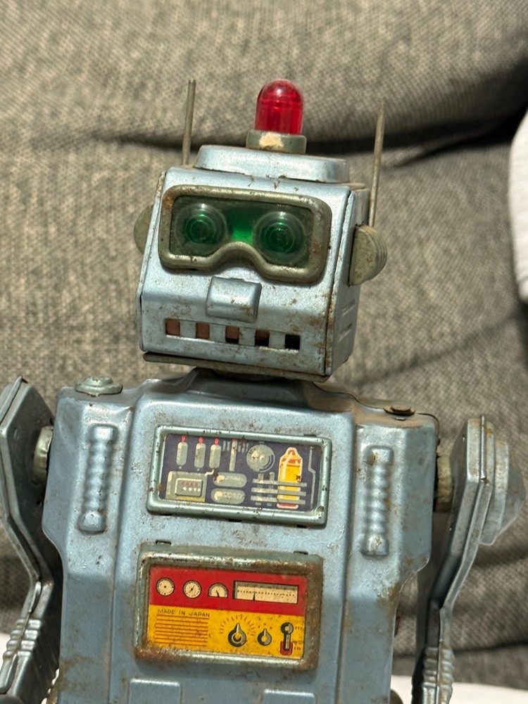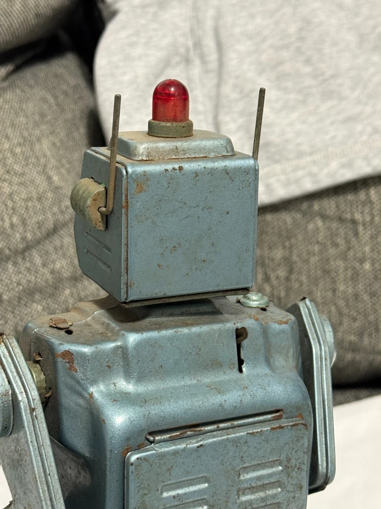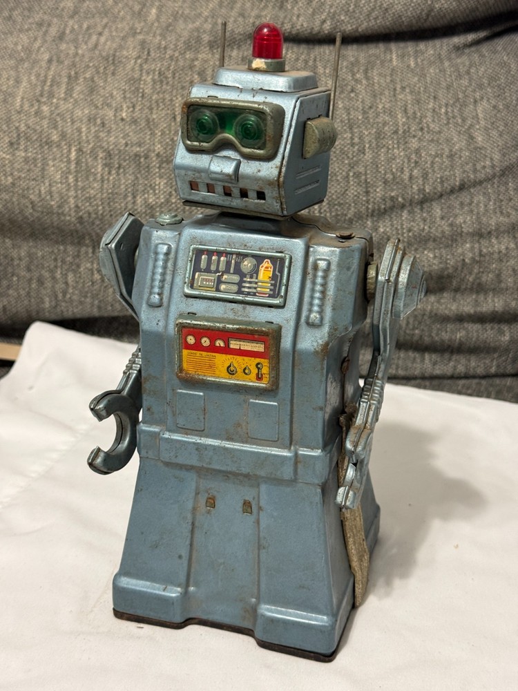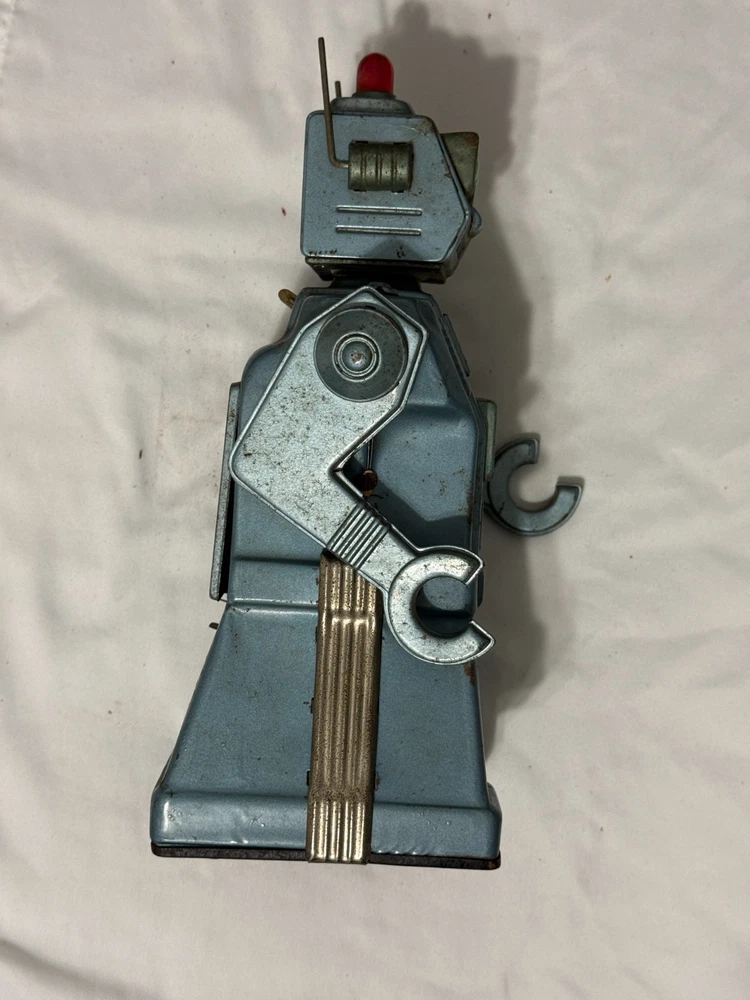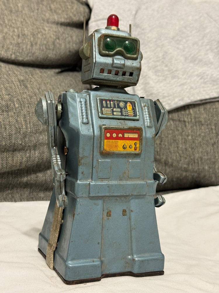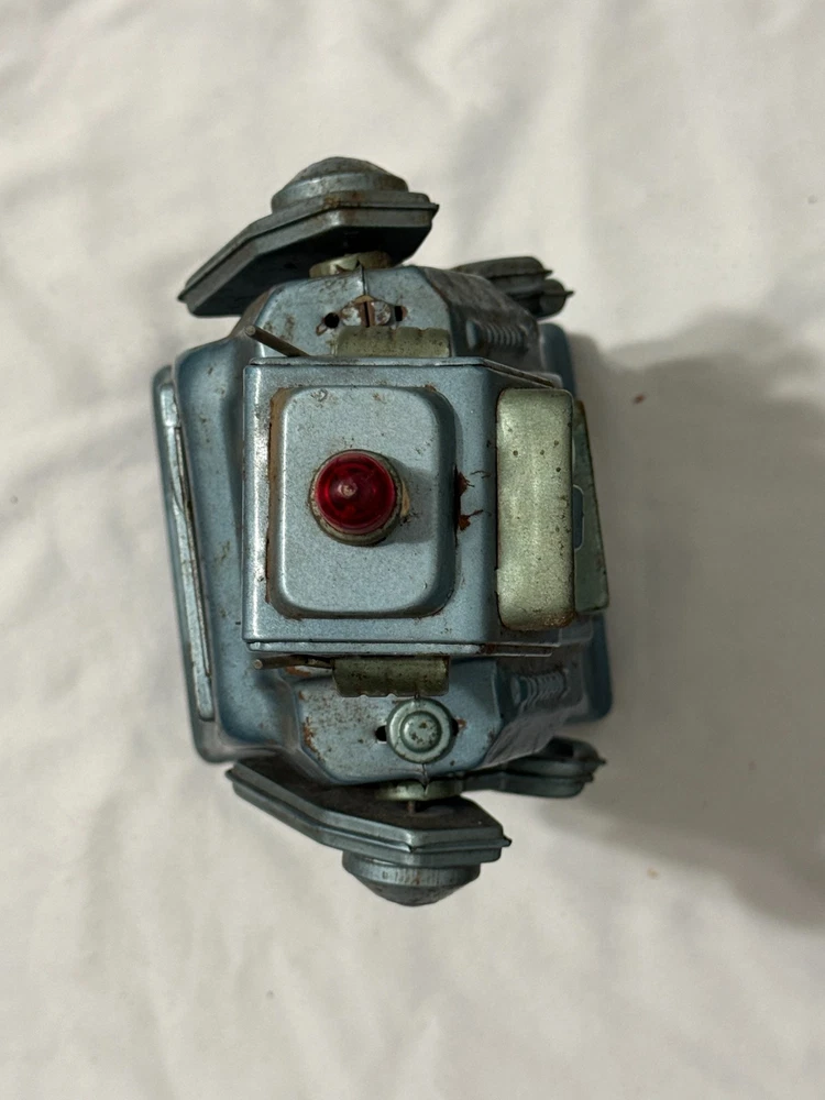 Offered for sale is an authentic vintage Japanese tin robot manufactured by Yonezawa in the 1950s , a highly collectible piece from the golden era of Japanese mechanical toys. This robot features classic mid-century design with lithographed control panel details, green eye lenses, red dome head light, and articulated arms including a claw-style hand. A strong example of early post-war Japanese tin toy production. Key Details: Brand: Yonezawa Origin: Japan Period: 1950s Material: Lithographed tin Markings: “Made in Japan” visible on chest Mechanism: Battery-operated (not tested) Condition: Untested – no battery test has been performed, functionality unknown Shows age-related wear , including surface scratches, oxidation, and minor paint loss Structurally solid with good display presence Original components appear intact Important Note: This item is sold as-is , as a collectible display piece. Due to its age, no guarantee is made regarding operation. Why This Piece Matters: Yonezawa robots from this era are increasingly scarce and highly sought after by advanced collectors of Japanese tin toys. The design, proportions, and surviving original parts make this a strong candidate for both display and restoration. Shipping & Handling: Carefully packed to ensure safe delivery International shipping available