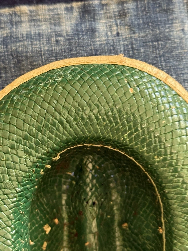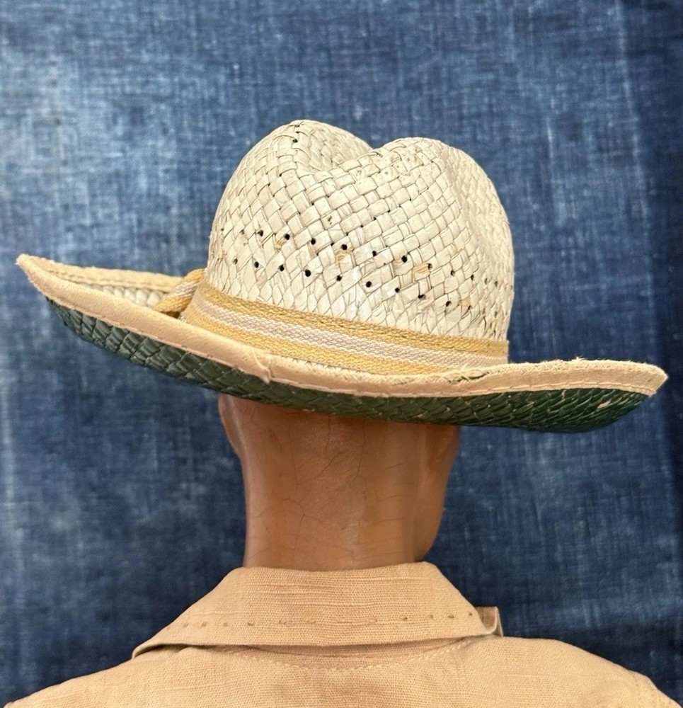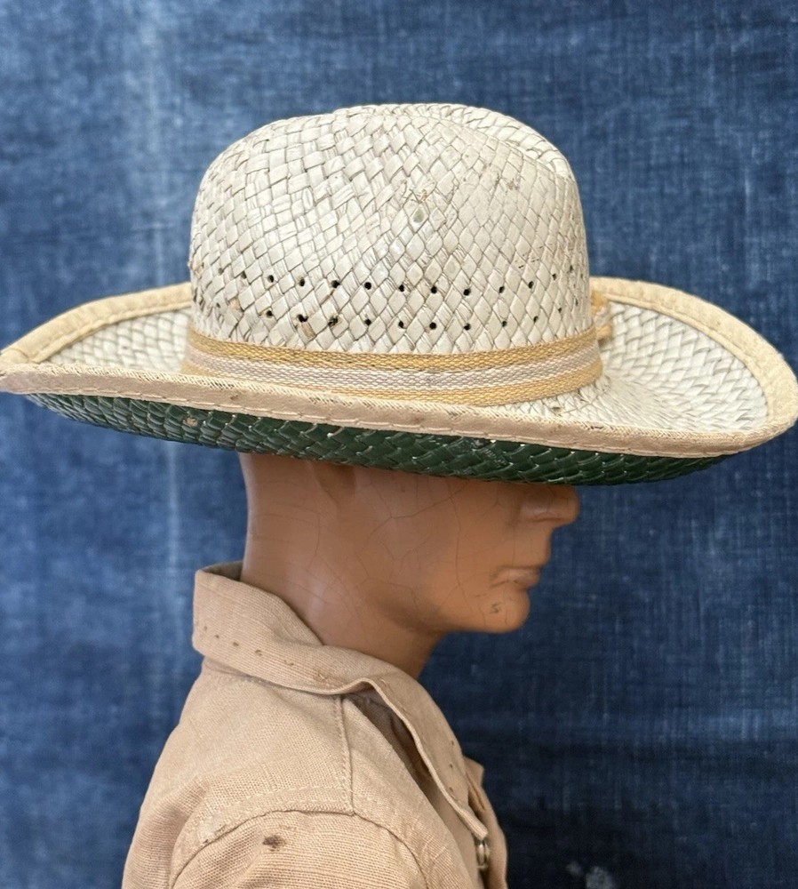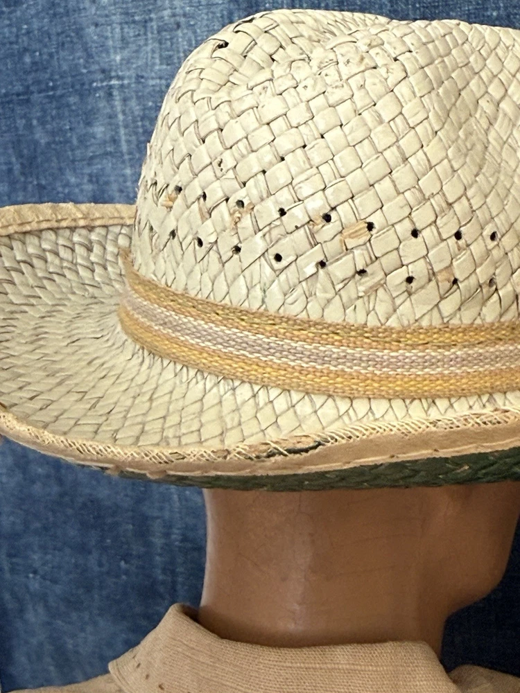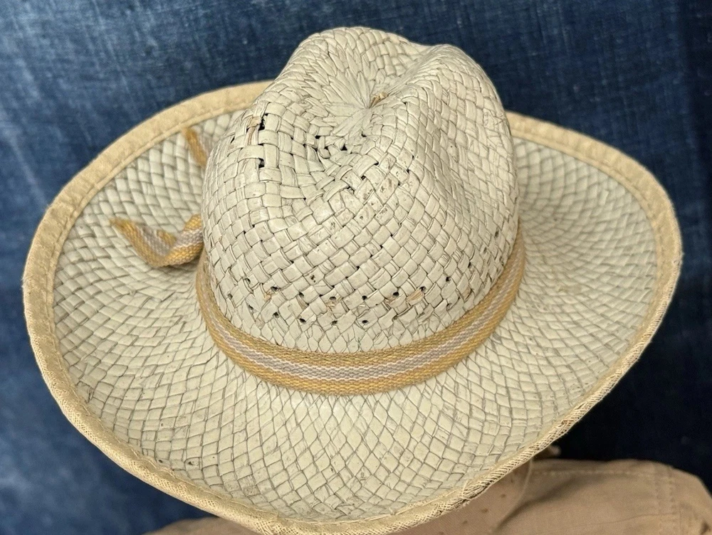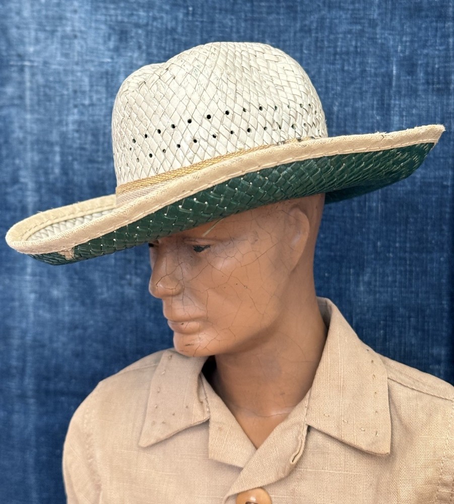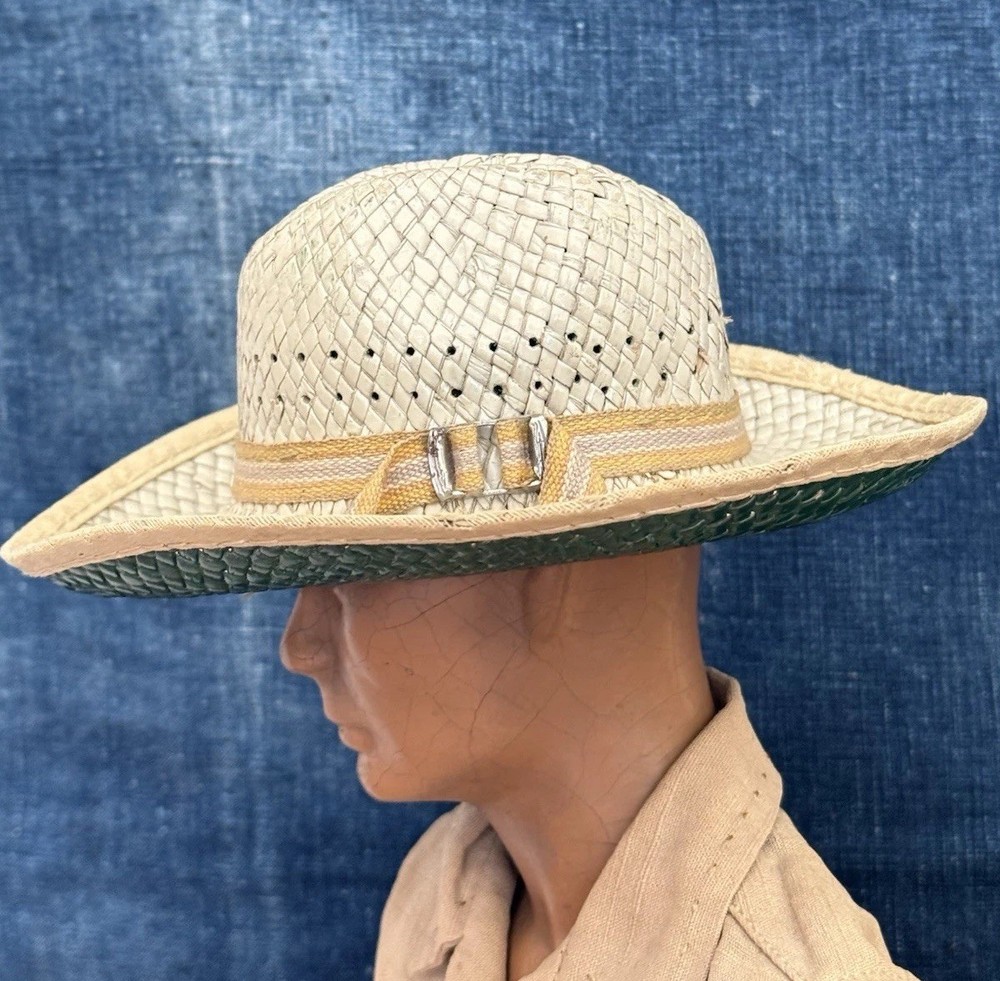 Charming and neat, vintage 1950s or the latest, early 1960s, small sized, salesman sample cowboy hat. The hand painted straw with, the cloth buckled trim, gives the hat, fun details. Offering free USPS Ground Advantage Shipping! It’s in good, used condition with some flaws, mainly some minor wear, along the front, edge brim of the hat, as well as other places. It measures 2” inches tall. The brim measures 5” 1/2 wide by 6” inches long. The depth is 2” inches deep. Inside of the hat, measures 2” by 3” inches wide. No brand markings, unfortunately, but most likely made for the North American retail market. Please note the paint loss on the front of the hat, as shown in the photos. The hat buckle is made of silver plated brass. Selling as is/as found, because of the noted flaws and condition. Makes a wonderful addition to your vintage Western Wear and advertising memorabilia. Displays wonderfully. Thanks for your consideration! ( figure not for sale )