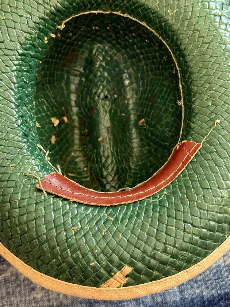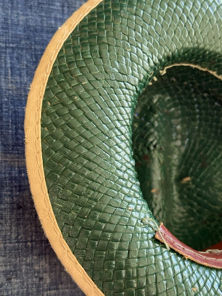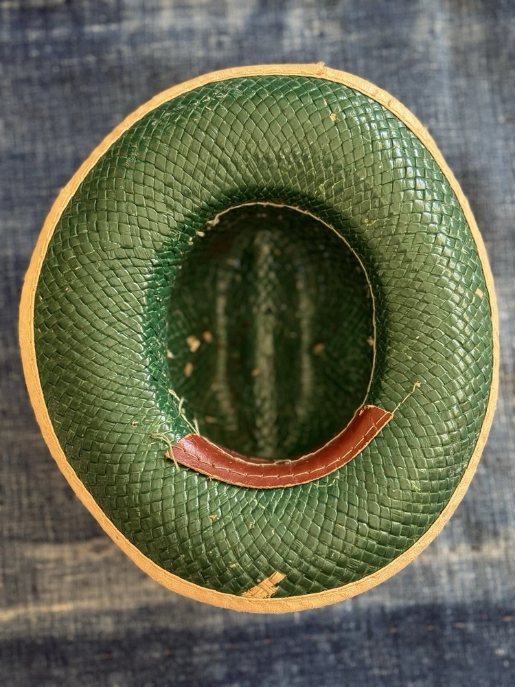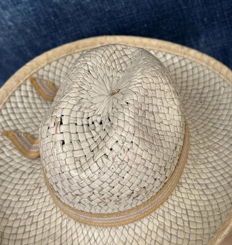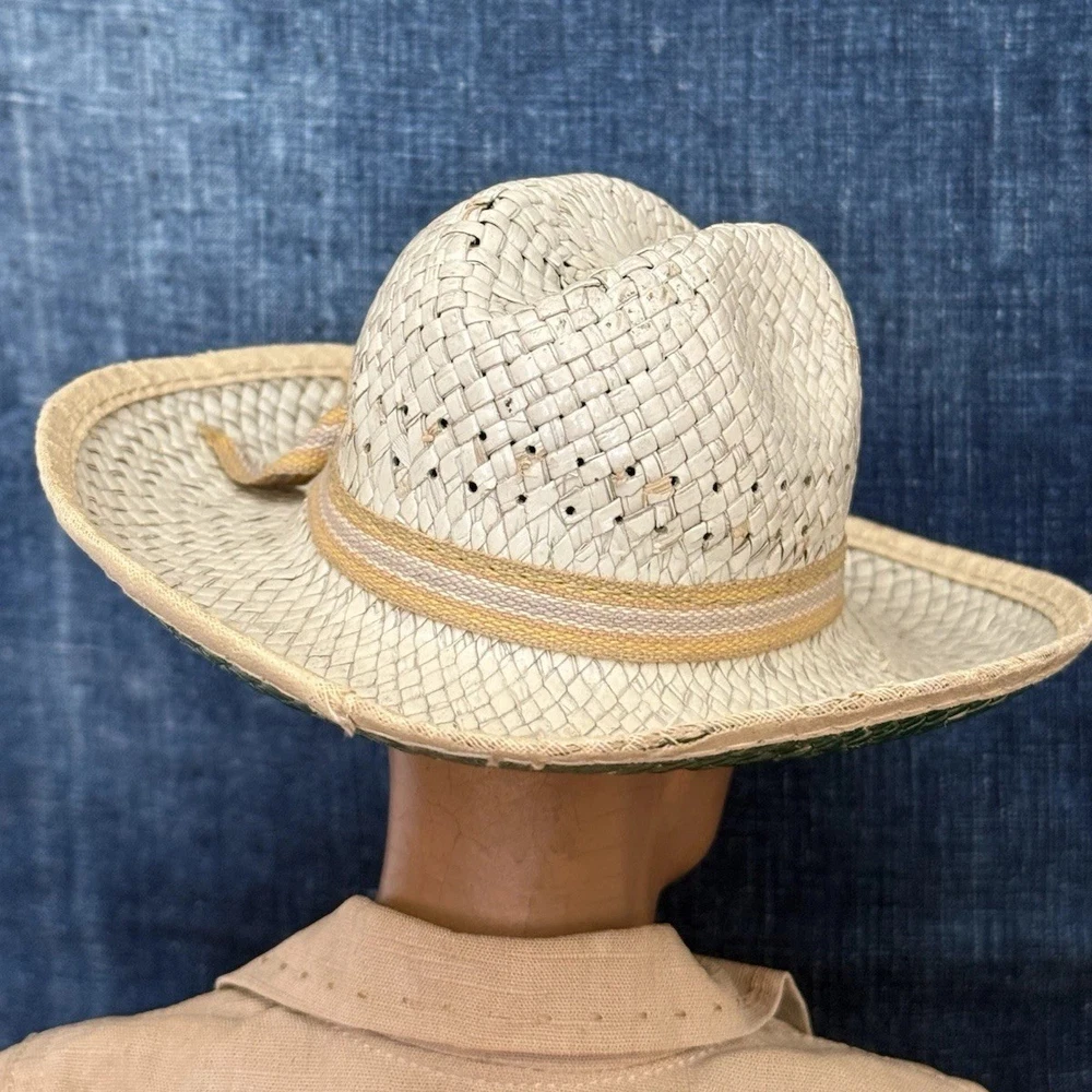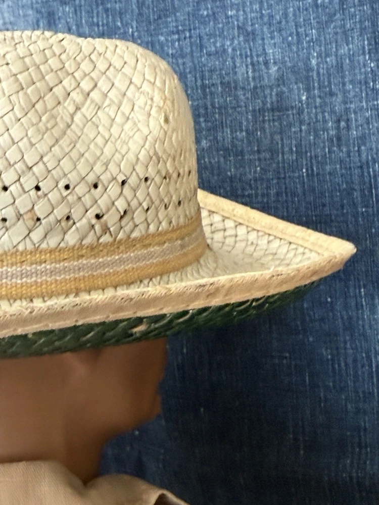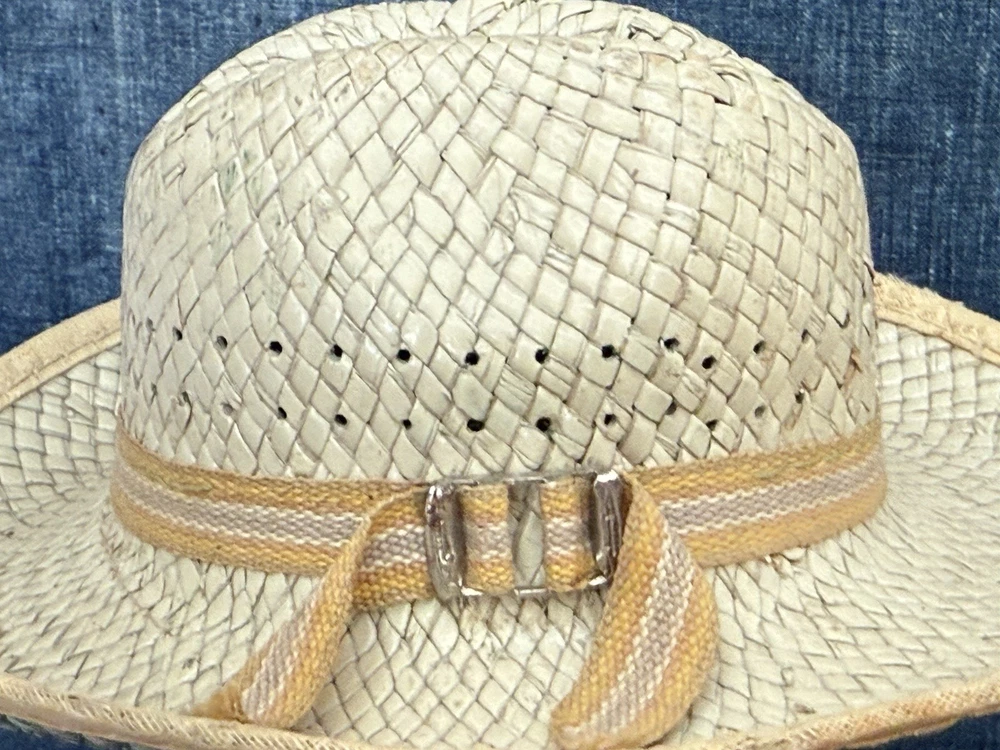 Charming and neat, vintage 1950s or the latest, early 1960s, small sized, salesman sample cowboy hat. The hand painted straw with, the cloth buckled trim, gives the hat, fun details. Offering free USPS Ground Advantage Shipping! It’s in good, used condition with some flaws, mainly some minor wear, along the front, edge brim of the hat, as well as other places. It measures 2” inches tall. The brim measures 5” 1/2 wide by 6” inches long. The depth is 2” inches deep. Inside of the hat, measures 2” by 3” inches wide. No brand markings, unfortunately, but most likely made for the North American retail market. Please note the paint loss on the front of the hat, as shown in the photos. The hat buckle is made of silver plated brass. Selling as is/as found, because of the noted flaws and condition. Makes a wonderful addition to your vintage Western Wear and advertising memorabilia. Displays wonderfully. Thanks for your consideration! ( figure not for sale )