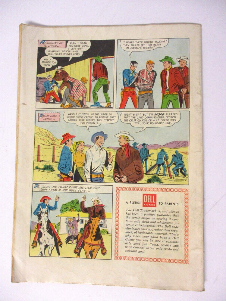 Vintage Dell Comics - The Flying A's Range Rider #11, Dell Sept-Nov. 1955 Western Nice looking front cover does have some creases and wear. Bump at about 7:00 to magazine. Back cover, has small tear at 9:00. Insides nice, no writing inside. I'm not a comic guy, so trying to describe these comics best I can. I just bought a bunch of comics, late 1940s into the 1950s. See my other comics for sale, all with $9.95 starts, will combine shipping.