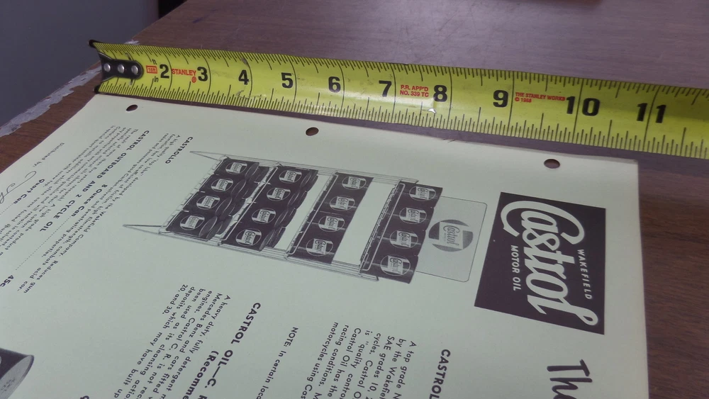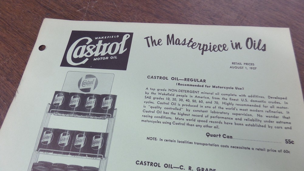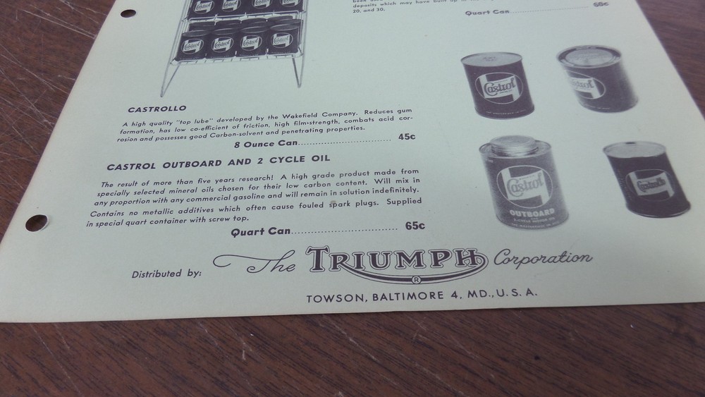 Please Click Here to check out the thousands of other parts listed in my Store Up for your consideration is a Vintage 1957 Castrol Oil Triumph Dealer Retail Price Sheet NOTE: Discolored as Seen in Photos. Shipping stated is for the Lower 48 US States via United States Postal Service. Hi/AK/PR/APO AP may be higher. I ship worldwide via US Mail and will combine shipping whenever possible. I Strive to Provide a "5 Star Transaction". Please contact me prior to leaving feedback if we did not provide "5 Star Service". I invoice International buyers within 48 hours of auction close and charge only actual shipping costs thru US Air Mail. All Sales are Final unless item is misrepresented. Location: BM7-17A