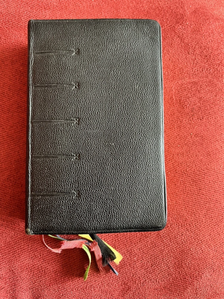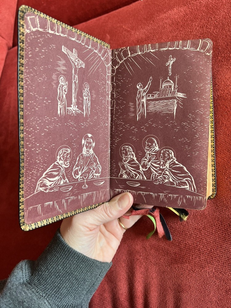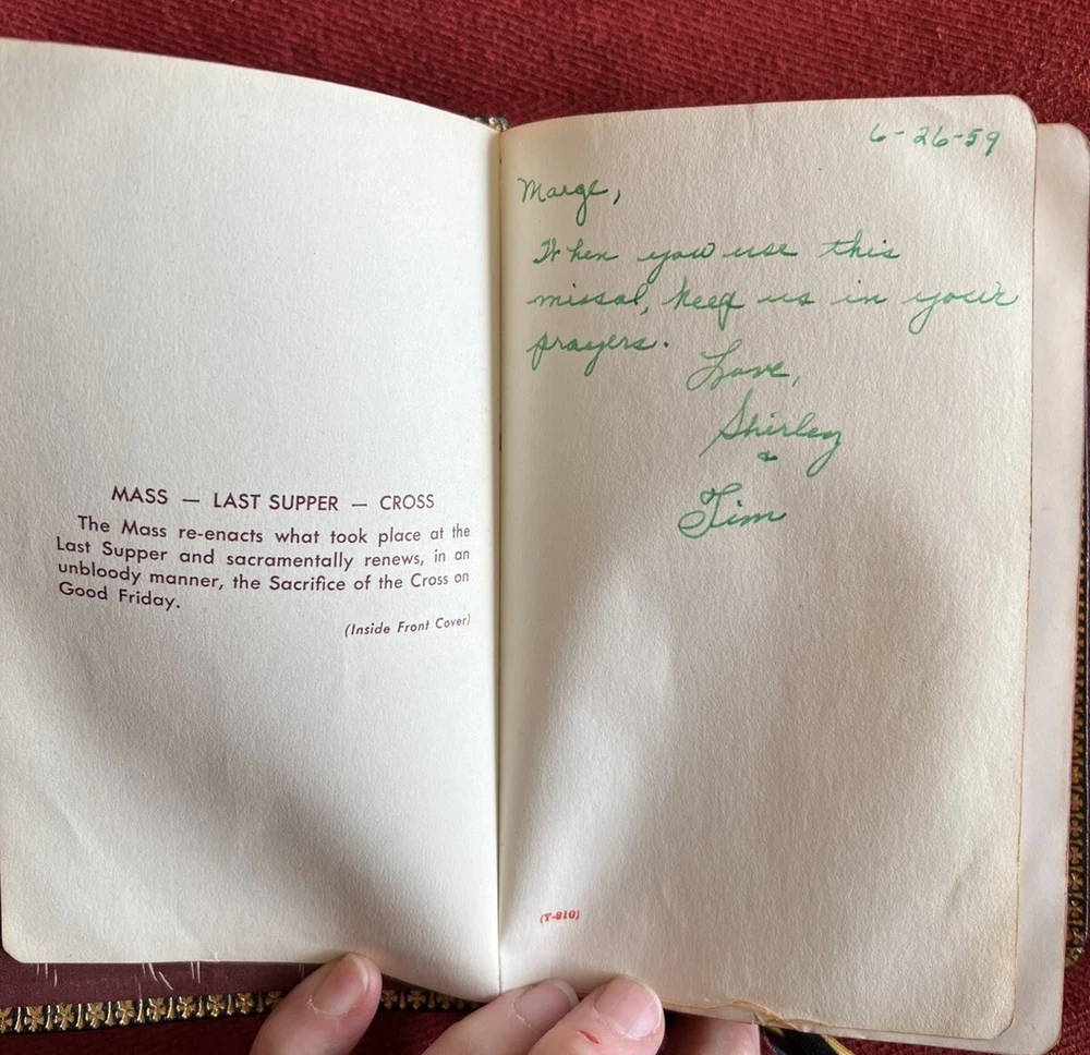 This vintage 1957 St. Joseph Daily Missal is a completely revised edition and comes in a leather-bound format. It is a Confraternity Version and is an original print from Catholic Book Publishing. The book is written in English and was printed in the United States. “Printed with permission by Francis Cardinal Spellman, Archbishop of new York for the Feast of St. Joseph March 19, 1957.” The inscription is from My Aunt Shirley (and Uncle Jim) to my mother Marge on June 26, 1959 before her August wedding to my dad in Chicago, Illinois. The cover is in excellent condition, the metallic page edges is in Very good condition with a mark on the top pages that does not affect the paper. The ribbons are faded and imperfect outside the pages, but in tact inside the pages. Great for the collector. Please ask any questions, happy to answer. Will package safely for shipping.