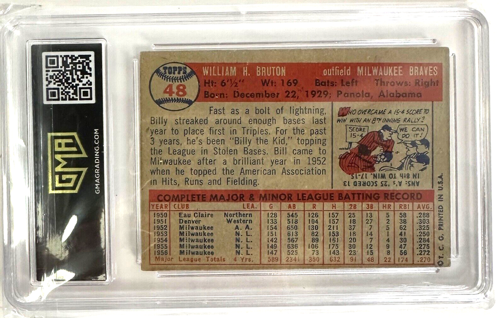 What a great baseball collectible piece. Bringing history and the nostalgia of what once was to today with this awesome collectible piece. Bill Bruton Outfiled Milwaukee Braves 1957 Topps Card #48 Graded VG 3 Thank you for considering us for your next collectible piece. 218