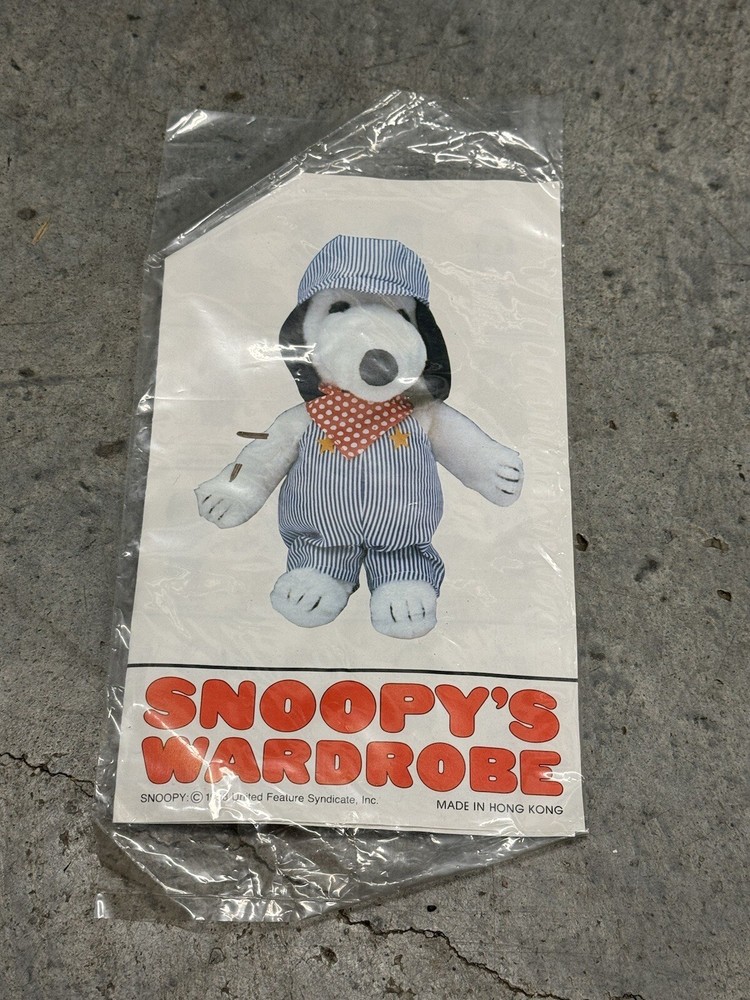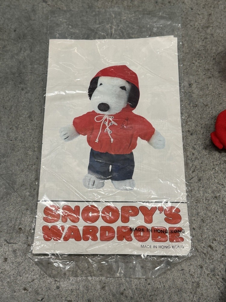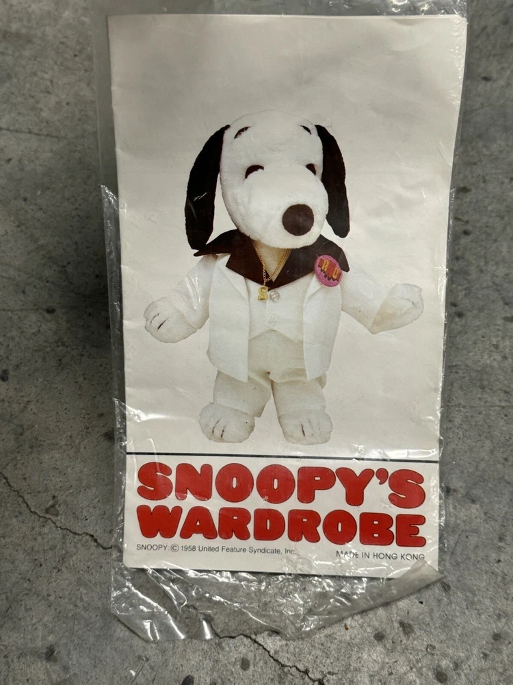 Vintage Snoopy Peanuts Plush 1958 Outfits Snoopy Wardrobe Lot of 6 Costumes. All 6 of the Snoopy outfits are pre-owned and are in good condition, look to have little or usage to them all. The brown / tan colored jacket outdoor outfit is missing the bottom pants to the costume, the rest of the outfits look to be complete. I also noticed the pajamas outfit does have a couple of light stains to them, please the photos to see the areas.