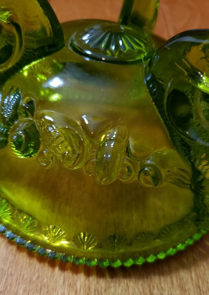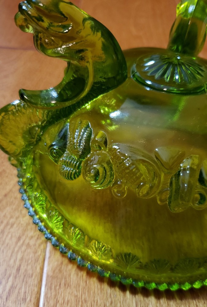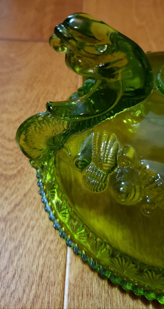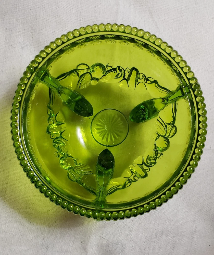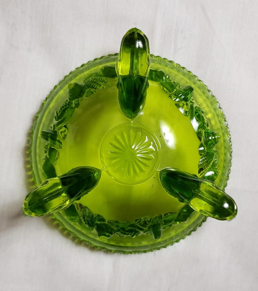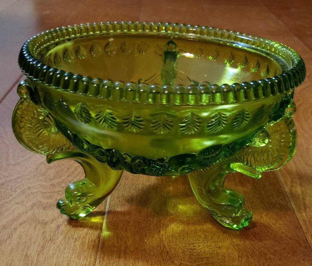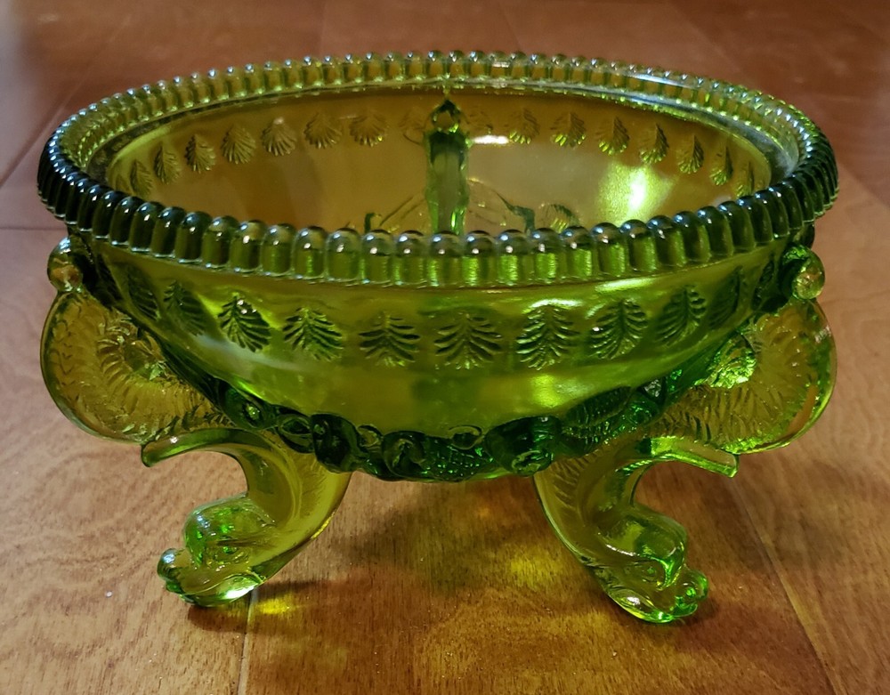 Westmoreland Argonaut Shell Tripod Bowl Green 9" diameter, 4" Tall. Ribbed Top, no lid. Vintage 1960s, made in Mississippi, USA. Sea Serpent legs, shell designs Stand out. Collectible. Candy dish/trinket dish. Heavy 1 pound 9 ounces.