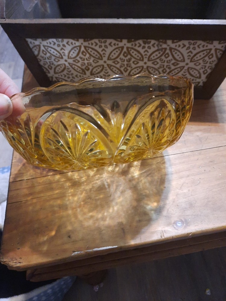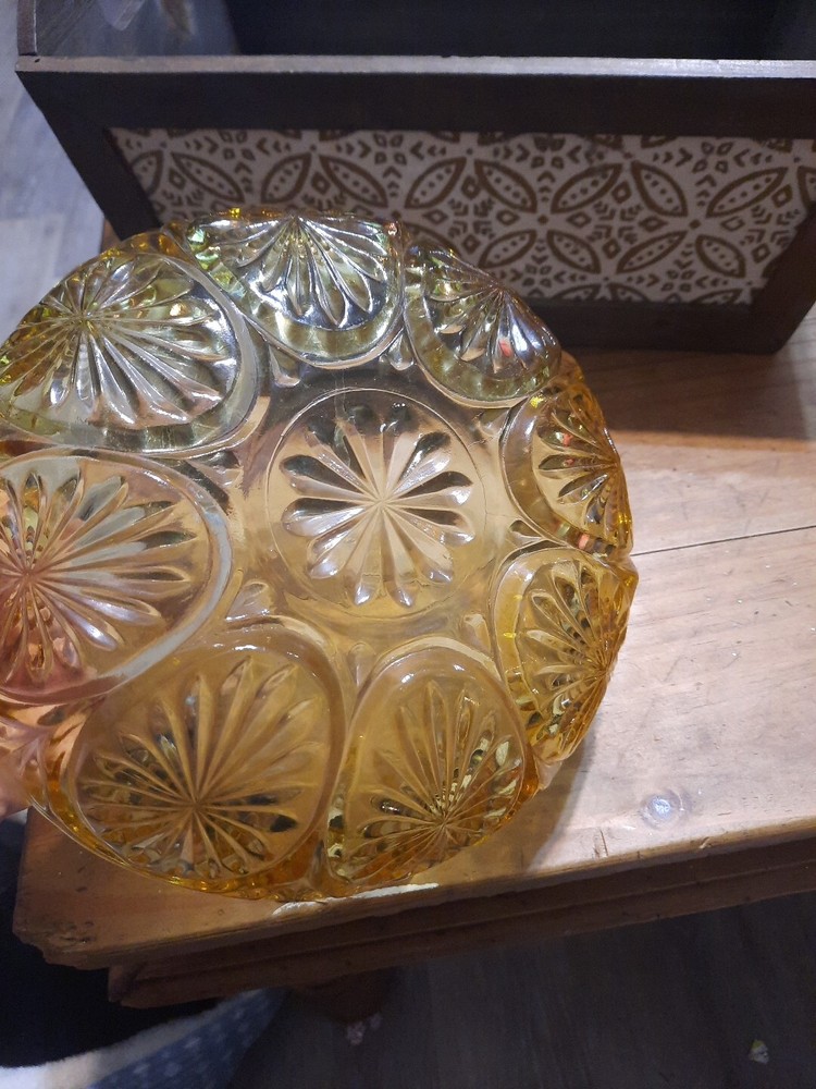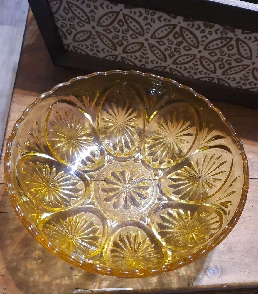 Era: Mid 20th Century (1941-1969) Production Style: Pressed Glass Vintage: Yes Glassmaking Technique: Molded Item Height: 2.5” Year Manufactured: 1960 Original/Reproduction: 8” Time Period Manufactured: 1960-1969 Country of Origin: United States MPN: Does Not Apply Material: Glass Brand: Anchor Hocking Type: Bowl Color: Yellow / Honey Set Includes: Serving Bowl Item Diameter: 8” Pattern: Star & Cameo Handmade: No Product Line: Cameo Style: Serving Bowl Shape: Round Type of Glass: Anchor Hocking
