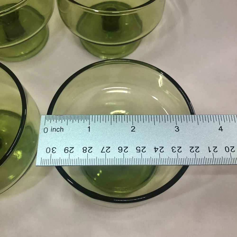 These are eight lovely little mid century dessert cups made by Anchor Hocking. The Finlandia line is a stunning avocado green glass set, smooth and free from imperfections. Each one is 3” tall with a 3.5” diameter cup sitting upon a footed base. They do stack inside one another if needed.