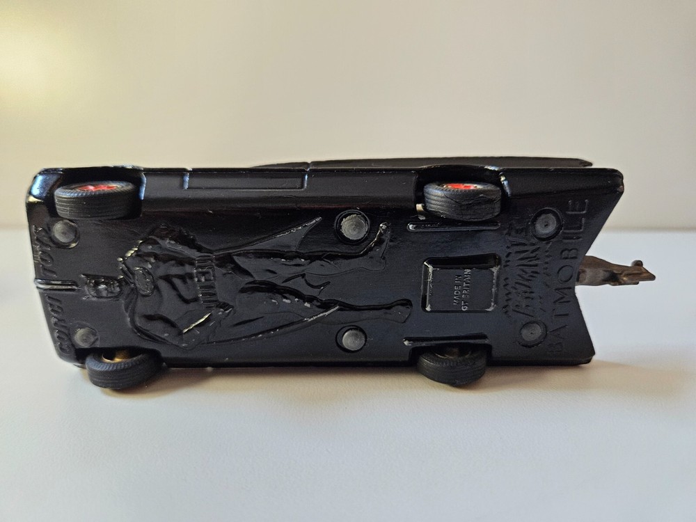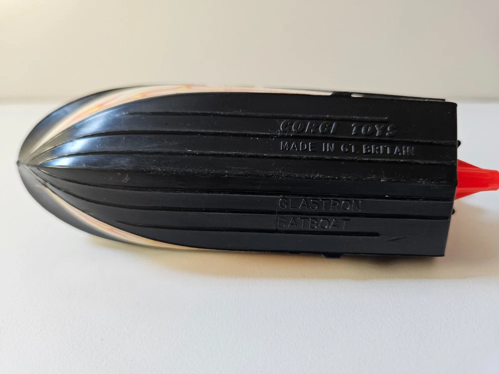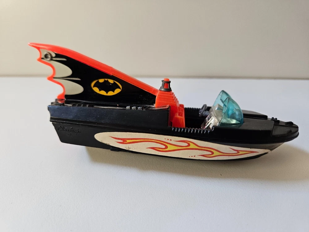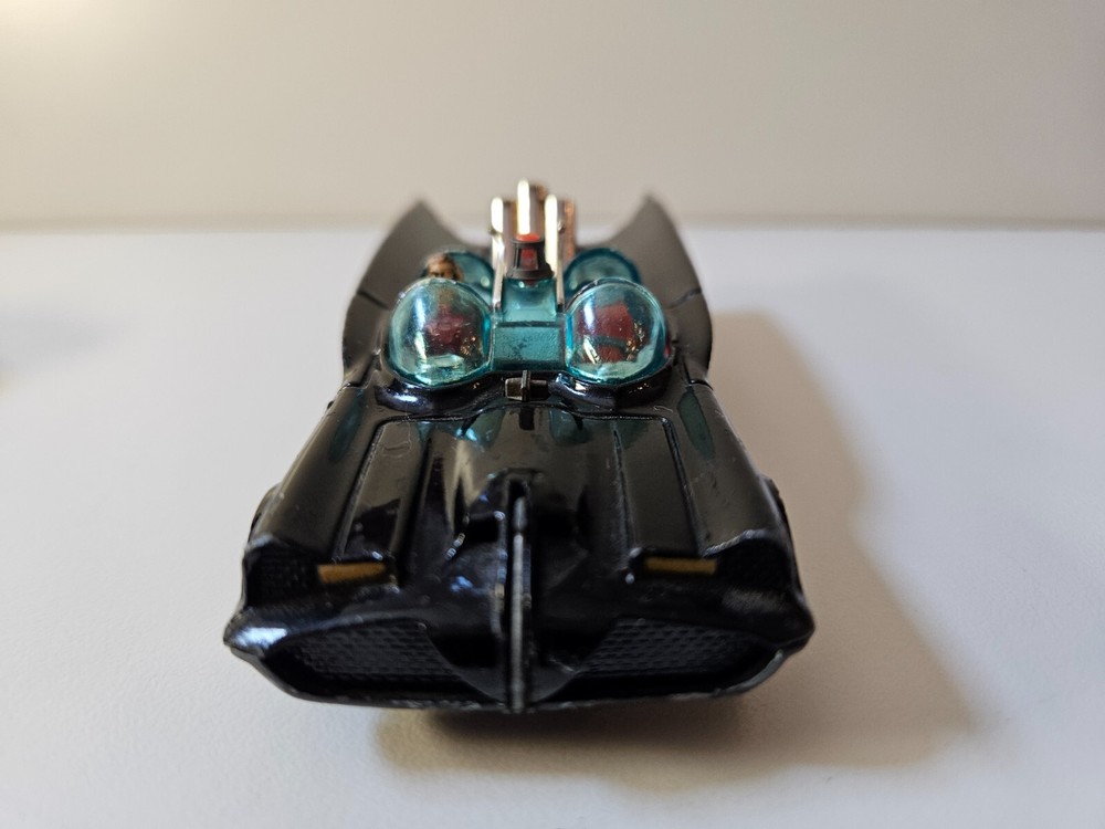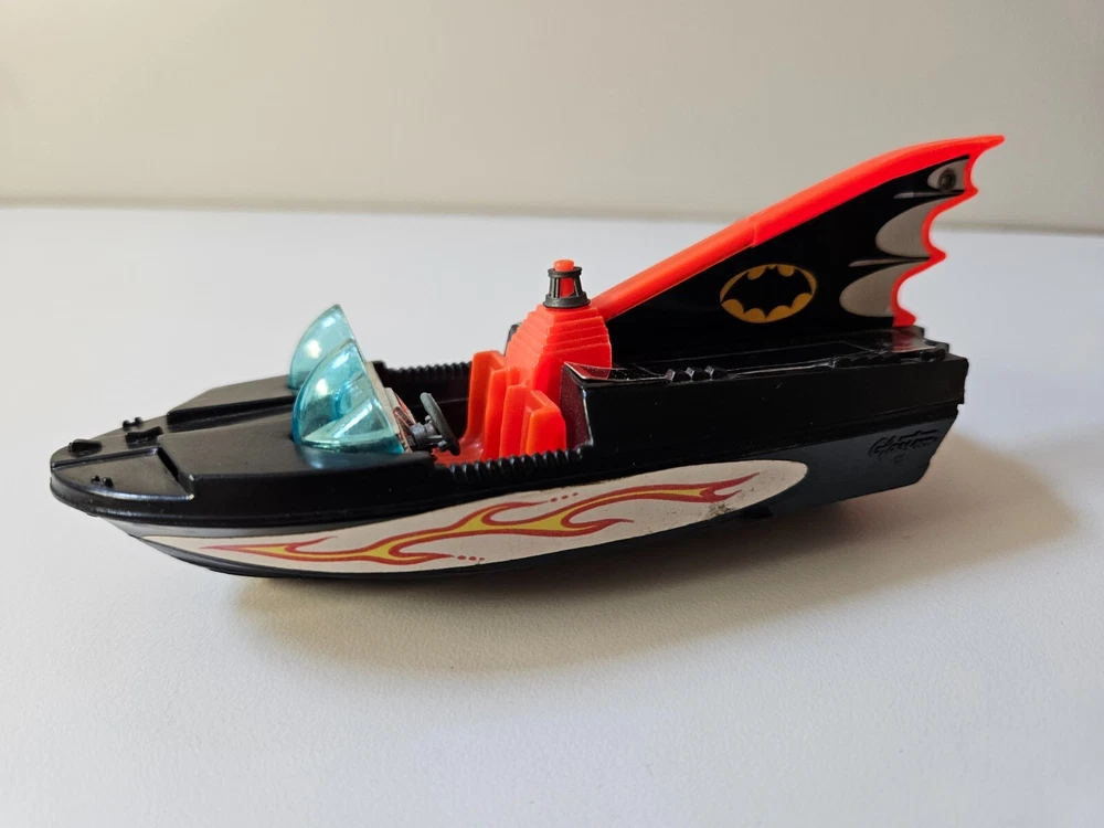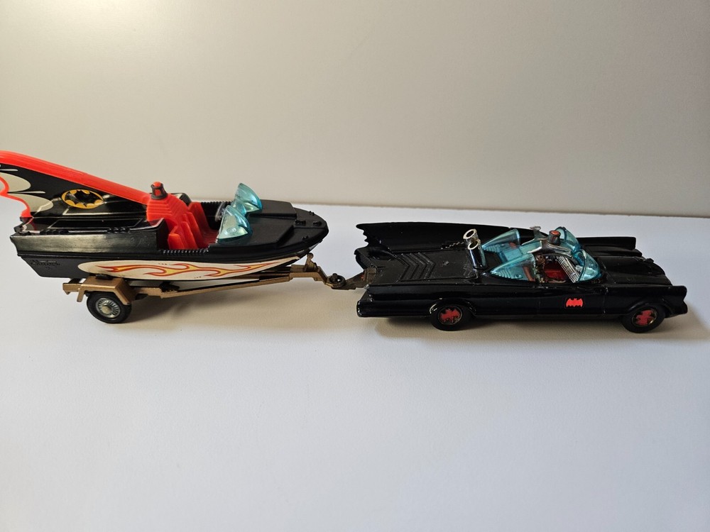 Made in Great Britain. The car and trailer are diecast metal, and the boat is plastic (floats). This set was previously owned and is in good condition with some imperfections such as scratches and rough scuffs. These are only cosmetics and do not affect function. Please see attached pictures for further details. Only the Robin figure is available. The retractable “blade” on the front of the car is triggered from the “x” on the front hood and works. The “missiles” that are fired from the three tubes on the back of the car are missing, while the trigger for the missiles (cogwheel behind the driver’s seat) does work.