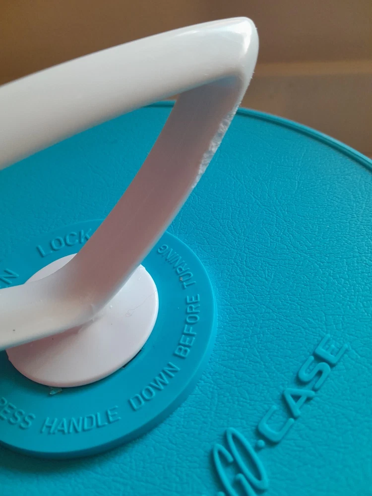 This vintage 1960s Disk Go Case is a durable and stylish option for carrying your 7" records. The blue plastic material and Supronics branding make for a unique and fashionable look. The case is designed to fit 45 RPM records and is perfect for any music enthusiast or collector. Made in the United States, this case is built to last and will provide a secure and protective environment for your valuable records. The Disk Go Case is a must-have accessory for anyone looking to keep their records organized and safe. Comes complete with half full 1960s 45 records! Great Condition. One small flaw on handle as Shown.