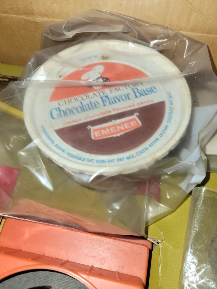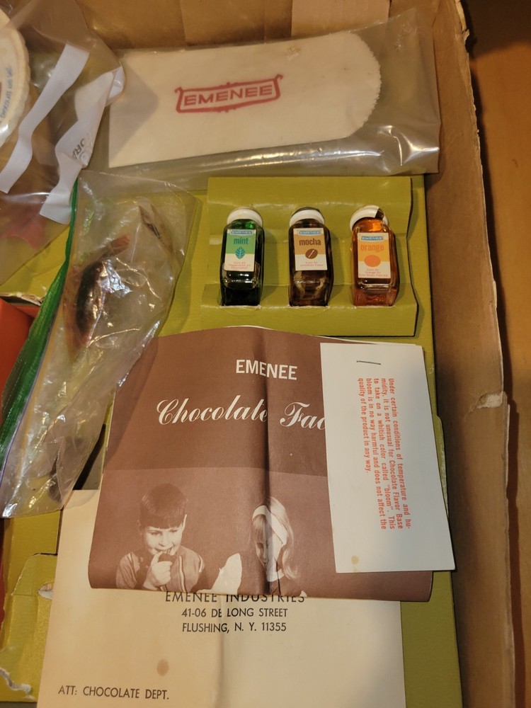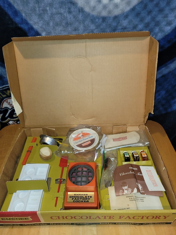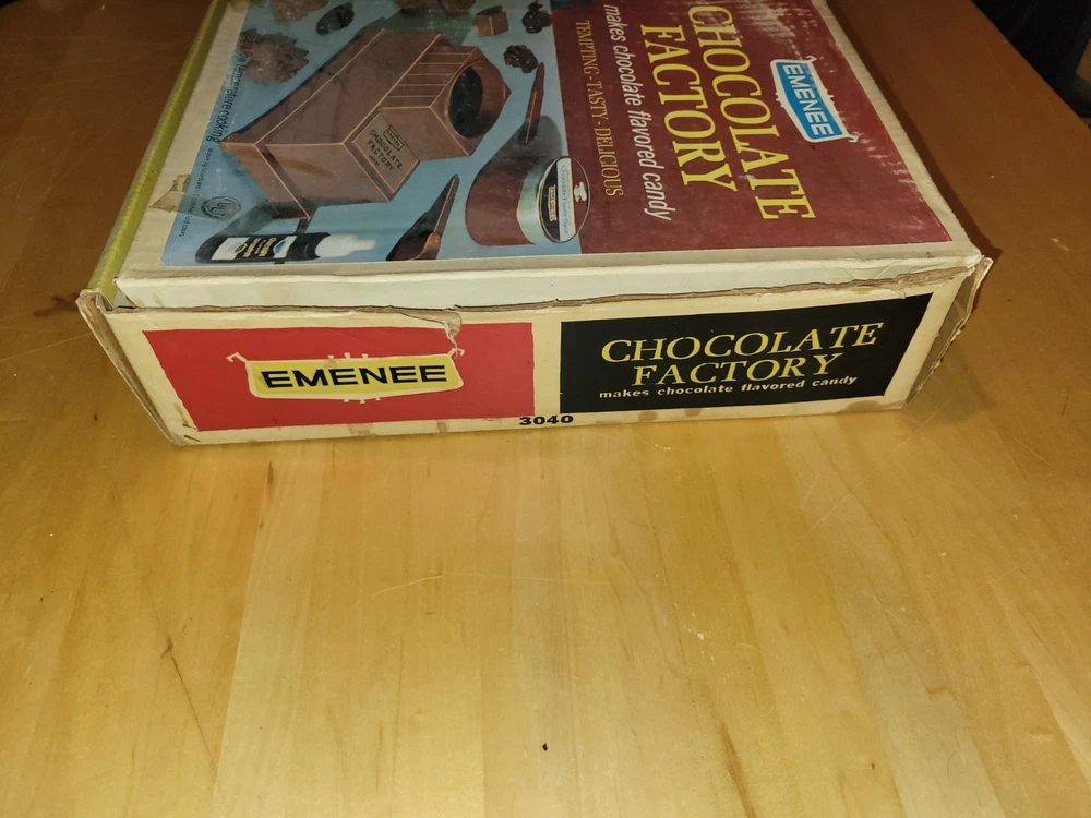 This vintage EMENEE Chocolate Factory is such a cool find! The unit works perfectly and looks amazing with its original box and instructions—nearly complete. The included sealed bag is a fun time capsule, though I wouldn’t recommend tasting it. It’s a fantastic display piece that brings back nostalgic vibes. Happy to answer any questions—thanks for the smooth transaction!