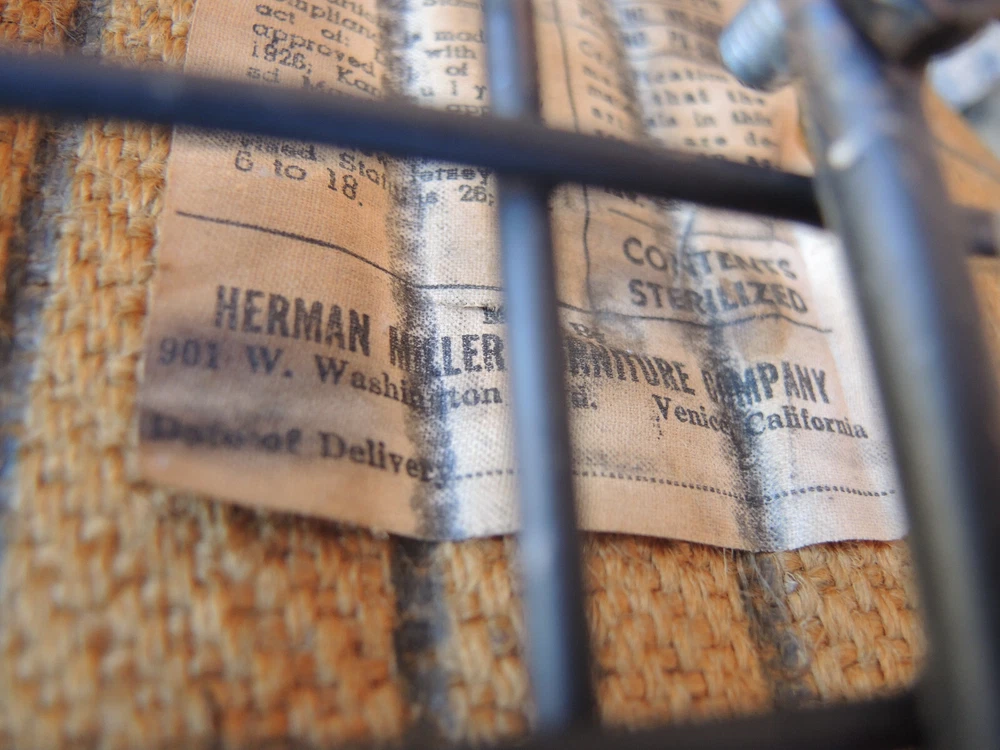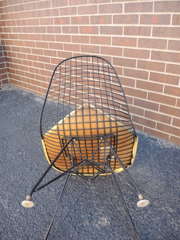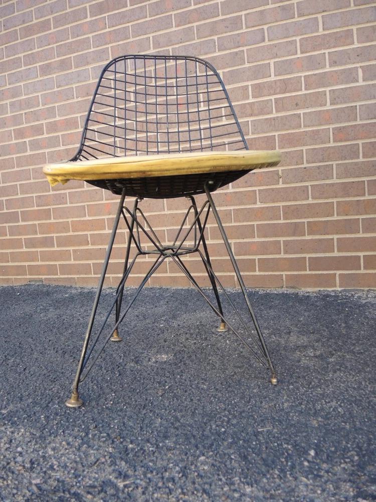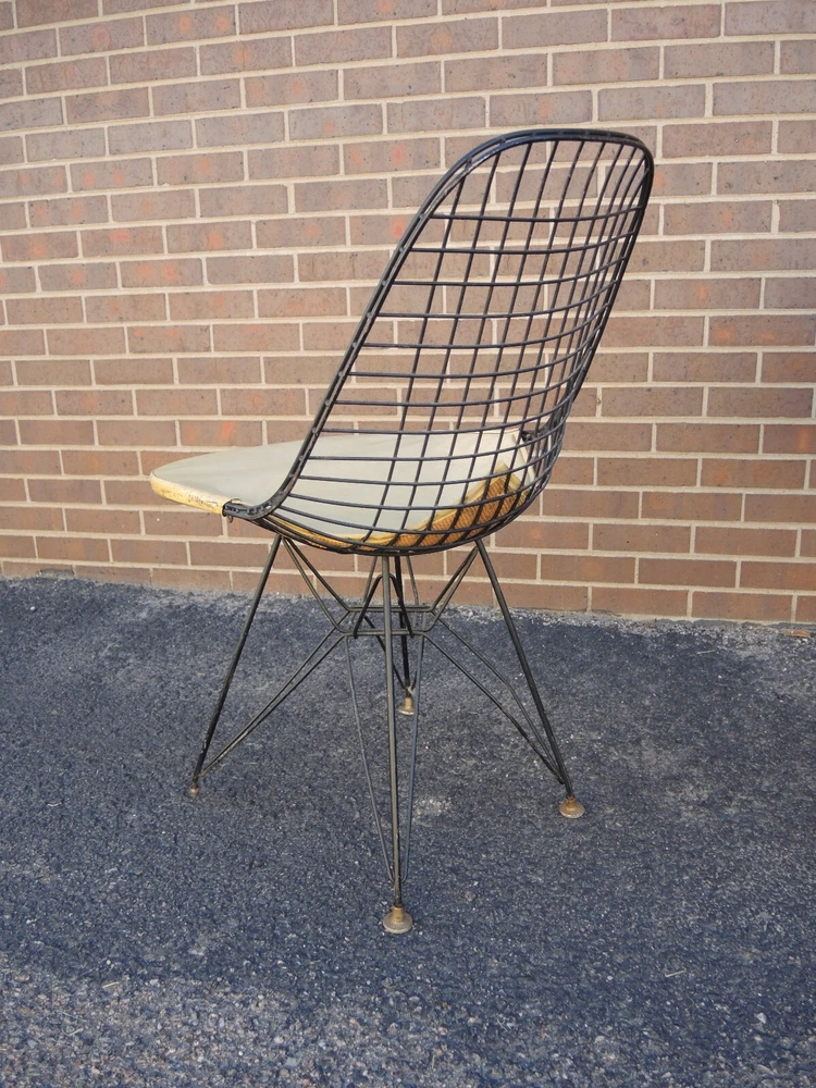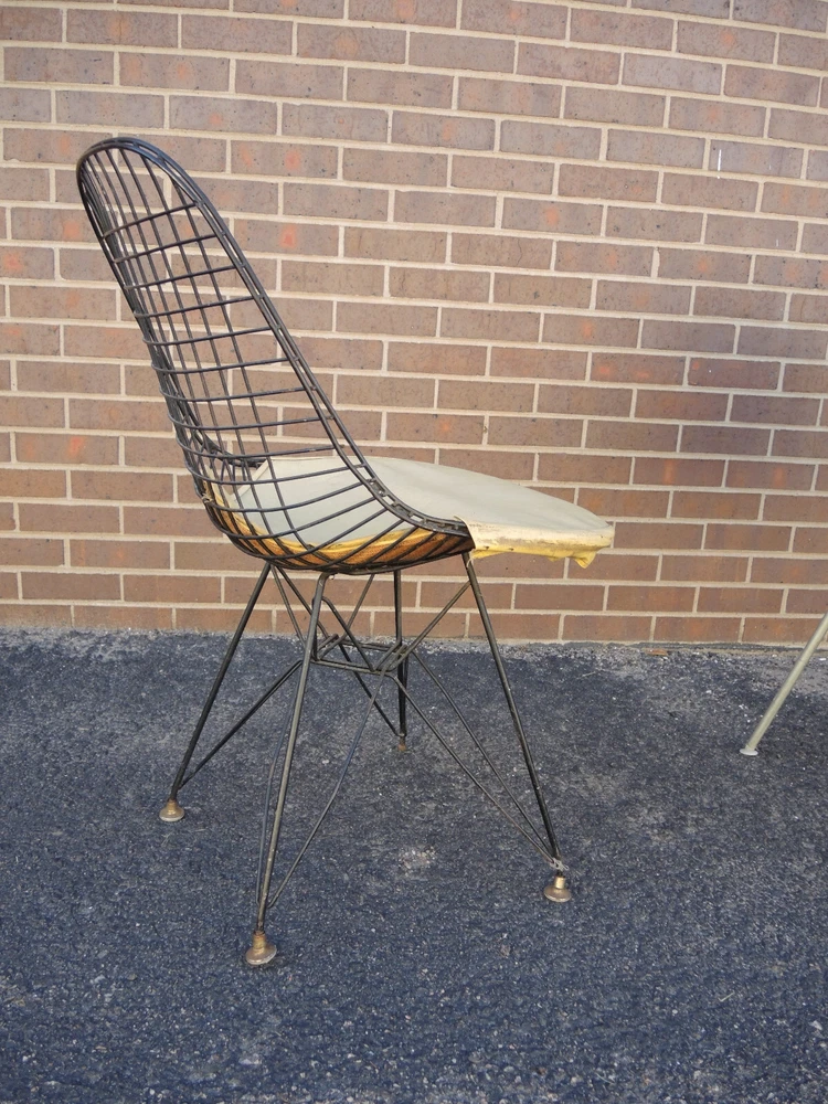 Being offered from a recent local estate is this Vintage 1960's Eames Herman Miller DKR-2 Wire Eiffel Bikini Chair with original Venice CA label. The chair is in original condition, missing one boot glide and upholstery seat back. Some wear from use. Please refer to the pictures for details.