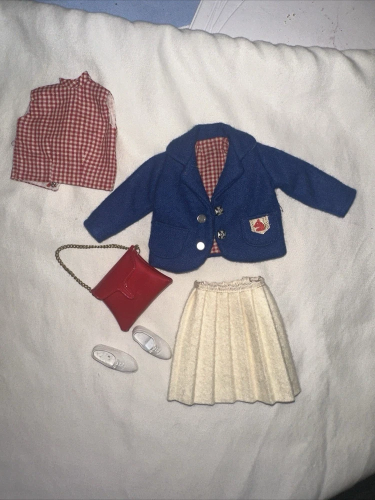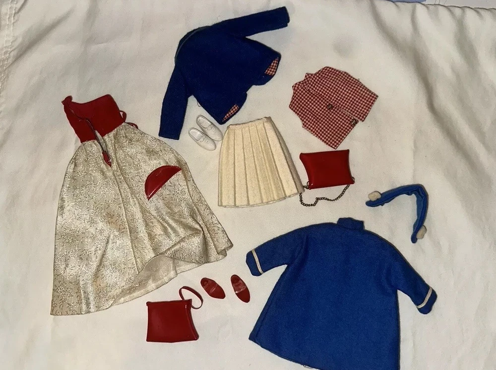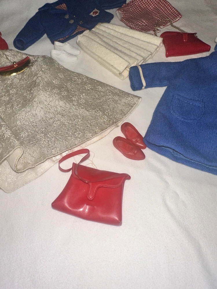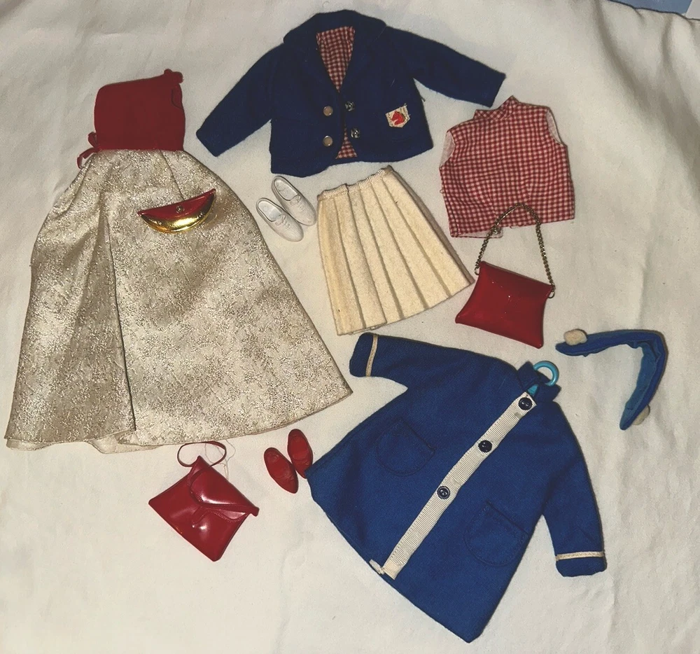 Embrace the charm of yesteryear with this exquisite collection of vintage Tammy doll clothes and accessories. A perfect find for collectors and enthusiasts, this lot includes 10 pieces that exude the quintessential spirit of the 1960s. From a chic coat jacket to a flattering dress, each item is crafted with care in multicolored cloth, reflecting the era's fashion trends. Made by Ideal in 1967 and manufactured in Japan, these original items are a testament to the quality and style of the time. Designed for both Barbie and Tammy girl dolls, the set comprises a skirt, purse, shoes, headpiece, and two outfits, suitable for special occasions and party events. Each piece in this unit, sold as a lot, is a delightful nod to the past, ready to enhance your collection or bring joy to a new home. All in good used condition, Comes from a smoke free home