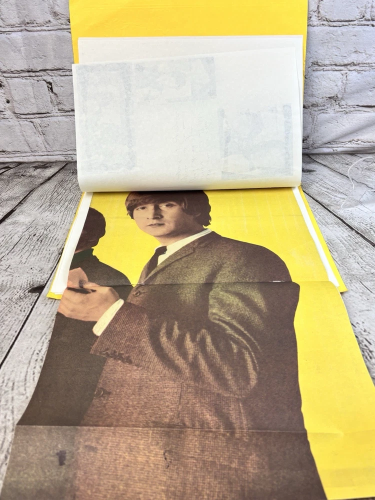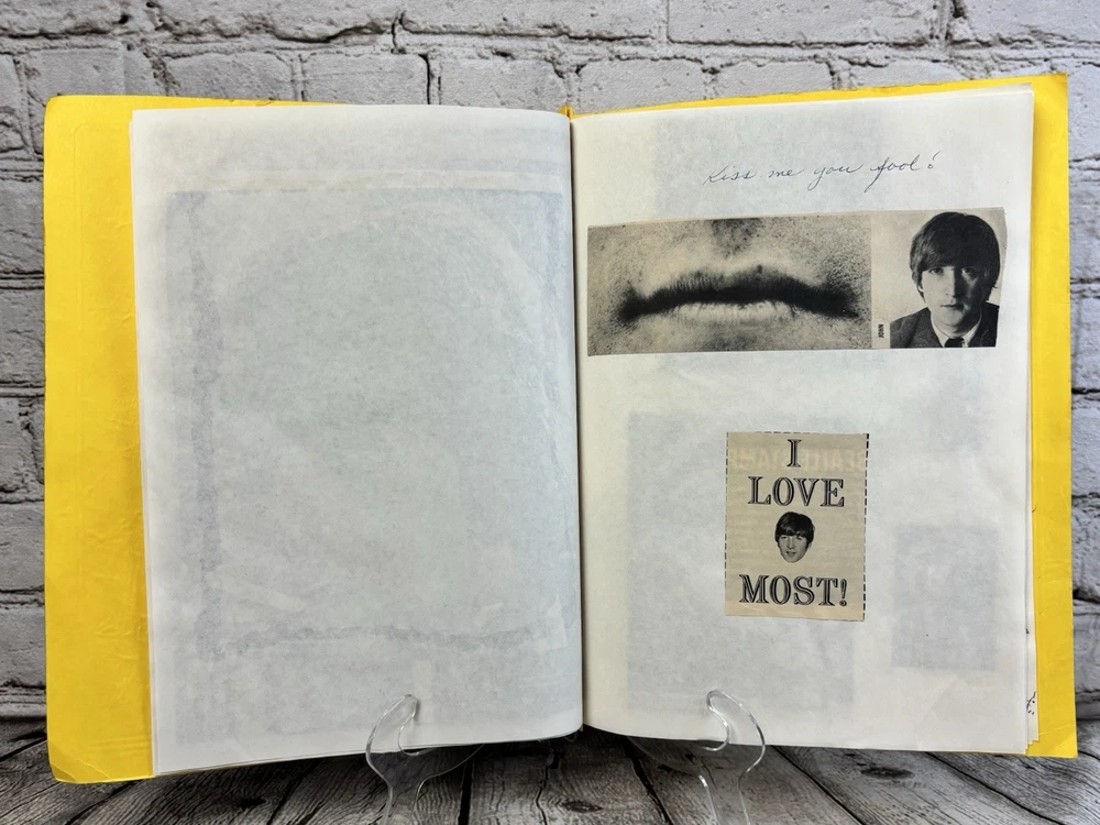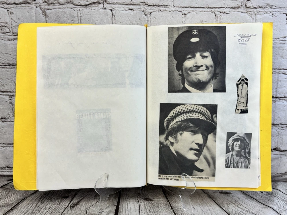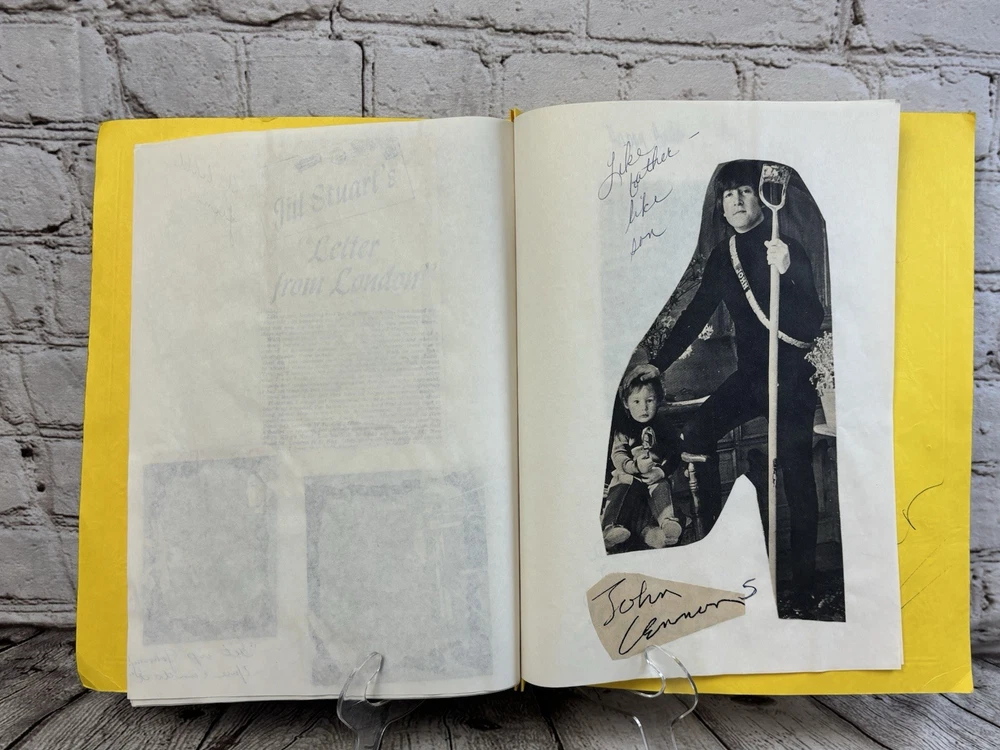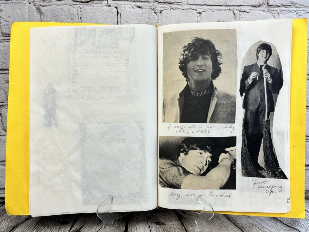 Vintage 1960s Beatles John Lennon Fan Scrapbook w/Photos, Clippings & Faux Signatures Features: •Handmade Beatles scrapbook dated to the 1960s •Dozens of original black-and-white and color clippings •Handwritten fan captions,jokes,and notes throughout •Fold-out full-color poster of John Lennon •Faux Beatles signatures on the final page(“Paul McCartney,” “George,” “Ringo” with a star over the “i,” and “John”)—clearly added by the fan and not authentic autographs Condition: •Pages show typical wear,yellowing,and minor creasing from age •Some small tears or wrinkles,especially near the fold-out section •No missing pages—complete and intact •Overall very good condition for a handmade fan piece of this age Notes: •This scrapbook is not a mass-produced item—it’s a true piece of 1960s Beatles fan history •While the signatures are not authentic,they reflect the era’s devotion and playful creativity •A fantastic collectible for Beatles enthusiasts,pop culture historians,or those who appreciate vintage ephemera •Ships securely with care