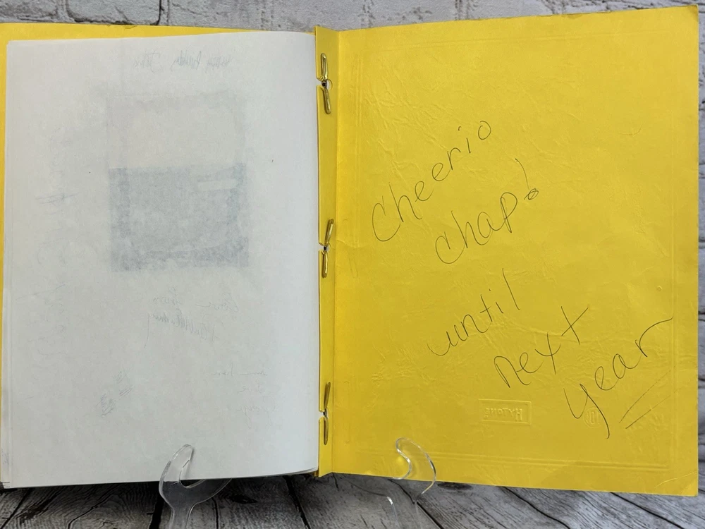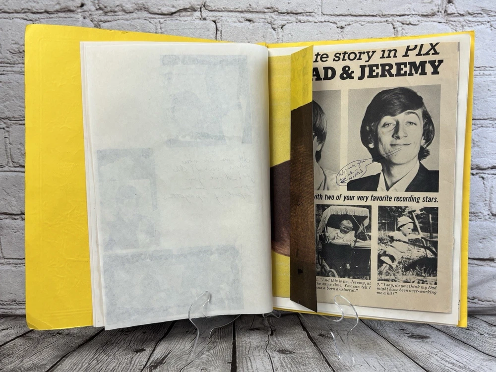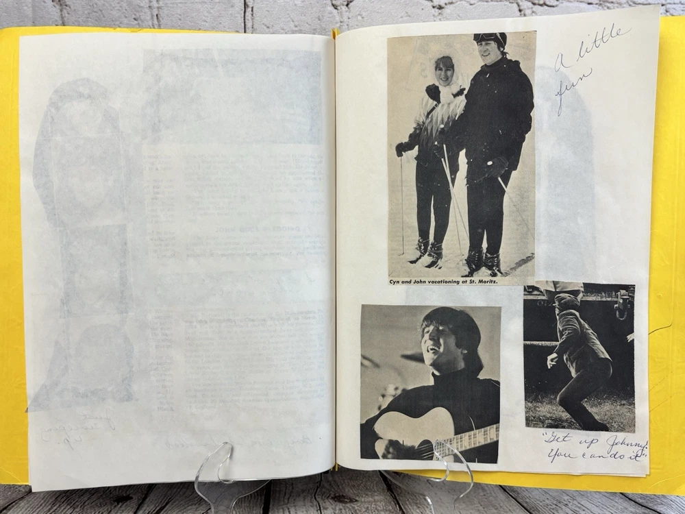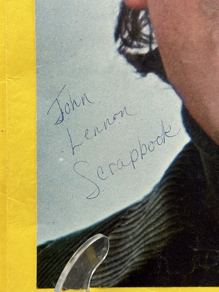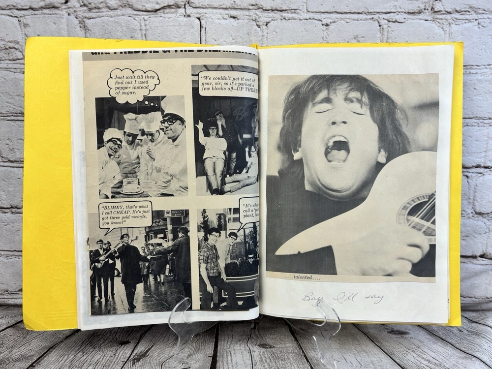 Vintage 1960s Beatles John Lennon Fan Scrapbook w/Photos, Clippings & Faux Signatures Features: •Handmade Beatles scrapbook dated to the 1960s •Dozens of original black-and-white and color clippings •Handwritten fan captions,jokes,and notes throughout •Fold-out full-color poster of John Lennon •Faux Beatles signatures on the final page(“Paul McCartney,” “George,” “Ringo” with a star over the “i,” and “John”)—clearly added by the fan and not authentic autographs Condition: •Pages show typical wear,yellowing,and minor creasing from age •Some small tears or wrinkles,especially near the fold-out section •No missing pages—complete and intact •Overall very good condition for a handmade fan piece of this age Notes: •This scrapbook is not a mass-produced item—it’s a true piece of 1960s Beatles fan history •While the signatures are not authentic,they reflect the era’s devotion and playful creativity •A fantastic collectible for Beatles enthusiasts,pop culture historians,or those who appreciate vintage ephemera •Ships securely with care