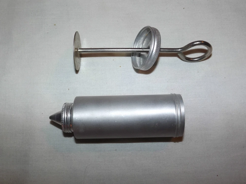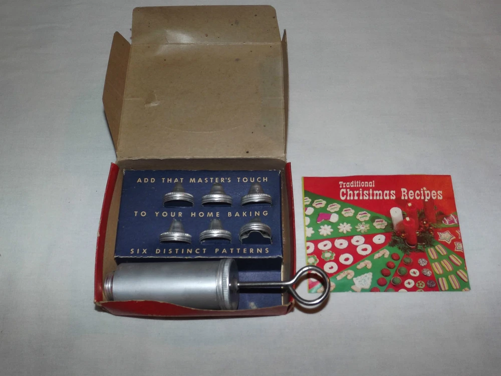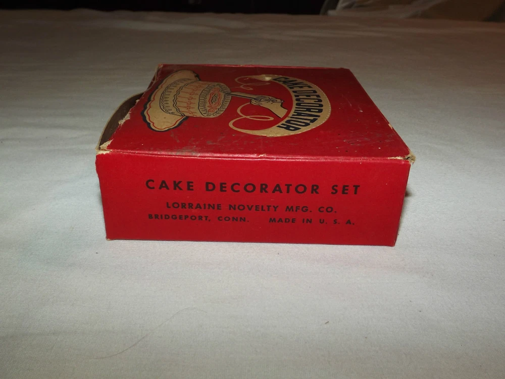 YOU ARE BIDDING ON........ VINTAGE 1960S LORRAINE ALUMINUM CAKE DECORATOR IN BOX with CHRISTMAS RECIPES......... .....SHOWS MINOR USAGE WEAR..BOX SHOWS A LOT OF HANDLING WEAR..HAS TEARS/AGE DISCOLORATION...PLEASE VIEW PHOTOS FOR CONDITION.***PLEASE E-MAIL IF YOU HAVE A QUESTION OR WANT AN ADDITIONAL PICTURE....PLEASE VISIT MY EBAY STORE FOR ADDITIONAL VINTAGE ITEMS..THANK YOU***416912