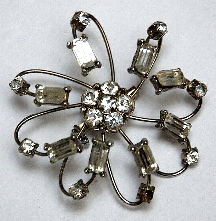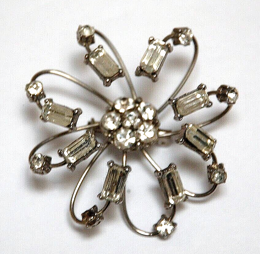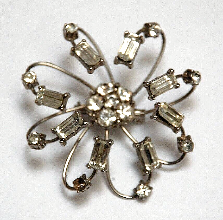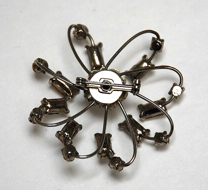 1960's Costume Jewelry Octopus Arm Rhinestone Brooch Pin Missing Stone Repair. It measures 2 1/4" in diameter round. I don't see it signed anywhere. There is one small rhinestone missing. You don't actually notice that it's missing until you look close up. Three or four of the arms that flare out are a little loose. They don't come out or anything. I'm not sure if there is a way to tighten them. Overall, They can be adjusted when the brooch is put on. It's in nice pre owned condition. It's been packed away in storage for over forty years.