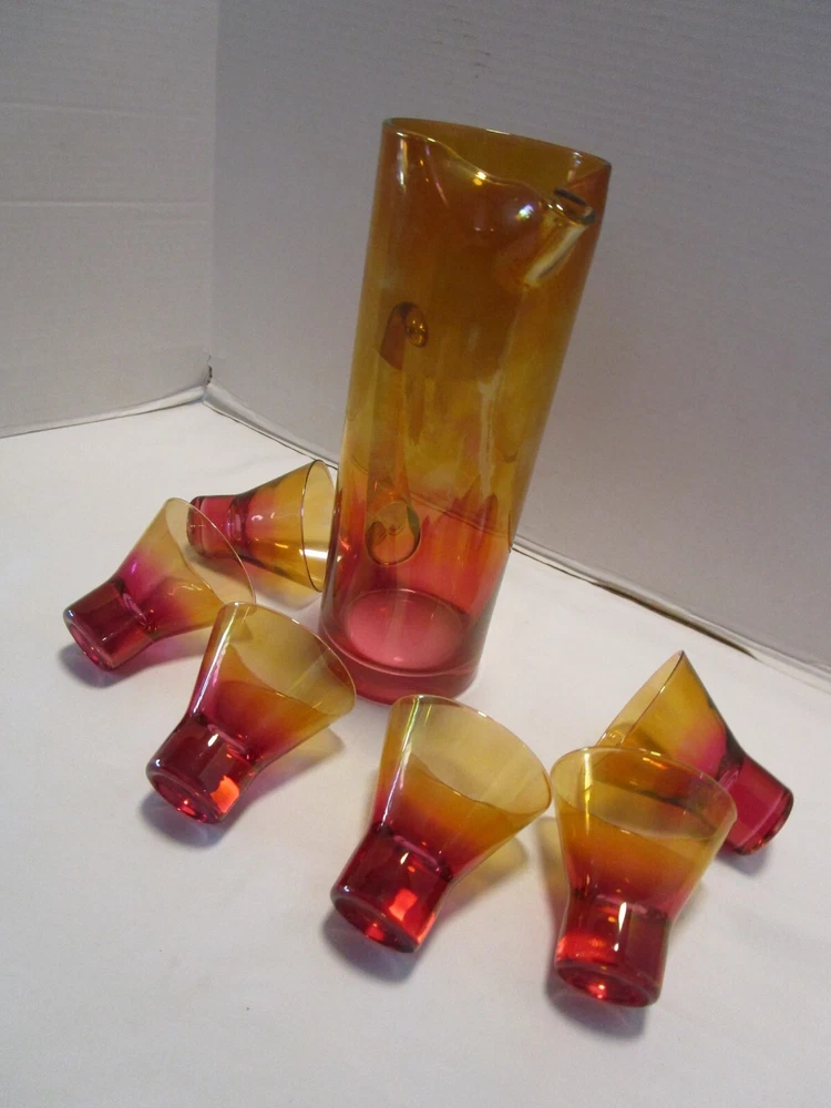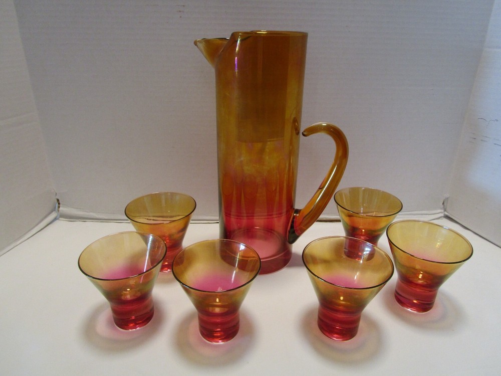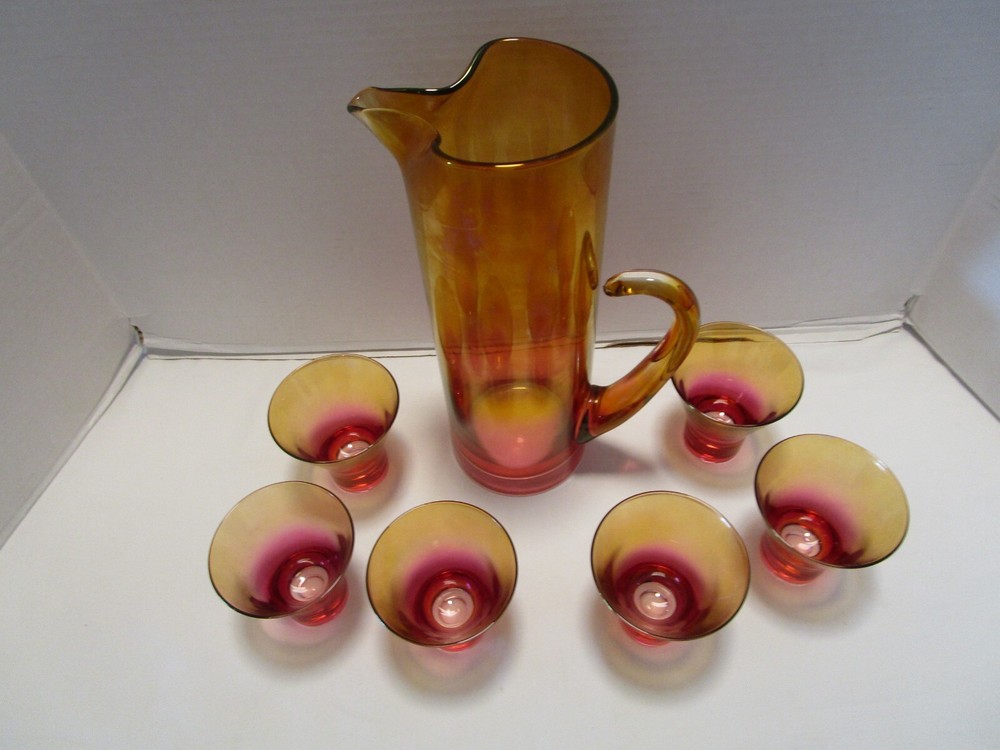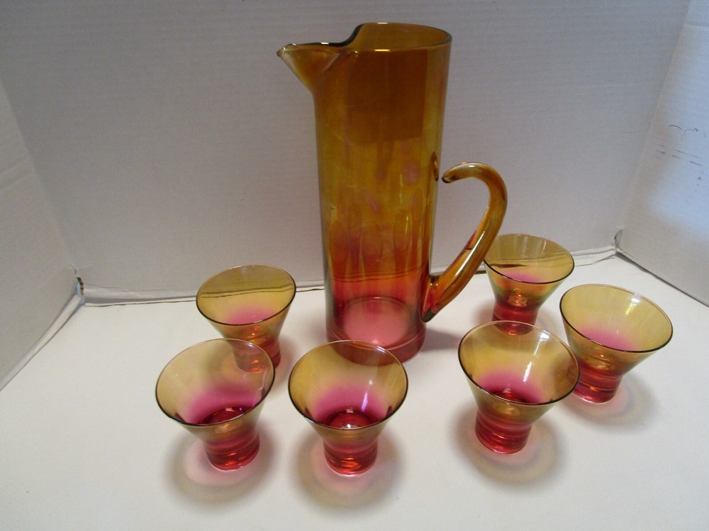 DESCRIPTION- 9/16/12/13/ book # 584 Vintage Mid Century Modern Barware 7 Piece martini cocktail pitcher set Ombre amberina orange /red/ yellow tones. The set is rarely found complete like this and still in good condition. Probably made in USA. The pitcher has a pitched lip, curved open handle, straight sides. - it does have some color drippings by the spout -see last pictures. It is 11” tall x 7” across the handle and spout, it is 3.75” across the body It is designed to hold up to 48 Oz. It comes with 6 matching glasses with weighted base flared sides martini cocktails glasses. Each glass is 3.25” tall x 3.25” across the rim 2.5” the footed base, each holds 5 Oz. brim full Great vintage used condition- no chips or cracks- ready to be display or use. Please zoom and view on all pictures for more details as they are part of the description. I DO MY BEST TO DESCRIBE EVERY LISTING BUT I AM NOT AN EXPERT AND ITEMS ARE SOLD “AS IS”. My idea of great/good may be different than yours, so EXAMINE PHOTOS CAREFULLY since they are binding and a supplement to the word description in case I should miss something. If I fail to mention something, it does not qualify as “item not as described” if it shows in my pictures. EACH PHOTO IS WORTH A THOUSAND WORDS AND THEY ARE OF THE EXACT ITEM YOU WILL RECEIVE. RETURN POLICY: Returns are acceptable ONLY if the item doesn’t match the description, is defective, or grossly misrepresented. THIS MEANS I DO NOT ACCEPT RETURNS for FIT, SIZING, COLOR ISSUES, OR BUYER'S REMORSE. Please zoom and view ALL pictures for more details as they are part of the description. Email me with any questions you may have. Please note: Buyer pays ALL return shipping and fees. If you use an eBay shipping label, it will be deducted from your refund amount. FEEDBACK I do not leave feedback until the end of a transaction. Transaction is considered over once I receive feedback from you confirming that you have received it and expressed satisfaction with it. If you are unsatisfied with your purchase, please contact me before leaving a neutral or negative feedback- so I can fix the issues.