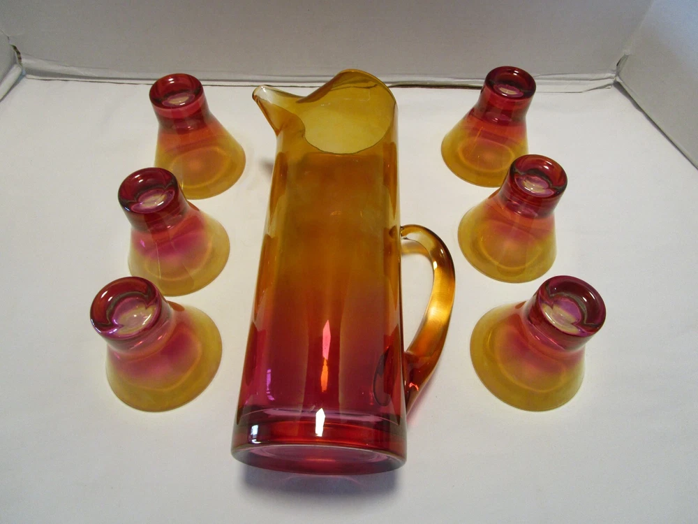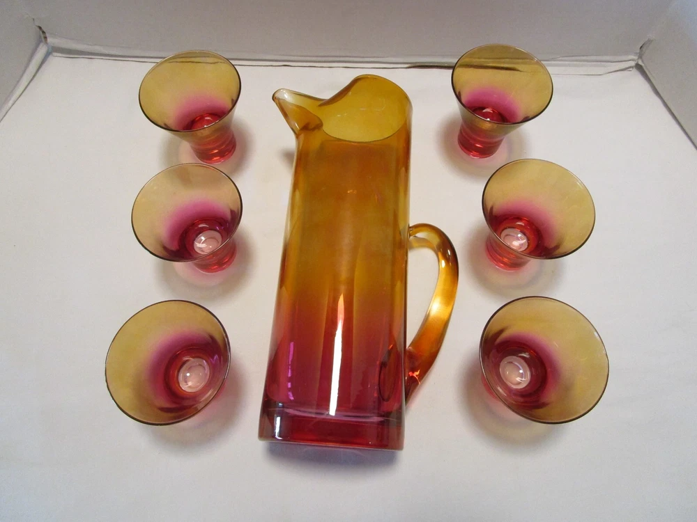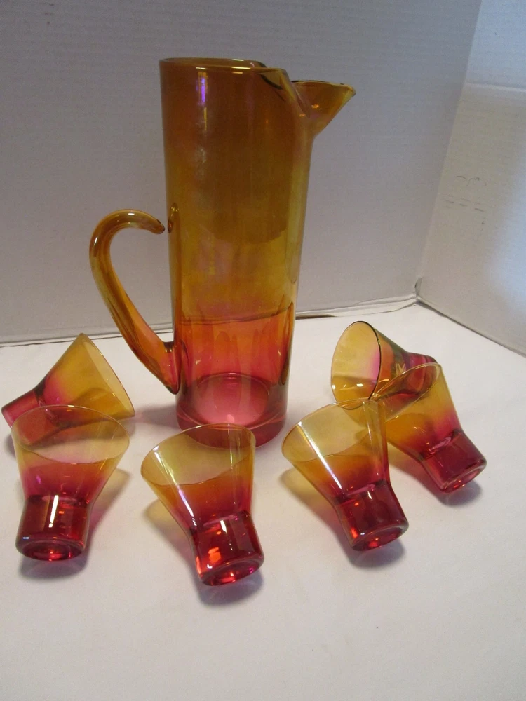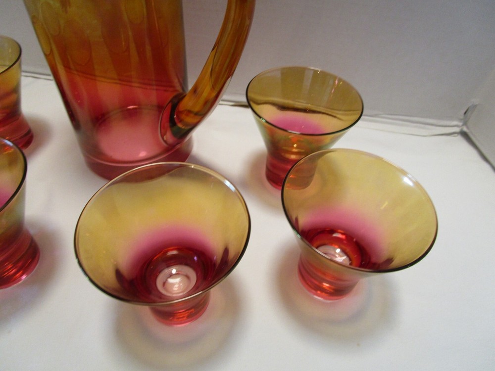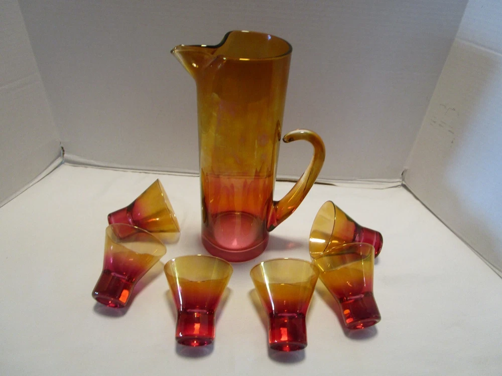 DESCRIPTION- 9/16/12/13/ book # 584 Vintage Mid Century Modern Barware 7 Piece martini cocktail pitcher set Ombre amberina orange /red/ yellow tones. The set is rarely found complete like this and still in good condition. Probably made in USA. The pitcher has a pitched lip, curved open handle, straight sides. - it does have some color drippings by the spout -see last pictures. It is 11” tall x 7” across the handle and spout, it is 3.75” across the body It is designed to hold up to 48 Oz. It comes with 6 matching glasses with weighted base flared sides martini cocktails glasses. Each glass is 3.25” tall x 3.25” across the rim 2.5” the footed base, each holds 5 Oz. brim full Great vintage used condition- no chips or cracks- ready to be display or use. Please zoom and view on all pictures for more details as they are part of the description. I DO MY BEST TO DESCRIBE EVERY LISTING BUT I AM NOT AN EXPERT AND ITEMS ARE SOLD “AS IS”. My idea of great/good may be different than yours, so EXAMINE PHOTOS CAREFULLY since they are binding and a supplement to the word description in case I should miss something. If I fail to mention something, it does not qualify as “item not as described” if it shows in my pictures. EACH PHOTO IS WORTH A THOUSAND WORDS AND THEY ARE OF THE EXACT ITEM YOU WILL RECEIVE. RETURN POLICY: Returns are acceptable ONLY if the item doesn’t match the description, is defective, or grossly misrepresented. THIS MEANS I DO NOT ACCEPT RETURNS for FIT, SIZING, COLOR ISSUES, OR BUYER'S REMORSE. Please zoom and view ALL pictures for more details as they are part of the description. Email me with any questions you may have. Please note: Buyer pays ALL return shipping and fees. If you use an eBay shipping label, it will be deducted from your refund amount. FEEDBACK I do not leave feedback until the end of a transaction. Transaction is considered over once I receive feedback from you confirming that you have received it and expressed satisfaction with it. If you are unsatisfied with your purchase, please contact me before leaving a neutral or negative feedback- so I can fix the issues.