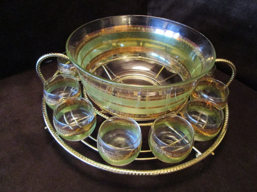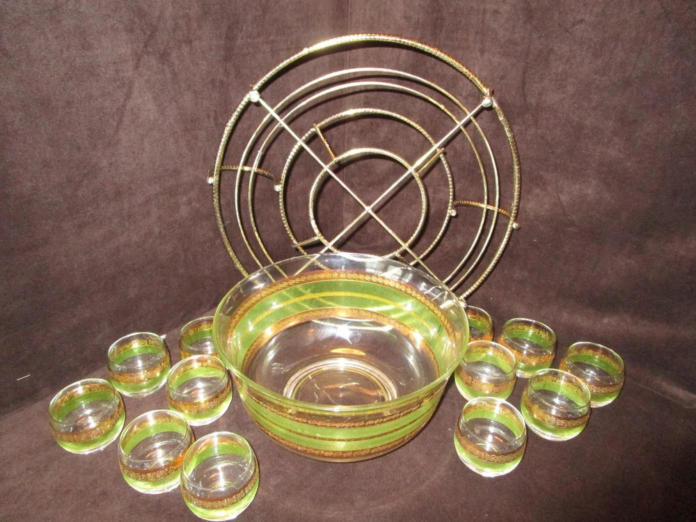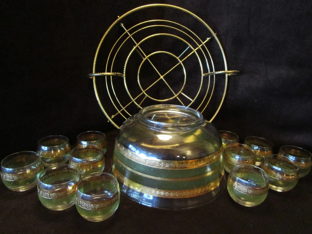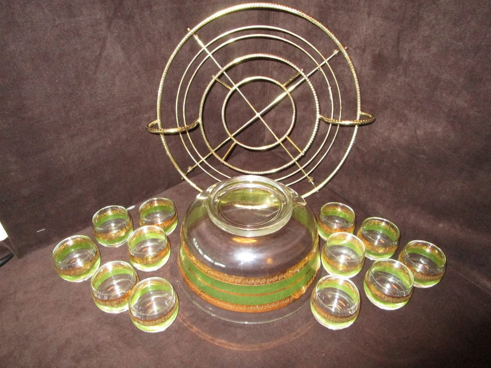 Description - 17-18-18-12 Mid Century Modern Vintage Punch Cocktail bowl set Glass 14 piece Set, Signed STARLYTE- glass. - HARD TO FIND 1960’S- This is a mid-century punch bowl set encrusted. Includes: One roly poly large punch bowl –it is 5.50” tall x 10.50” across the rim 12 roly poly glasses- each is 2.25” tall x 2.50” across the rim One brass gold tone caddy double handle, knurled wire, atomic with ball feet. The caddy is 16” across the handles x 4.75” tall Made in USA Bowl and glasses have a Green and gold bands encrusted Culver Style Pattern design, the glasses are labeled signed STARLYTE. Great vintage condition- no chips or cracks on the glasses- The bowl does show some gold loss, and a factory imperfection, see last Picture. The glasses are in really nice vintage condition , the caddy shows minimum age marks. Please view all pictures as they are part of the description. I DO MY BEST TO DESCRIBE EVERY LISTING BUT I AM NOT AN EXPERT AND ITEMS ARE SOLD “AS IS”. My idea of great/good may be different than yours, so EXAMINE PHOTOS CAREFULLY since they are binding and a supplement to the word description in case I should miss something. If I fail to mention something, it does not qualify as “item not as described” if it shows in my pictures. EACH PHOTO IS WORTH A THOUSAND WORDS AND THEY ARE OF THE EXACT ITEM YOU WILL RECEIVE. RETURN POLICY: Returns are acceptable ONLY if the item doesn’t match the description, is defective, or grossly misrepresented. THIS MEANS I DO NOT ACCEPT RETURNS for FIT, SIZING, COLOR ISSUES, OR BUYER'S REMORSE. Please zoom and view ALL pictures for more details as they are part of the description. Email me with any questions you may have. Please note: Buyer pays ALL return shipping and fees. If you use an eBay shipping label, it will be deducted from your refund amount. FEEDBACK : The transaction is considered over once I receive feedback from you confirming that you have received it and expressed satisfaction with it. If you are unsatisfied with your purchase, please contact me before leaving a neutral or negative feedback- so I can fix the issues.