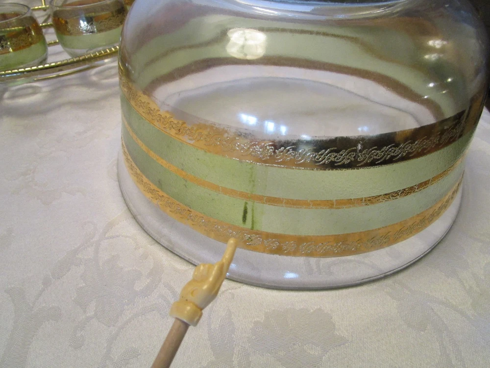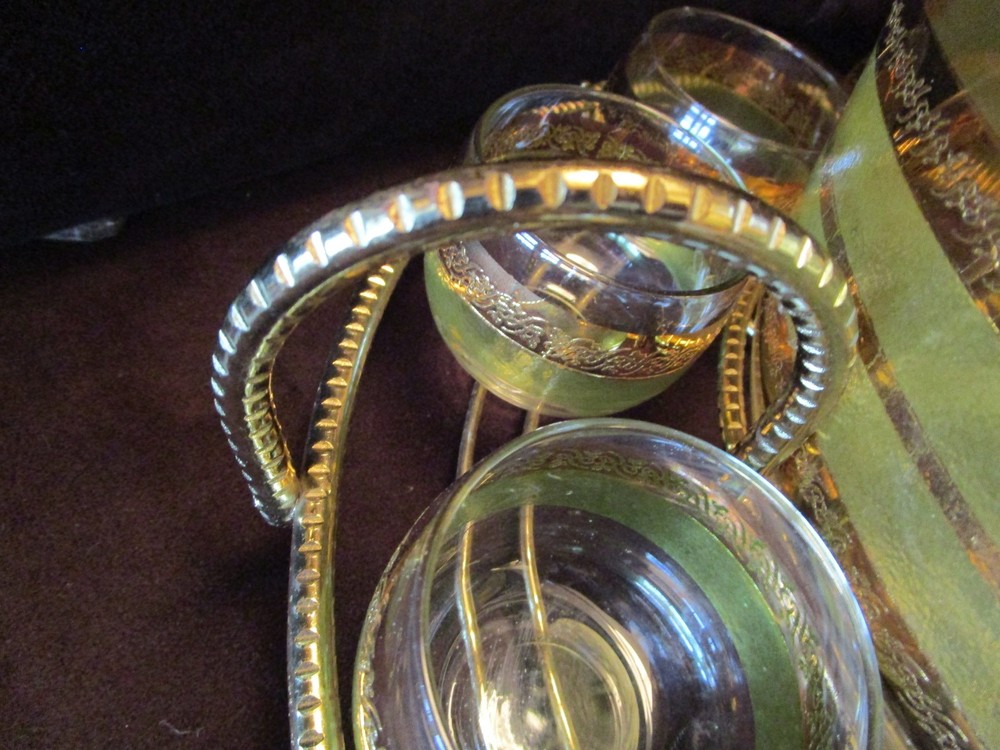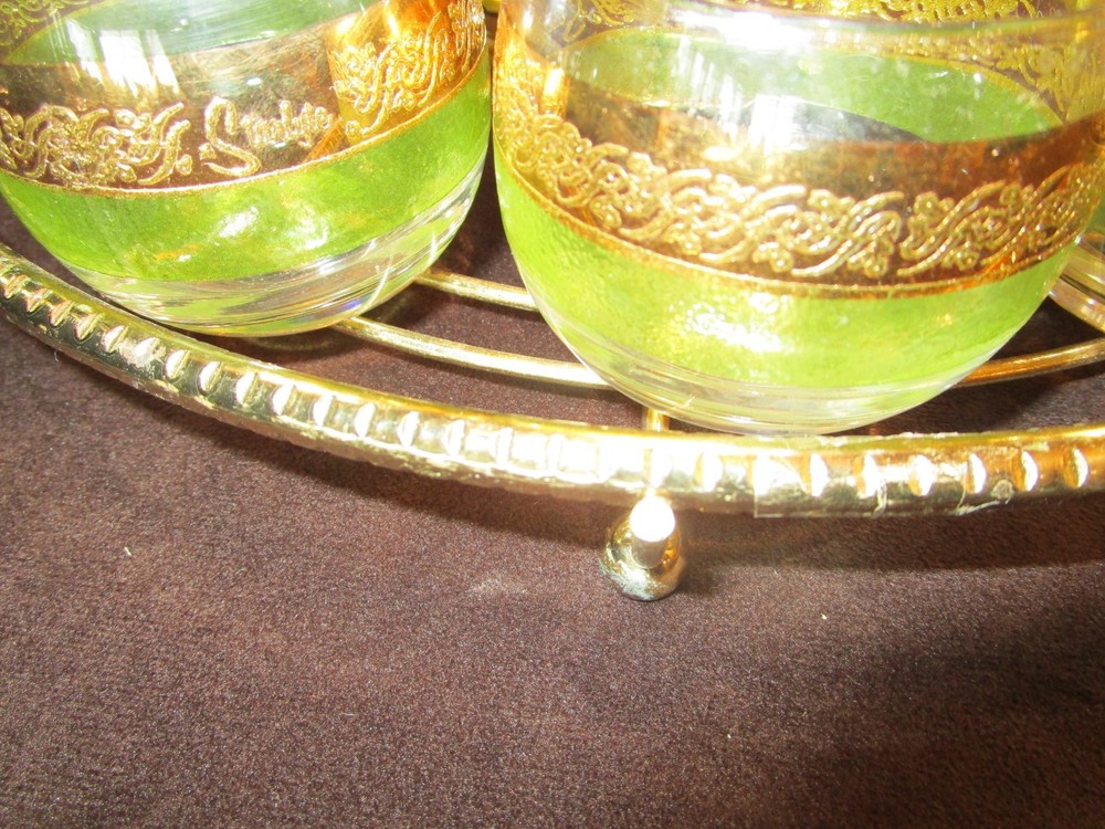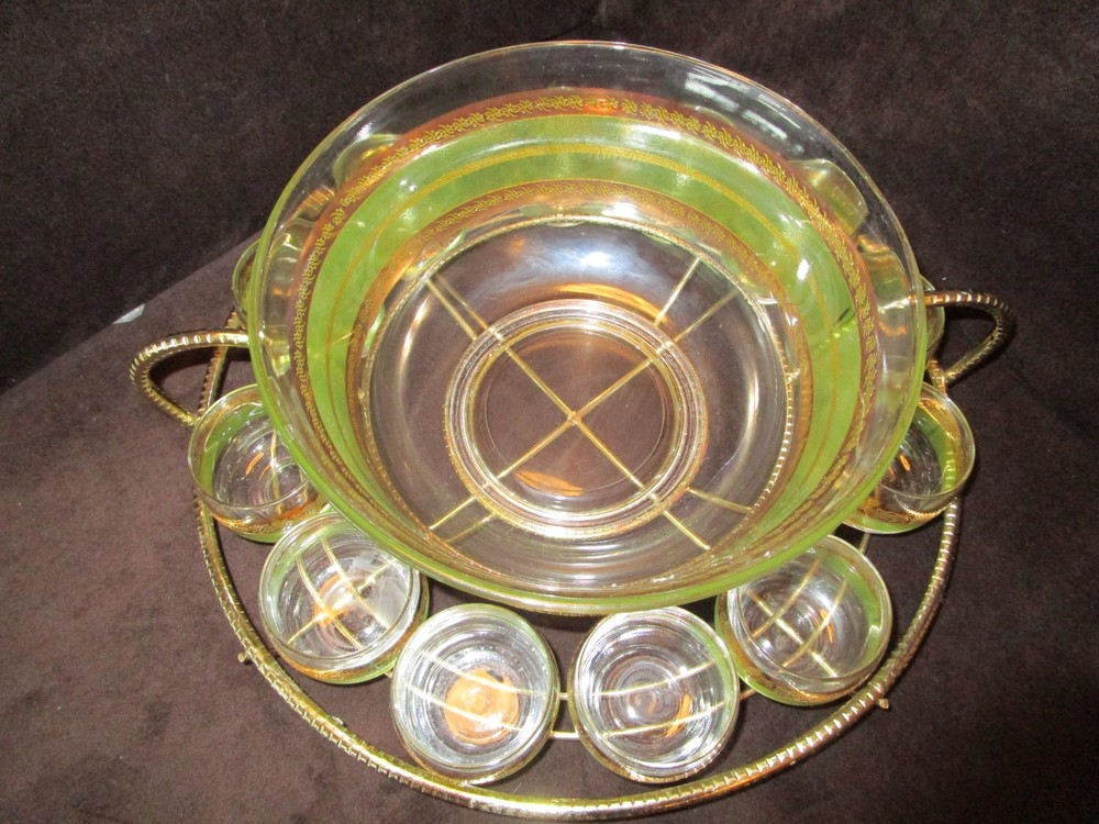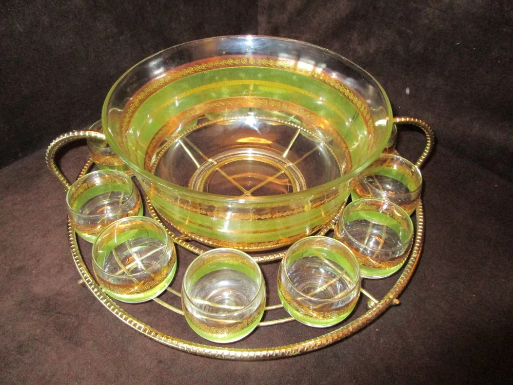 Description - 17-18-18-12 Mid Century Modern Vintage Punch Cocktail bowl set Glass 14 piece Set, Signed STARLYTE- glass. - HARD TO FIND 1960’S- This is a mid-century punch bowl set encrusted. Includes: One roly poly large punch bowl –it is 5.50” tall x 10.50” across the rim 12 roly poly glasses- each is 2.25” tall x 2.50” across the rim One brass gold tone caddy double handle, knurled wire, atomic with ball feet. The caddy is 16” across the handles x 4.75” tall Made in USA Bowl and glasses have a Green and gold bands encrusted Culver Style Pattern design, the glasses are labeled signed STARLYTE. Great vintage condition- no chips or cracks on the glasses- The bowl does show some gold loss, and a factory imperfection, see last Picture. The glasses are in really nice vintage condition , the caddy shows minimum age marks. Please view all pictures as they are part of the description. I DO MY BEST TO DESCRIBE EVERY LISTING BUT I AM NOT AN EXPERT AND ITEMS ARE SOLD “AS IS”. My idea of great/good may be different than yours, so EXAMINE PHOTOS CAREFULLY since they are binding and a supplement to the word description in case I should miss something. If I fail to mention something, it does not qualify as “item not as described” if it shows in my pictures. EACH PHOTO IS WORTH A THOUSAND WORDS AND THEY ARE OF THE EXACT ITEM YOU WILL RECEIVE. RETURN POLICY: Returns are acceptable ONLY if the item doesn’t match the description, is defective, or grossly misrepresented. THIS MEANS I DO NOT ACCEPT RETURNS for FIT, SIZING, COLOR ISSUES, OR BUYER'S REMORSE. Please zoom and view ALL pictures for more details as they are part of the description. Email me with any questions you may have. Please note: Buyer pays ALL return shipping and fees. If you use an eBay shipping label, it will be deducted from your refund amount. FEEDBACK : The transaction is considered over once I receive feedback from you confirming that you have received it and expressed satisfaction with it. If you are unsatisfied with your purchase, please contact me before leaving a neutral or negative feedback- so I can fix the issues.