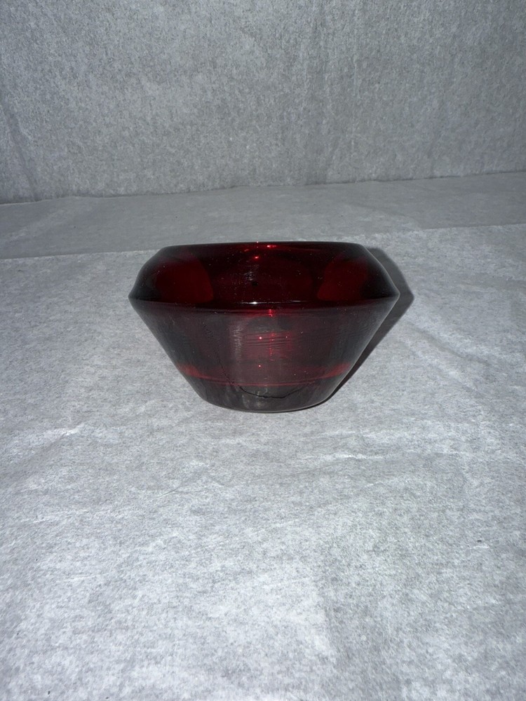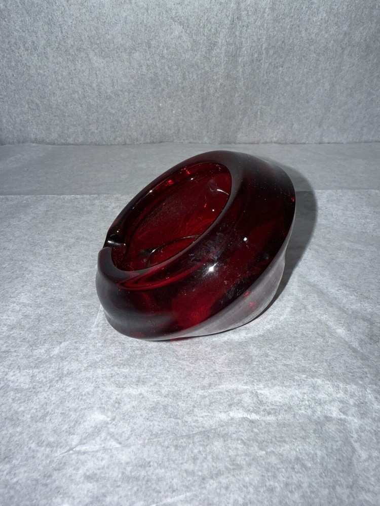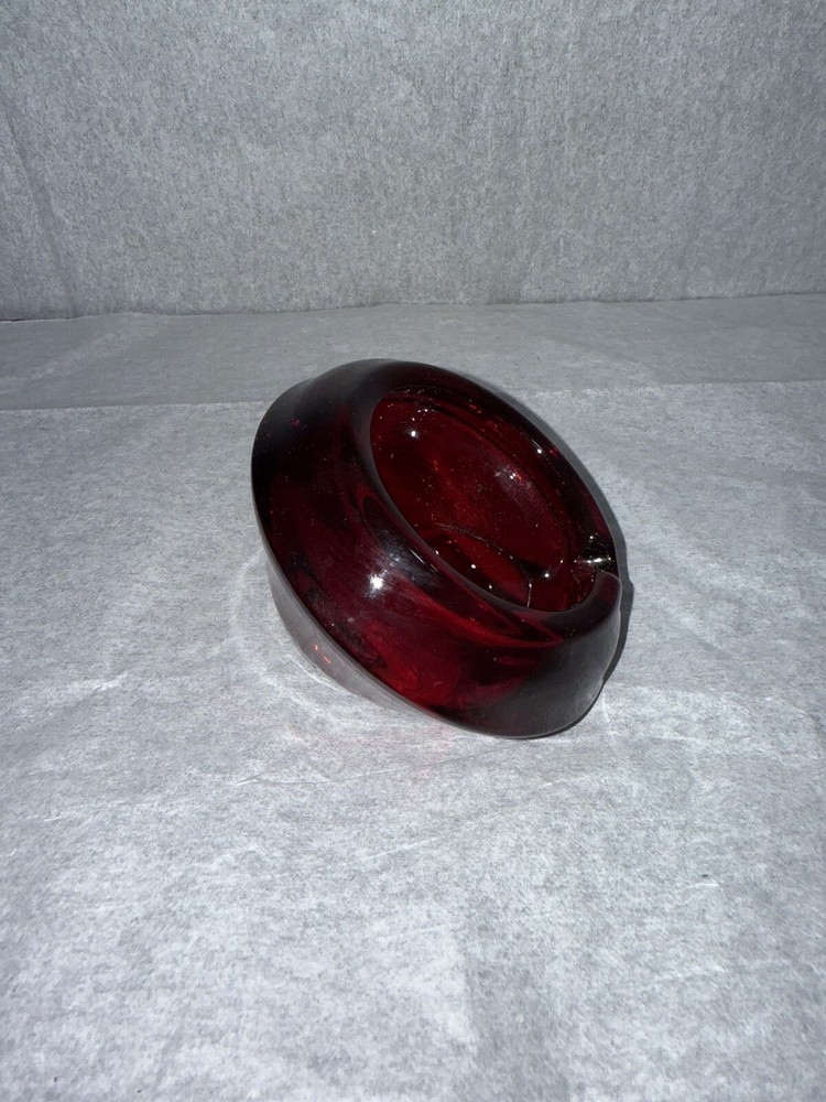 This is a vintage Westmoreland glass ashtray from the 1960s, made of ruby red glass in an Art Deco style. The ashtray is in the shape of a cylinder and features lampwork production technique. It is suitable for holding cigarettes and was manufactured in the United States.