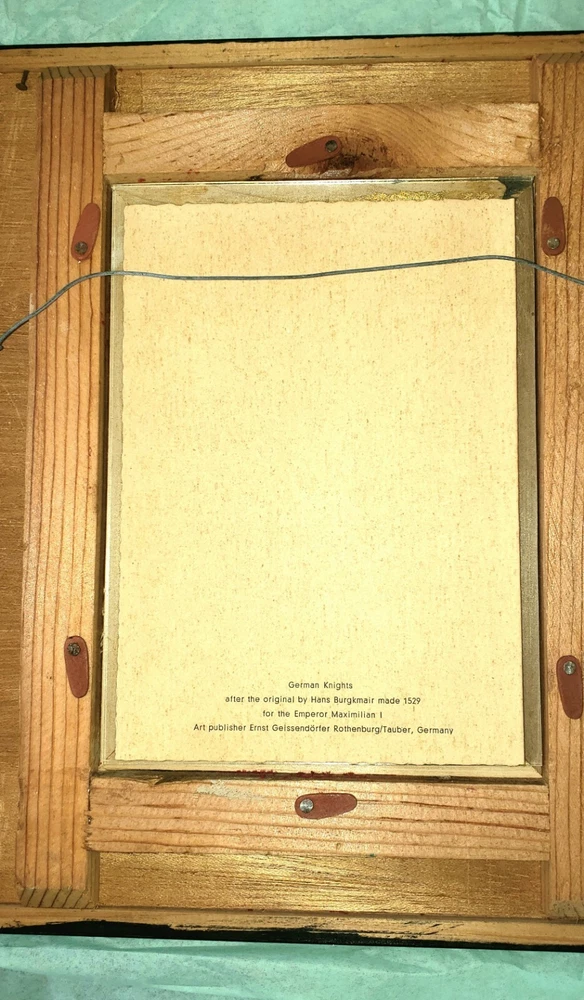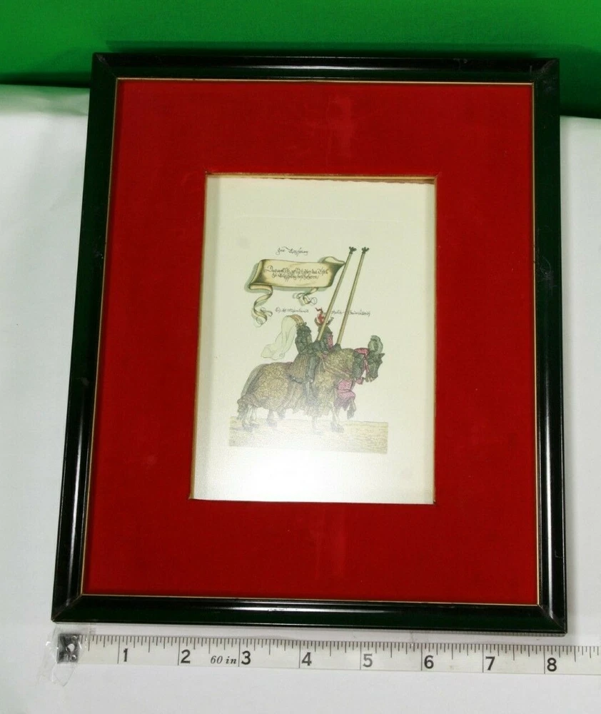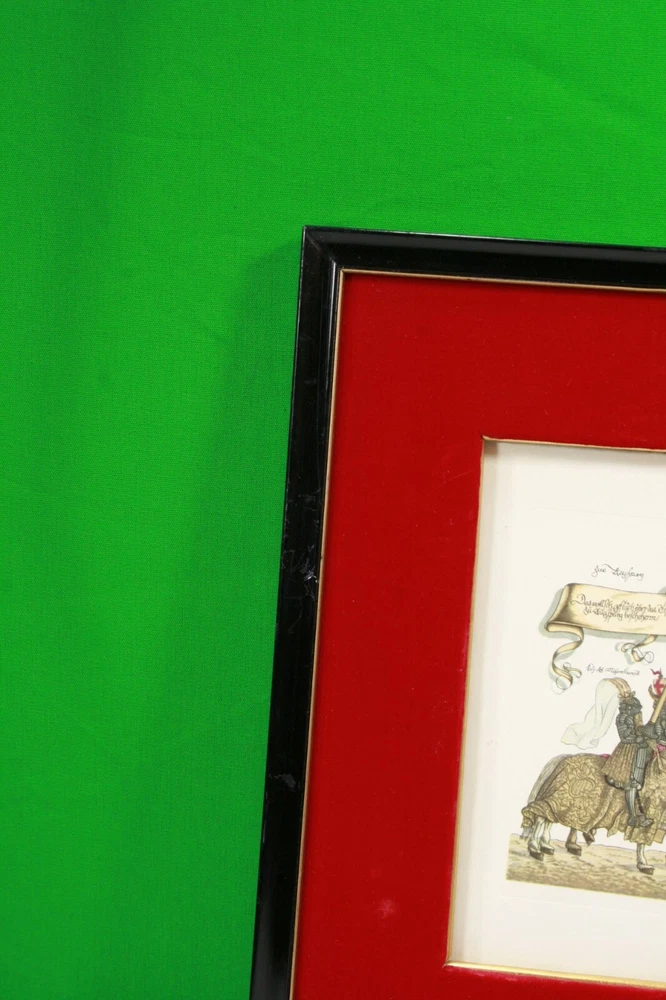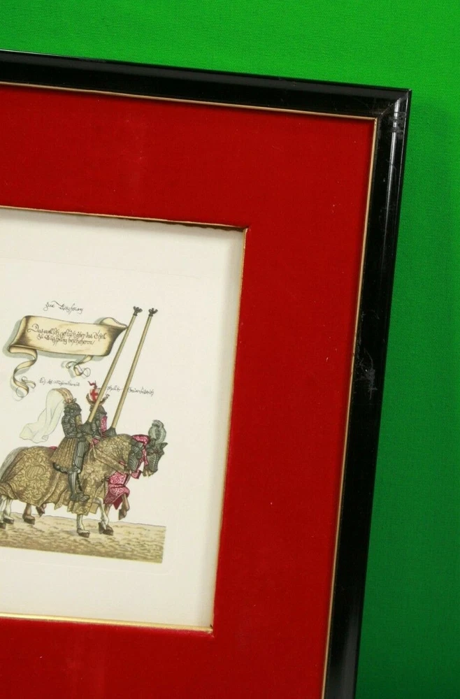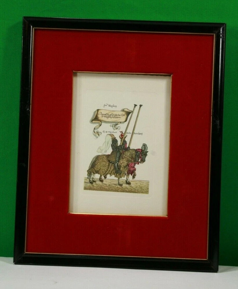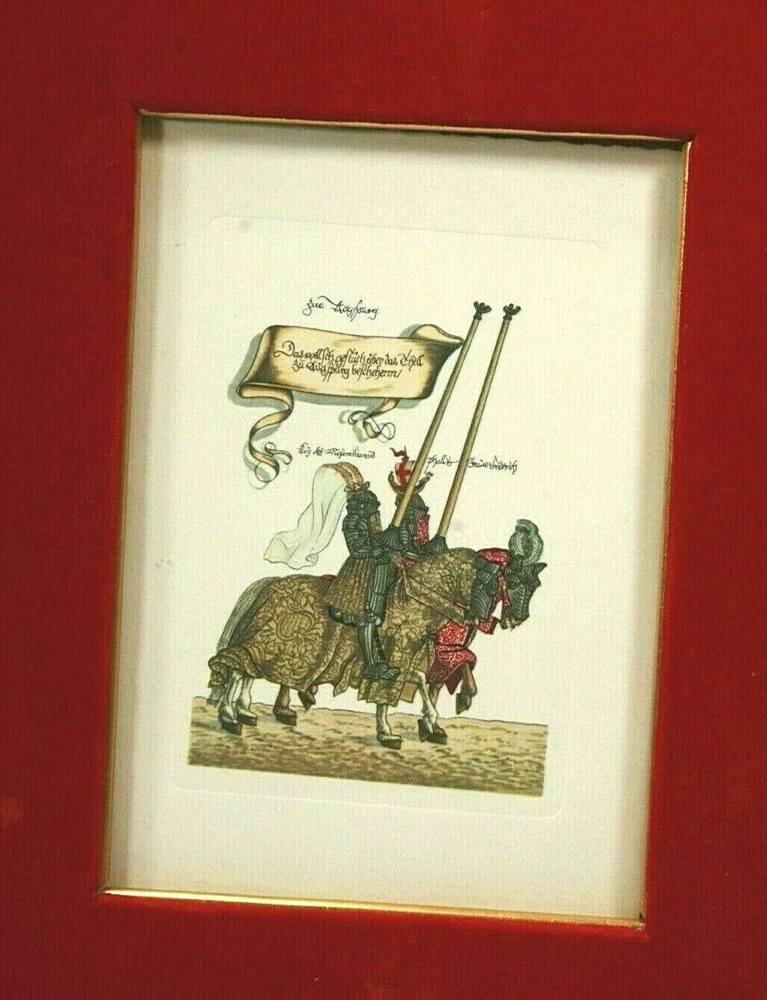 1965 German Ernst Geissendorfer Rothenburg Tauber Germany Based on Series by Hans Burgkmair 'German Knights' 1592 Signs of wear / distress on frame trims Purchased 1965 in Germany Red Velvet Matte Glass Wood Nail Frame Black Paint Card Stock hand-crafted Jousting, Medieval, Horses, Lance, Tournament, German, Knights Hans Burgkmair, Unused Greeting Cards, Handmade Frames, Art Collection