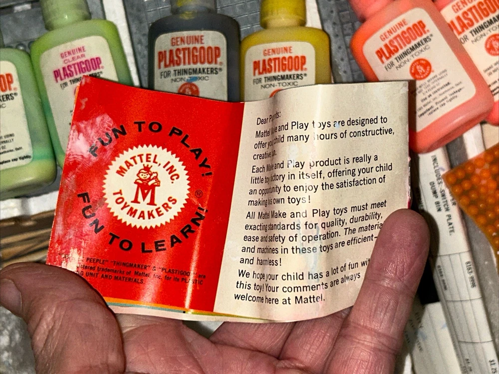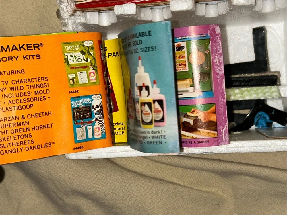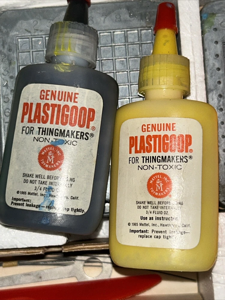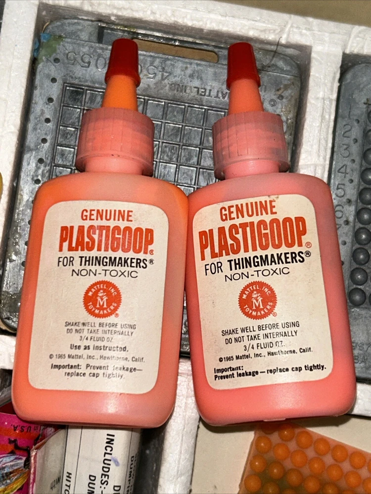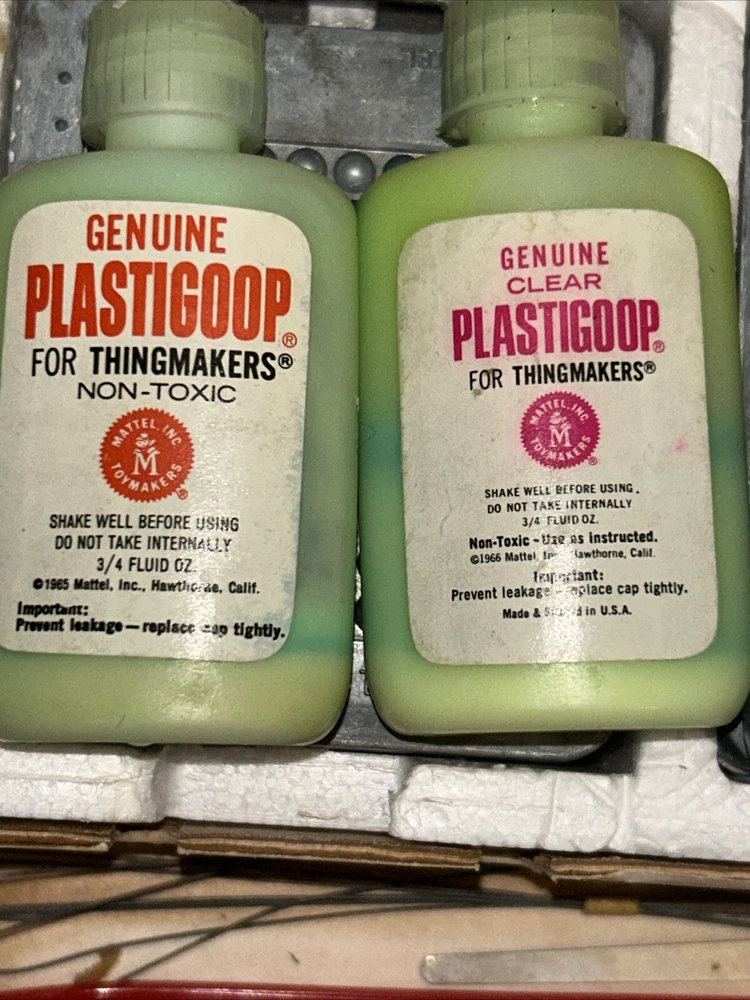 Vintage 1967 Mattel Thingmaker Picadoos Maker Kit in Box with Plastigoop & Molds. Used, includes 6 molds, a couple of tools, wire, and Plasticgoop as seen. All 6 are liquid, not sur how useable, dated 1965 and one dated 1966. Includes cool little catalog, instructions, order form, and patterns as seen. The graph board is stained but I left it in there. The Styrofoam is messy, box lid shows wear, but a nice vintage lot. Please see photos. Please check my other sales.