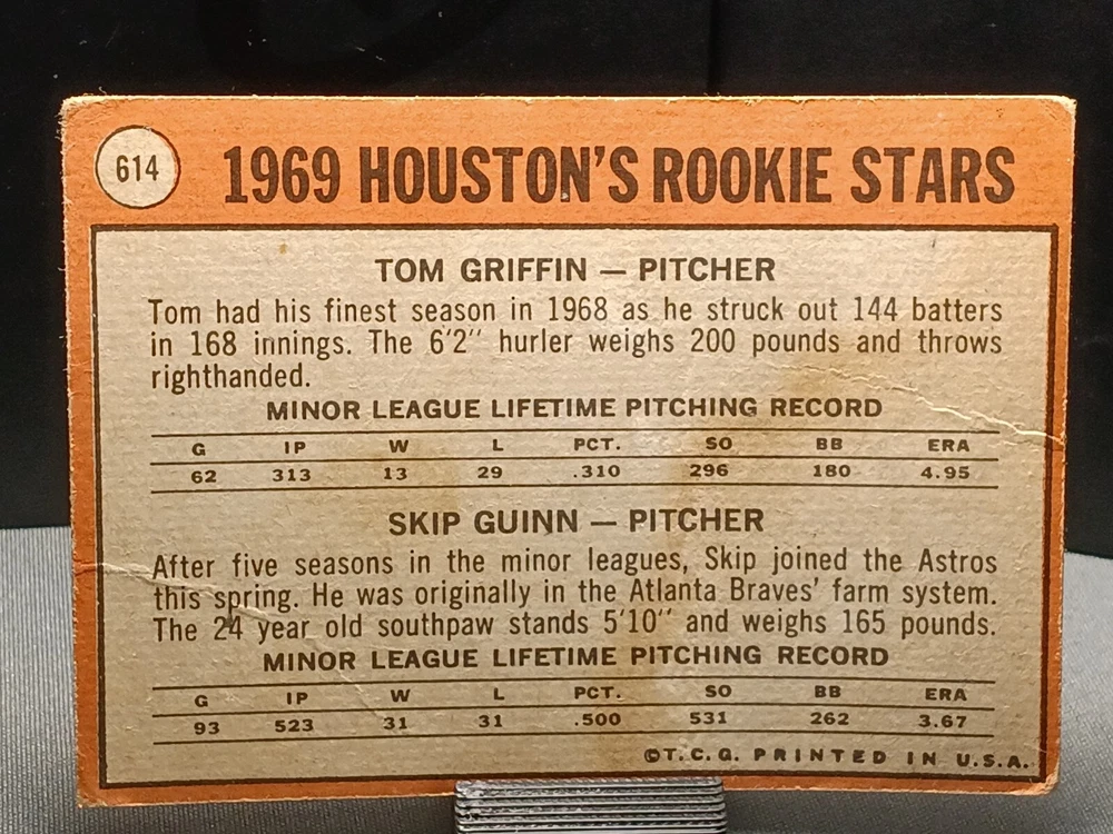 Dive into the nostalgia of America's pastime with the Vintage 1969 Topps Houston Astros Rookie Stars card #614, featuring Tom Griffin and Skip Guinn. A true collector's gem from the iconic 1969 Topps set, this card captures the essence of the era and celebrates the promising talent of the Houston Astros during that season. Crafted in the United States with standard card stock, this piece of baseball history is an original, non-autographed Rookie card with the added appeal of being a high number print run from the base set. It's a must-have for enthusiasts seeking to commemorate the MLB's rich legacy and the storied history of the Houston Astros.