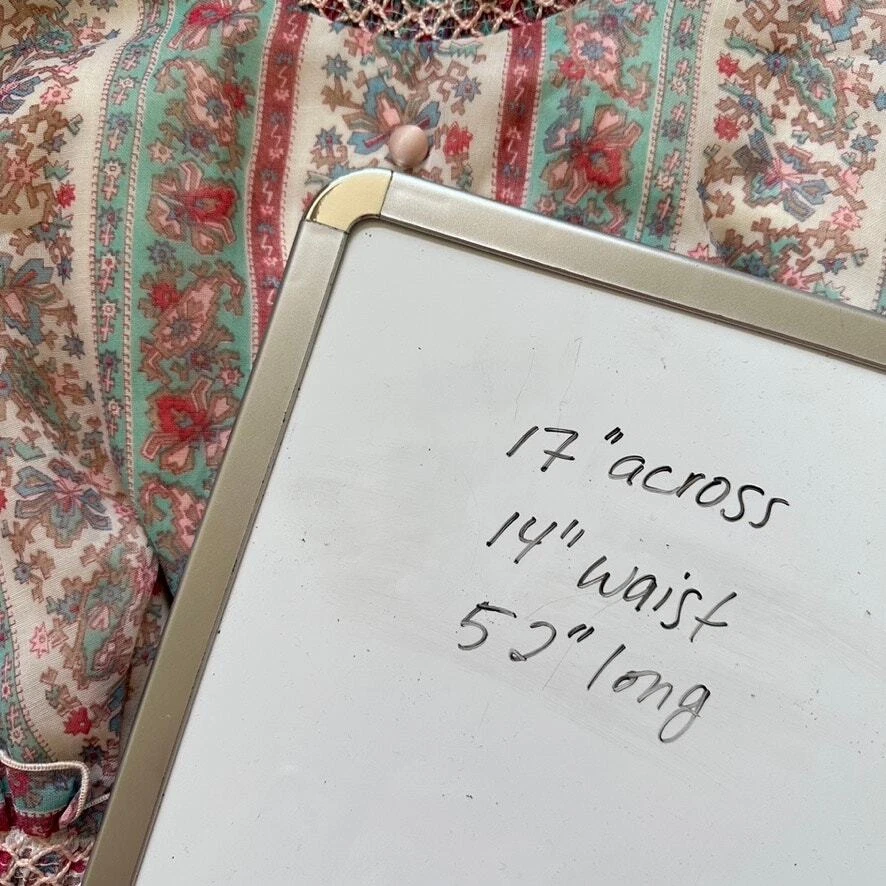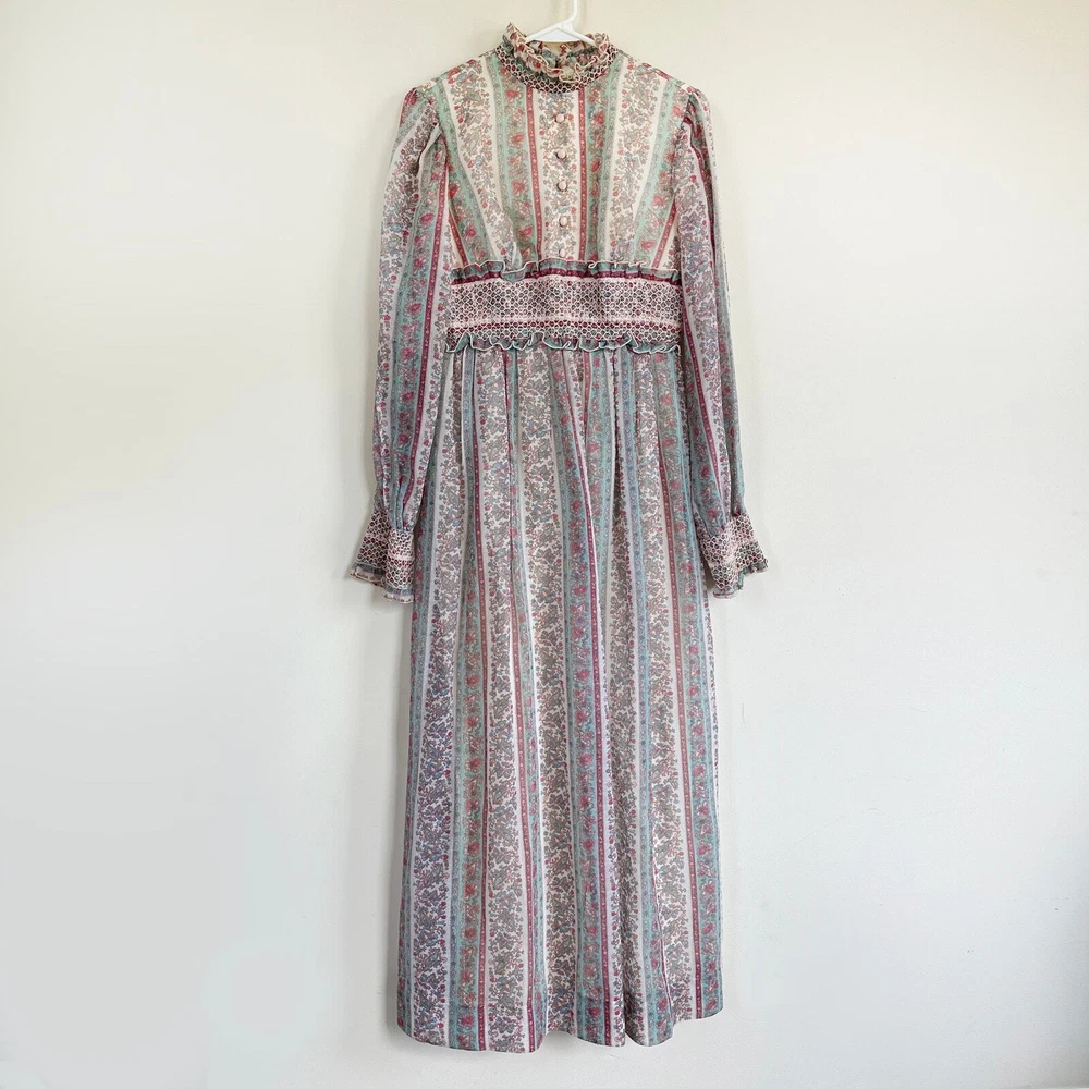 Vintage 1970 Cottagecore Victorian Maxi Dress Prairie Floral Smocked High Neck. Sheer sleeves with smocked detail on the cuffs. Dress is fully lined, except for the sleeves. Metal zipper on the back. Size: NO SIZE TAG. PLEASE SEE MEASUREMENTS TO ENSURE PROPER FIT Approx. measurements: 17" across (pit to pit), 14 waist, 52" long (shoulder to hem) Condition: Pre-owned good. Pre-loved and in gently used condition. Light wear. A few faint stains on the front, just under the chest. Please see all pics for any wear/condition. cottage, cottagecore, prairie, prairiecore, little house on the prairie, florence welch dress, Victoriana, regency, victorian, romantic