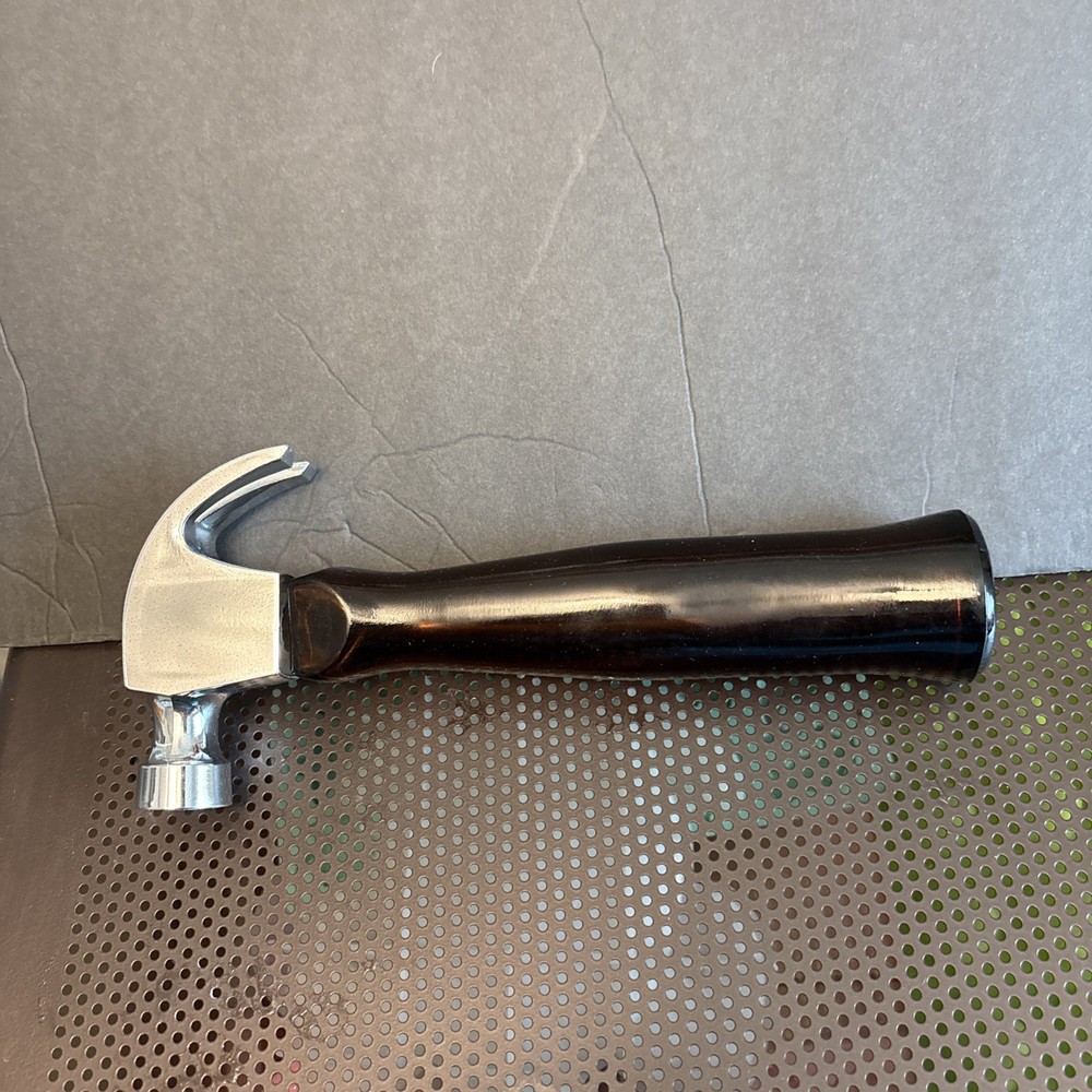 This product is a vintage 1970s Avon cologne decanter bottle in the shape of a hammer. It features a silver and brown color scheme, glass and plastic materials, and a theme of tools. The bottle is 8.5 inches tall with a smooth finish, making it suitable for display on a bathroom dresser or vanity. A unique and stylish collectible item for Father's Day or any occasion.