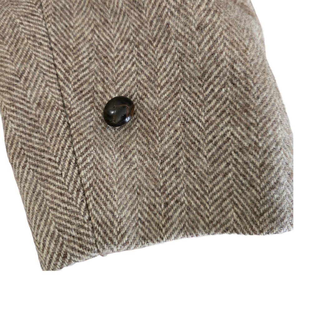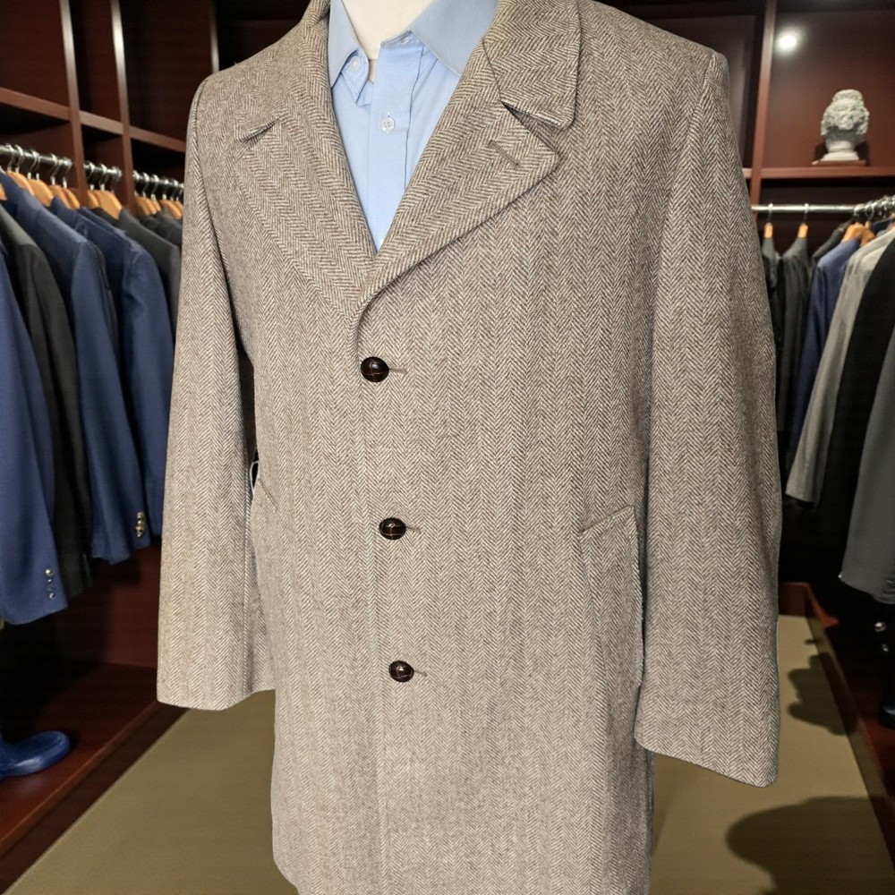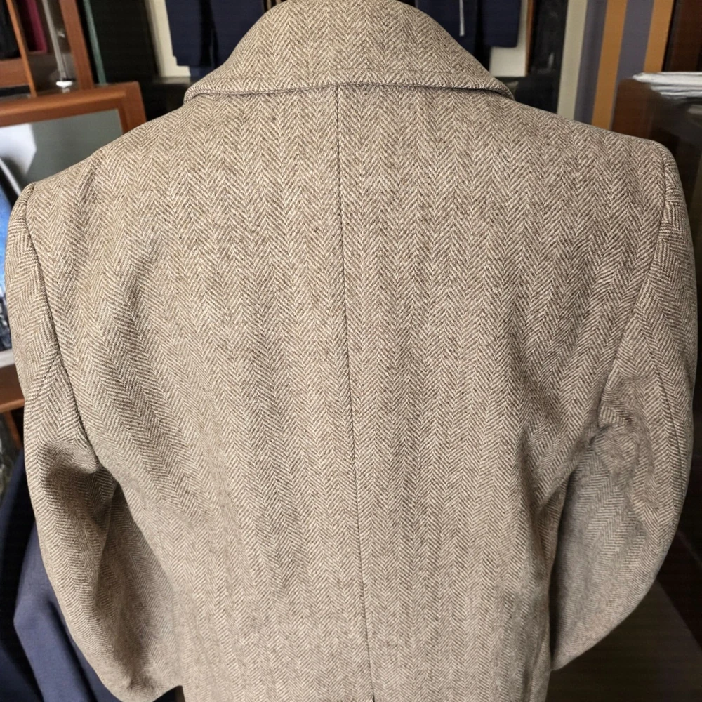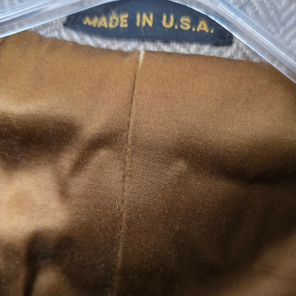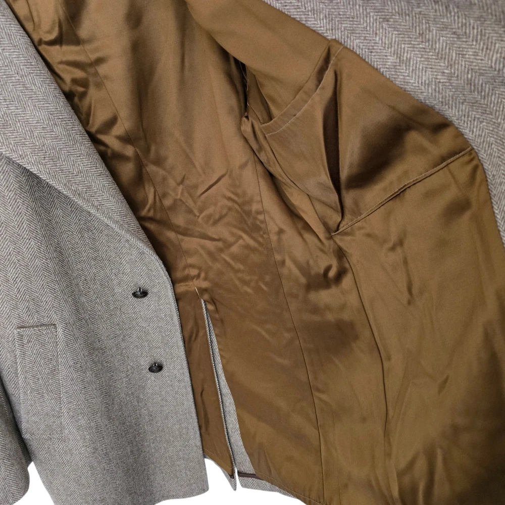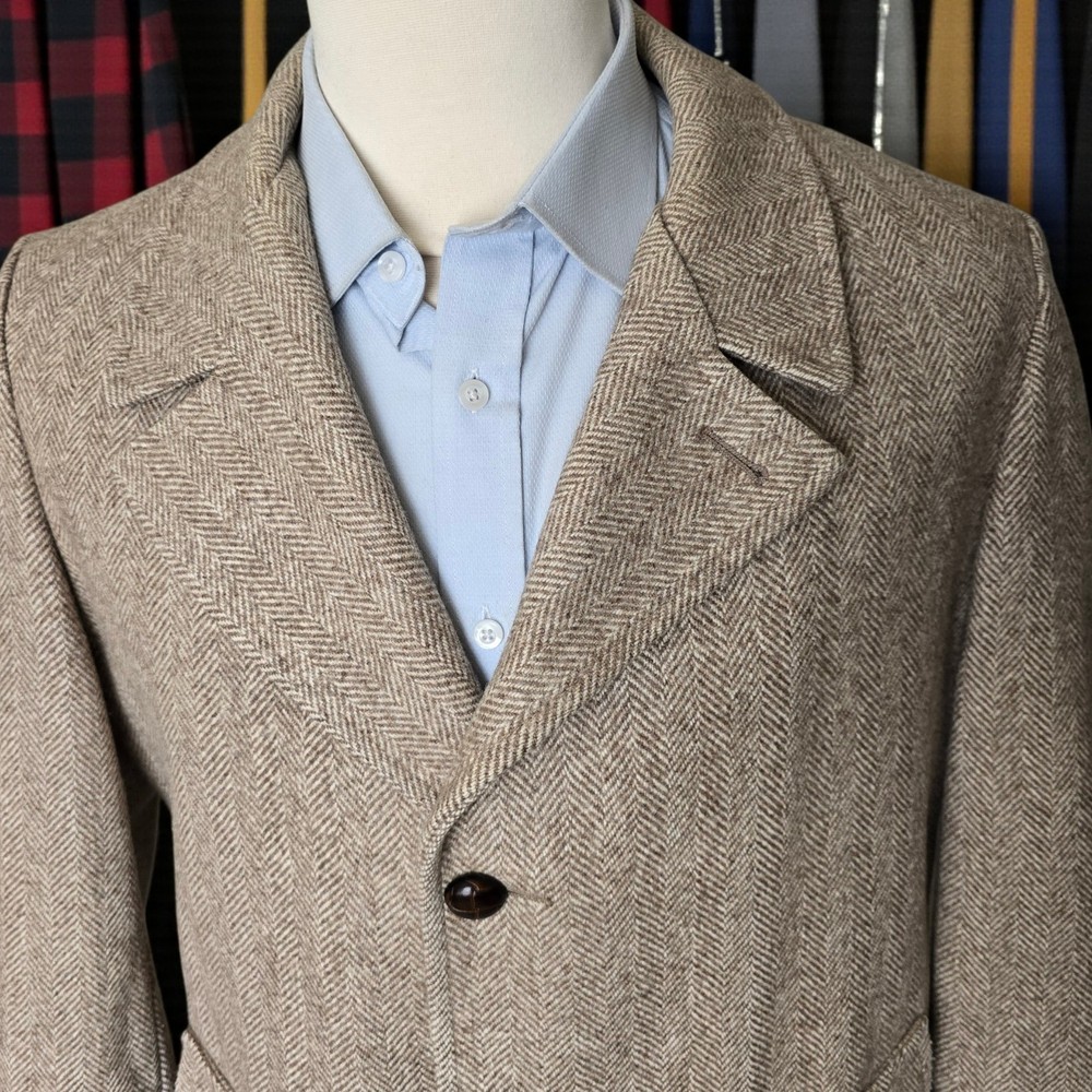 Size: 44r slim fit USA with 25- inch arm length and a jacket length of 36 inches midlength For complete measurements, see photo #2 To see exactly how we measured, see the last series of photos. Color and fabric: brown soft tweed herringbone wool blend Condition: excellent vintage condition. No real flaws were found. No holes. No snags. No smells. No stains Medium weight, soft shoulder, vintage 1970s, 6 inch wide lapel, light brown herringbone, made in USA Return policy: We offer free shipping and no returns. We can not afford to offer both in the highest return category on eBay. It becomes very expensive to mail out items for free for people to try on if they are not confident in checking the measurements in picture #2. If you prefer to have the ability to return the item and pay $15.95 shipping, please send us a message, and we can change the listing format to offer returns. The $15.95 shipping cost would break us out even in the case you needed to return the item.You must contact us before purchasing as some of our items are on consignment and we will need to get the owners approval before proceeding. We ship the next business day after the payment is made. A discounted, expedited shipping option is available at checkout. If you need help figuring out how to buy a blazer or suit on ebay that actually fits you properly. There are some fantastic videos on You tub e