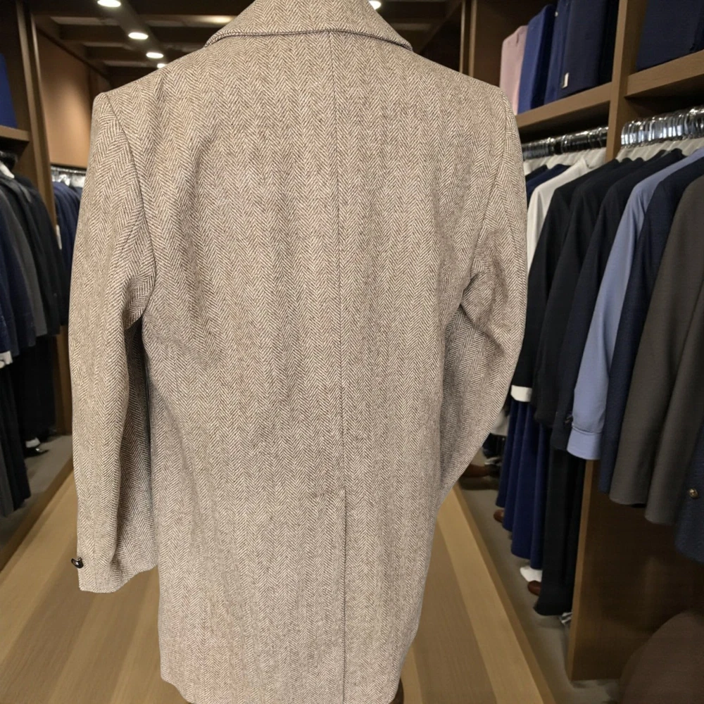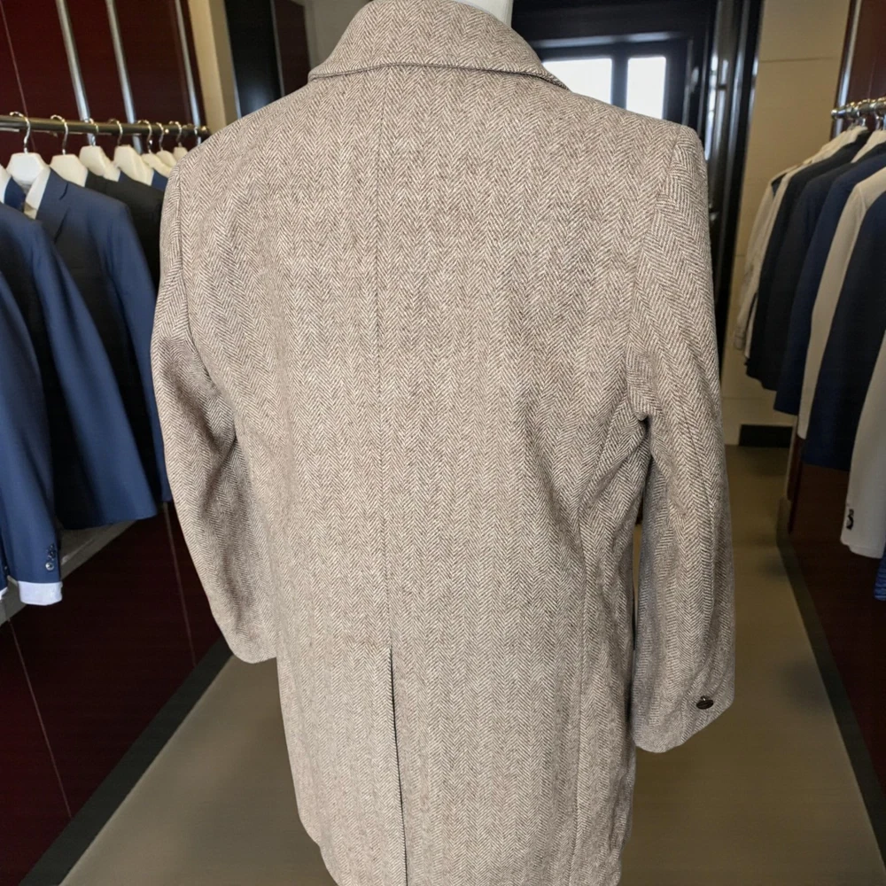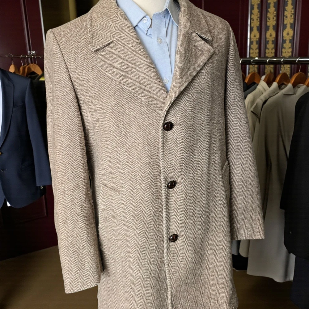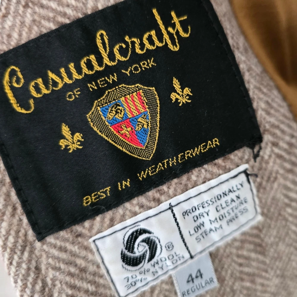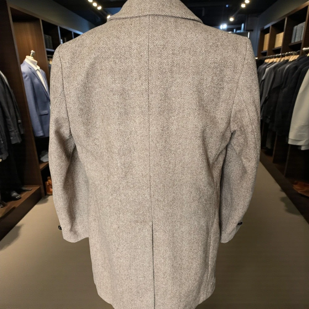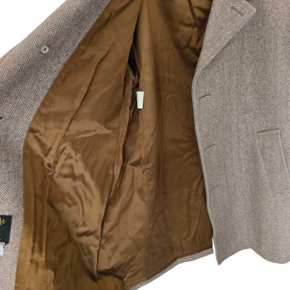 Size: 44r slim fit USA with 25- inch arm length and a jacket length of 36 inches midlength For complete measurements, see photo #2 To see exactly how we measured, see the last series of photos. Color and fabric: brown soft tweed herringbone wool blend Condition: excellent vintage condition. No real flaws were found. No holes. No snags. No smells. No stains Medium weight, soft shoulder, vintage 1970s, 6 inch wide lapel, light brown herringbone, made in USA Return policy: We offer free shipping and no returns. We can not afford to offer both in the highest return category on eBay. It becomes very expensive to mail out items for free for people to try on if they are not confident in checking the measurements in picture #2. If you prefer to have the ability to return the item and pay $15.95 shipping, please send us a message, and we can change the listing format to offer returns. The $15.95 shipping cost would break us out even in the case you needed to return the item.You must contact us before purchasing as some of our items are on consignment and we will need to get the owners approval before proceeding. We ship the next business day after the payment is made. A discounted, expedited shipping option is available at checkout. If you need help figuring out how to buy a blazer or suit on ebay that actually fits you properly. There are some fantastic videos on You tub e