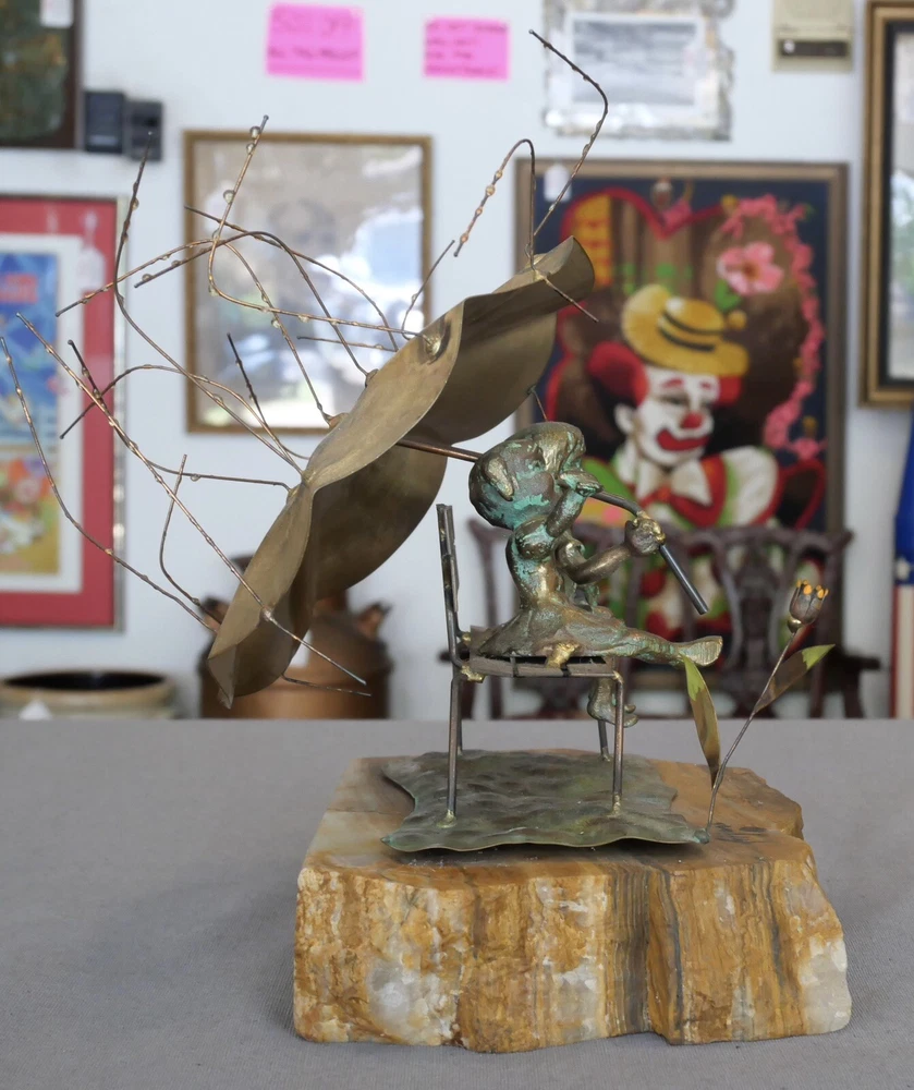 This stunning Brutalist sculpture by Bijan Bahar is a true vintage gem! The mix of bronze, copper, and brass creates a gorgeous textured effect, especially with the raindrop theme. The quartz base adds a touch of natural elegance, and the detailed scene of children under an umbrella is so charming. Perfect condition for its age—would make an eye-catching statement in any home. Love the 70s artistic flair!