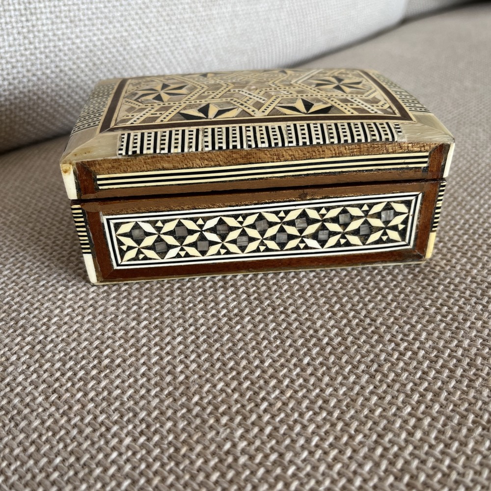 Add a touch of vintage charm to your decor with this exquisite 1970s Egyptian Marquetry Trinket Box. Made with intricate wooden base and lined with red velvet, this medium-sized box features a geometric pattern with mother of pearl inlay, making it a perfect addition to any room. The box is handmade, original and in excellent condition, suitable for all occasions and suitable for furniture. The box measures 6.25 inches in length, 4.25 inches in width and 2.5 inches in height, finished with lacquer and cleaned with a damp cloth. Its unique 1970s style, with a boxing subject and key character, makes it a perfect collectible for art lovers. This keepsake box is a must-have for anyone looking to add a piece of art to their collection.