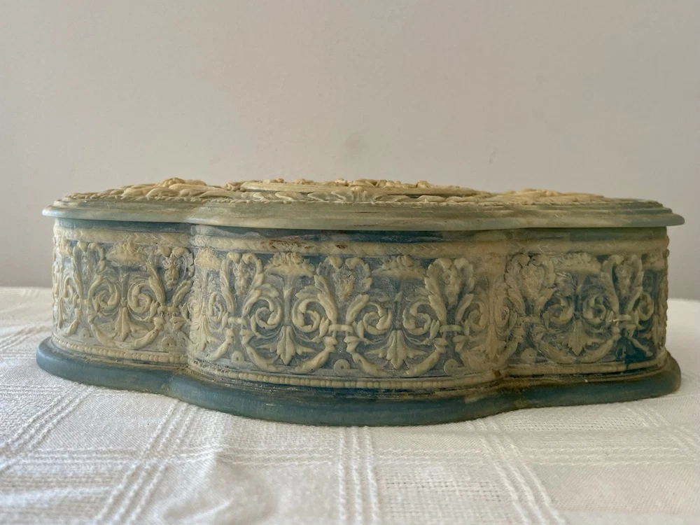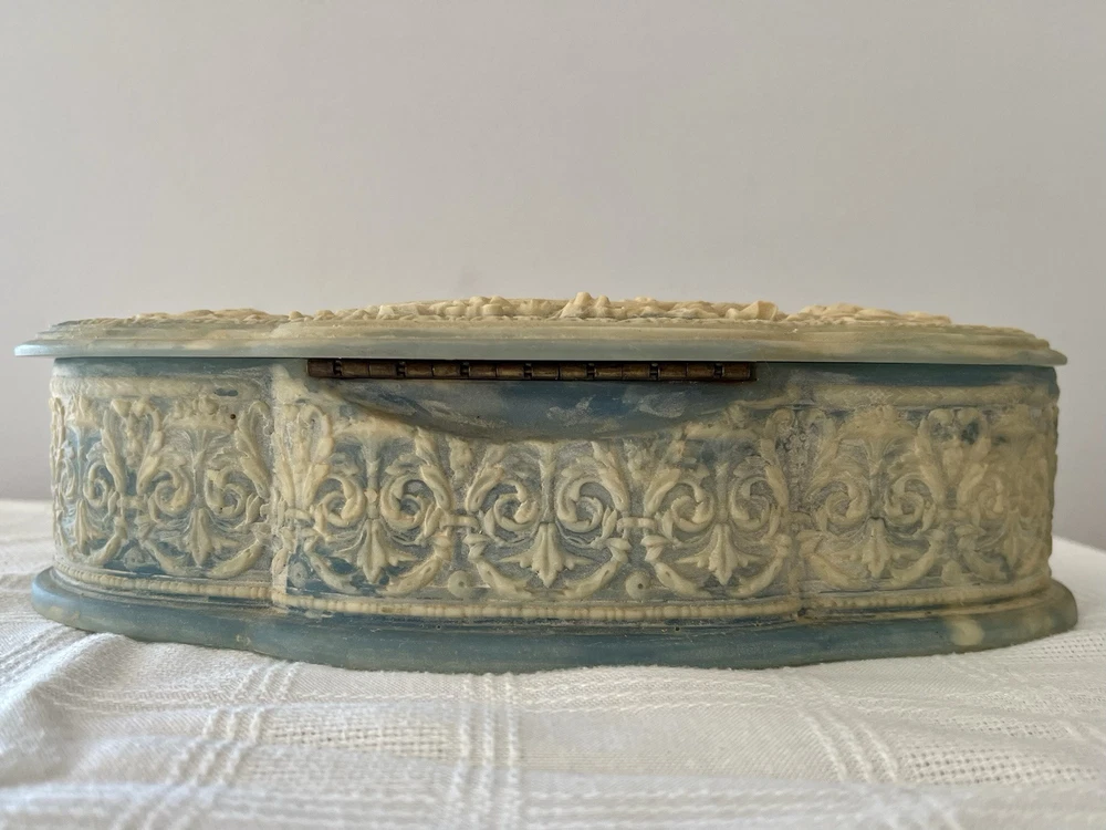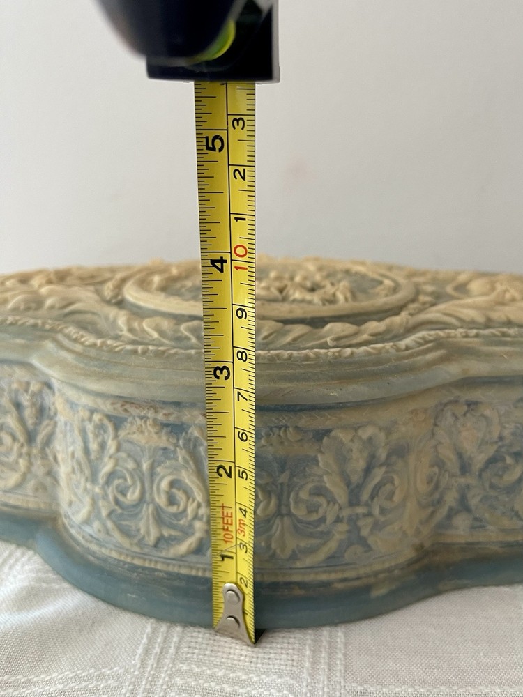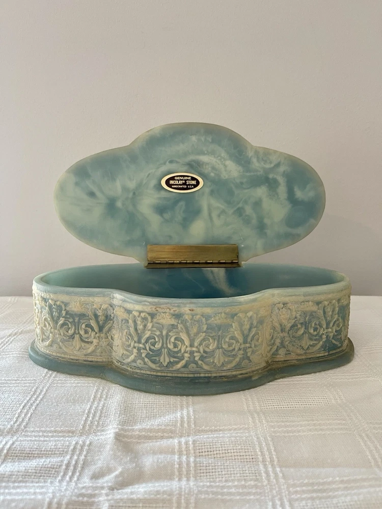 This is a vintage 1970's Incolay stone jewelry box, handcrafted in the United States. The box features a classic asymmetrical shape with a blue color and a pattern of hand-carved Victorian people. It is medium-sized at approximately 11 inches in length, 4 inches in width, and 3 inches in height, weighing about 4 pounds. The box is suitable for all occasions and suitable for adults and teens, making it a versatile piece for any room in the home. The unique handmade design and original style add to its charm as a decorative collectible item.