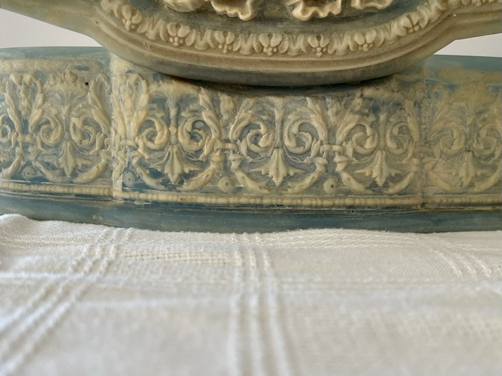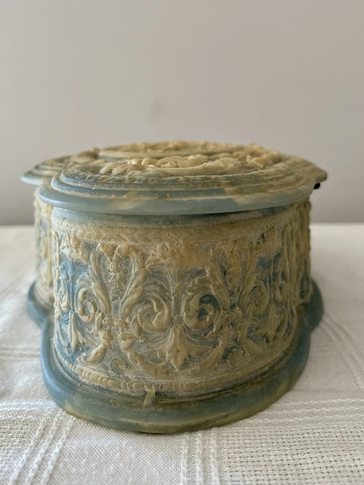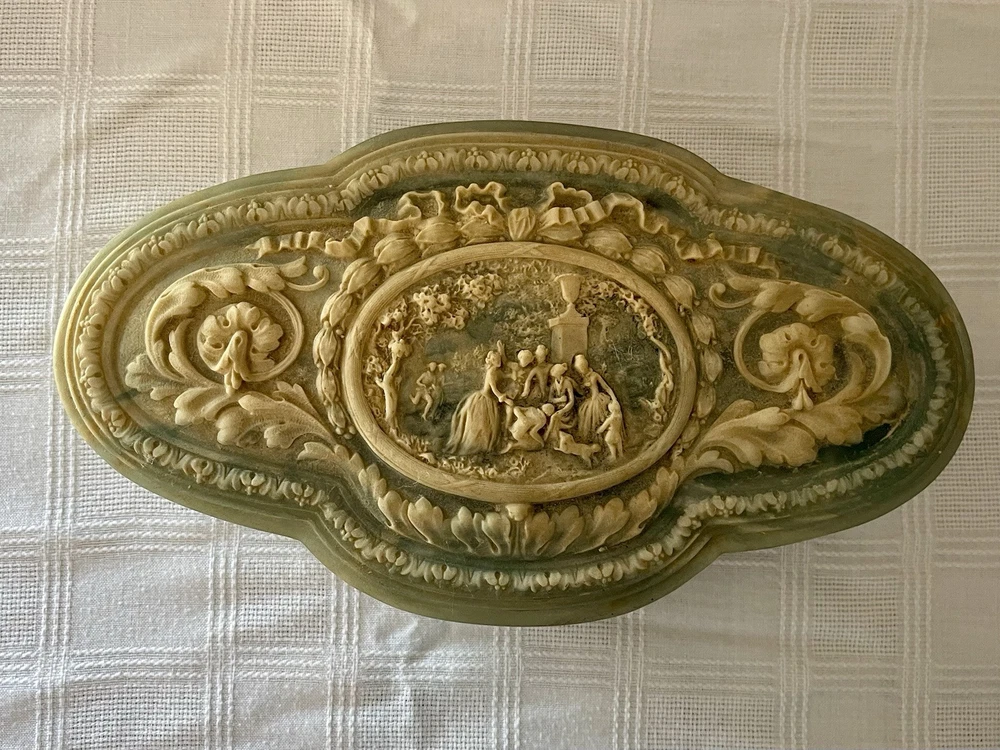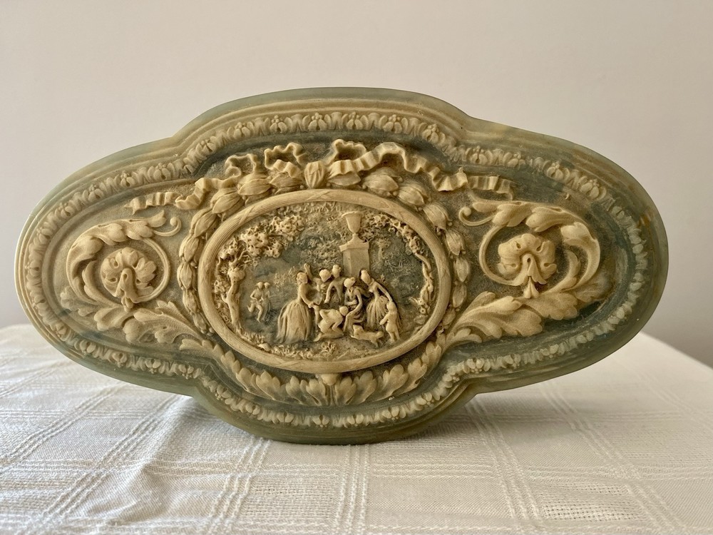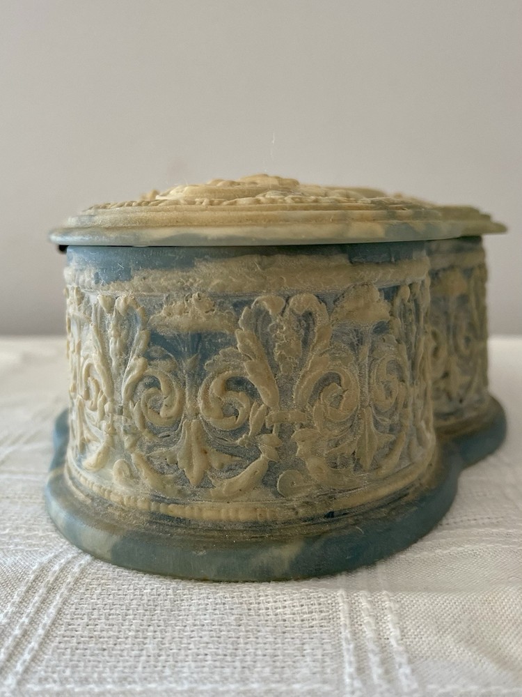 This is a vintage 1970's Incolay stone jewelry box, handcrafted in the United States. The box features a classic asymmetrical shape with a blue color and a pattern of hand-carved Victorian people. It is medium-sized at approximately 11 inches in length, 4 inches in width, and 3 inches in height, weighing about 4 pounds. The box is suitable for all occasions and suitable for adults and teens, making it a versatile piece for any room in the home. The unique handmade design and original style add to its charm as a decorative collectible item.