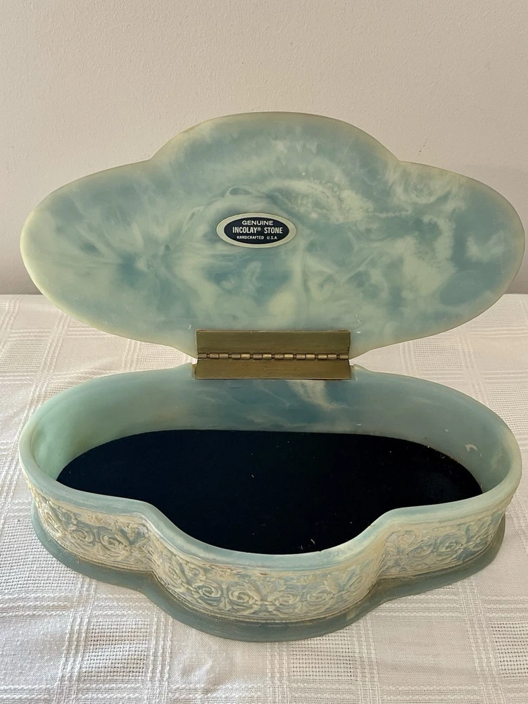 Shape: Asymmetrical Occasion: All Occasions Material: Stone Item Height: 3” Character: people Department: Adults, Teens Featured Refinements: Incolay Box Country of Origin: United States Brand: Art Gifts Color: Blue Suitable For: Furniture Style: 1970s Theme: classic Item Length: 11 in Character Family: n/a Original/Reproduction: Original Year Manufactured: 1970 Customized: No Number in Pack: 1 Custom Bundle: No Type: Jewelry Box Features: Boxed Item Width: 4” Room: Any Room Item Weight: 5 lb Pattern: people Time Period Manufactured: 1970-1979 Collection: people Handmade: Yes Production Technique: n/a Size: Medium Subject: Boxing Packaging: Unboxed